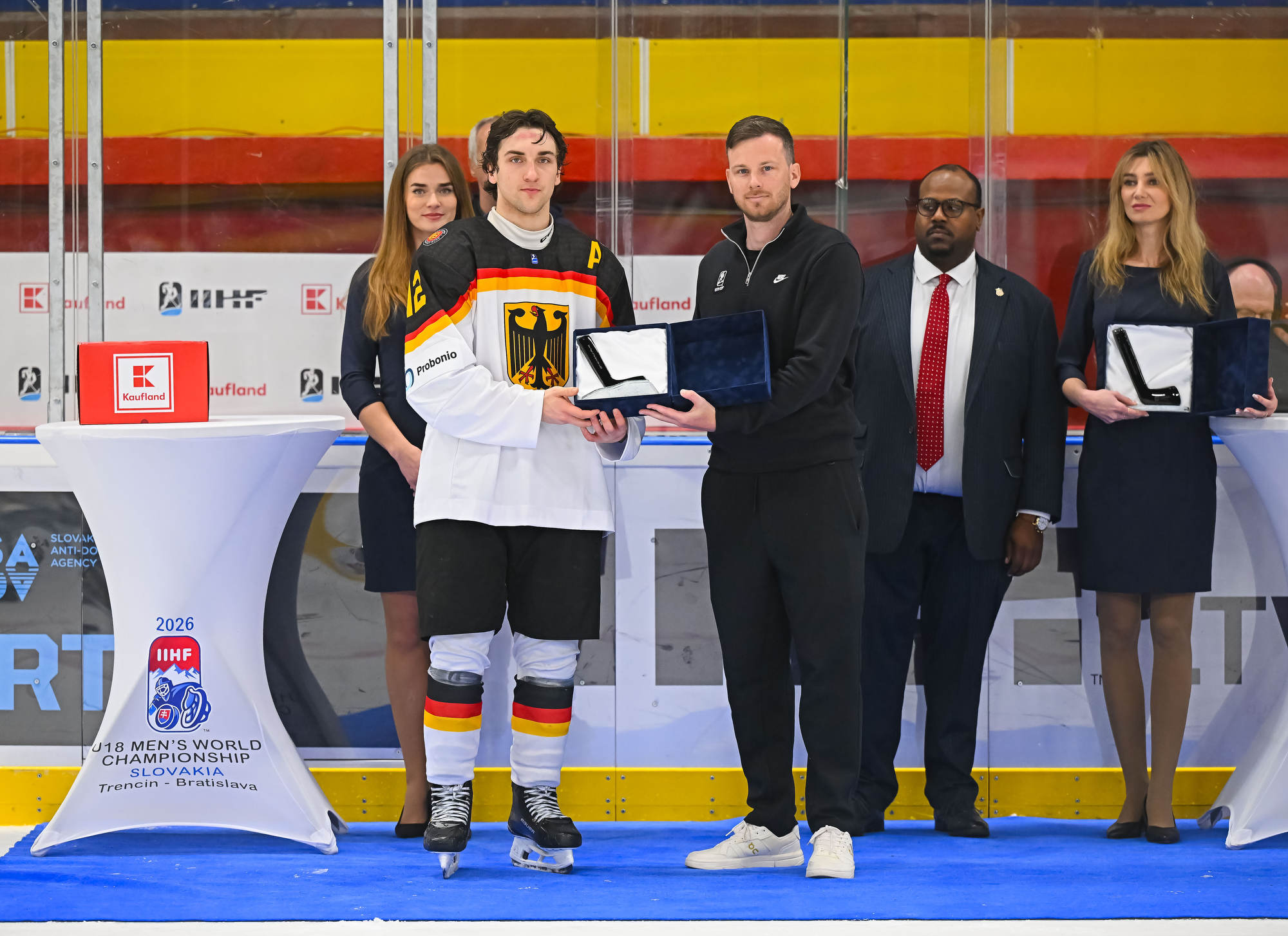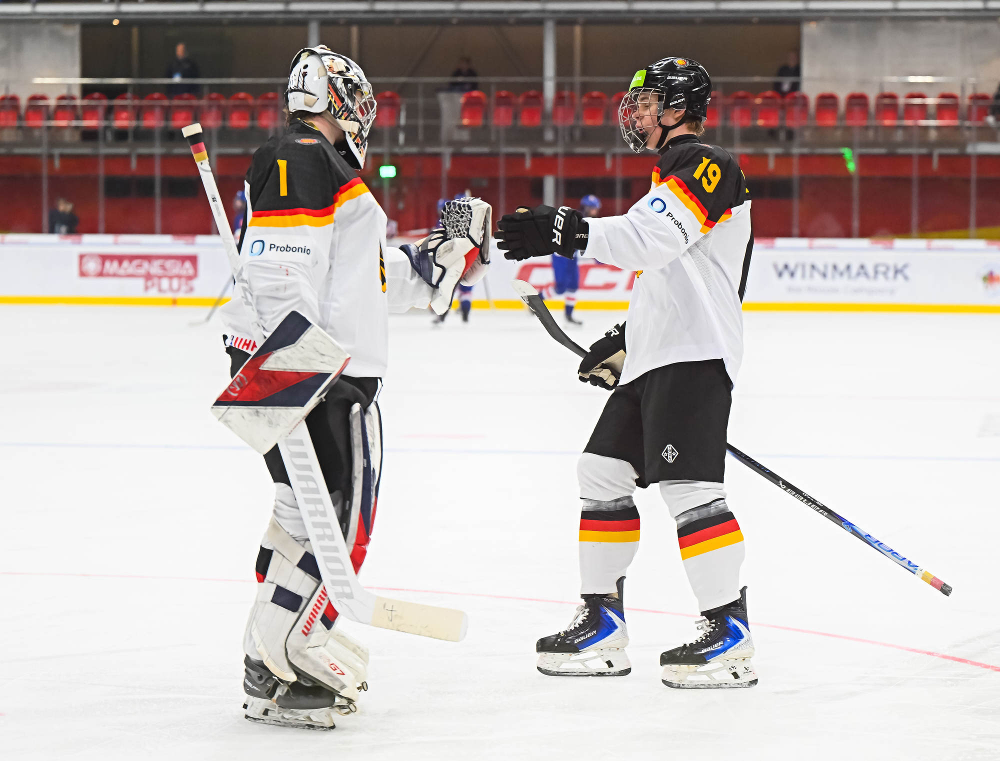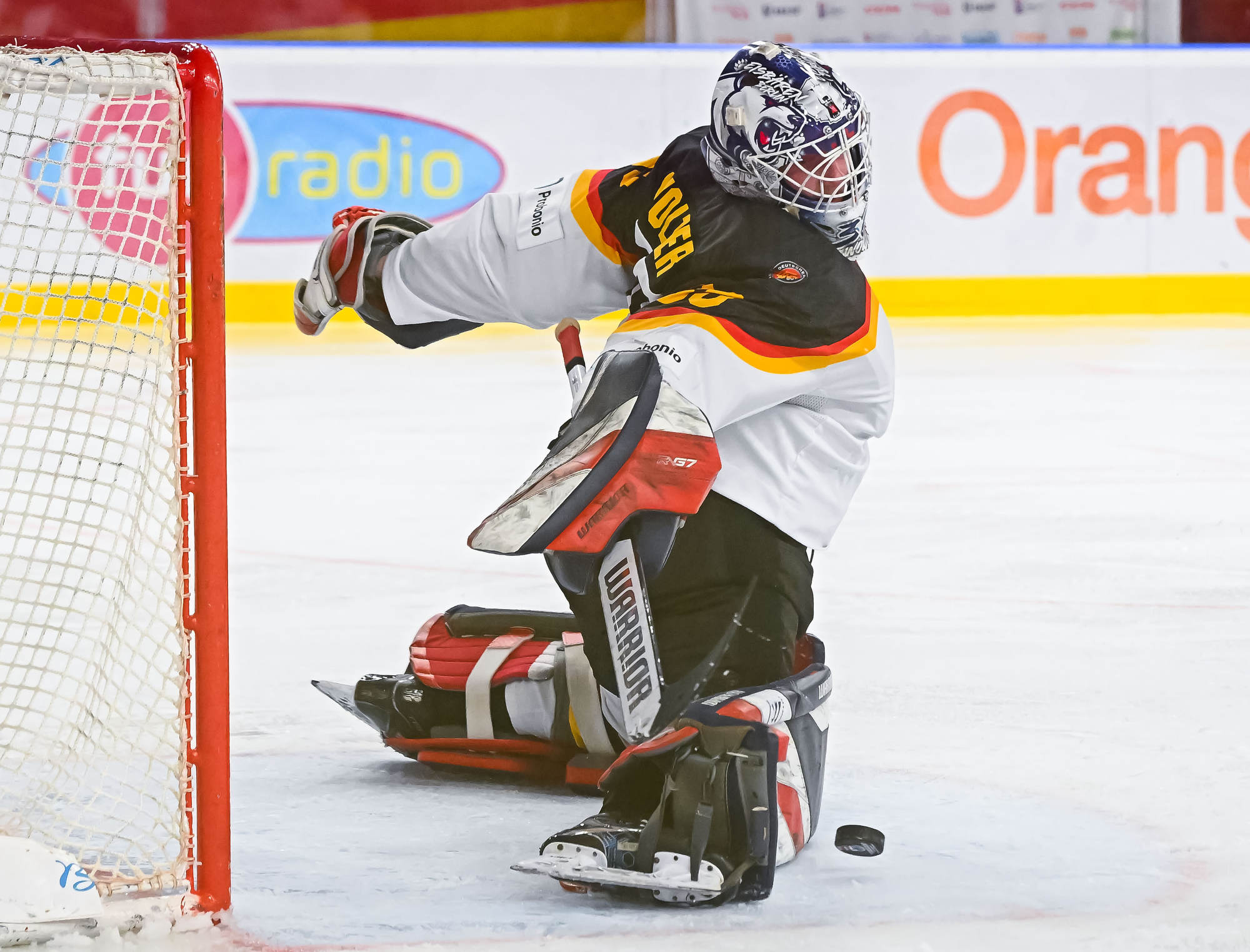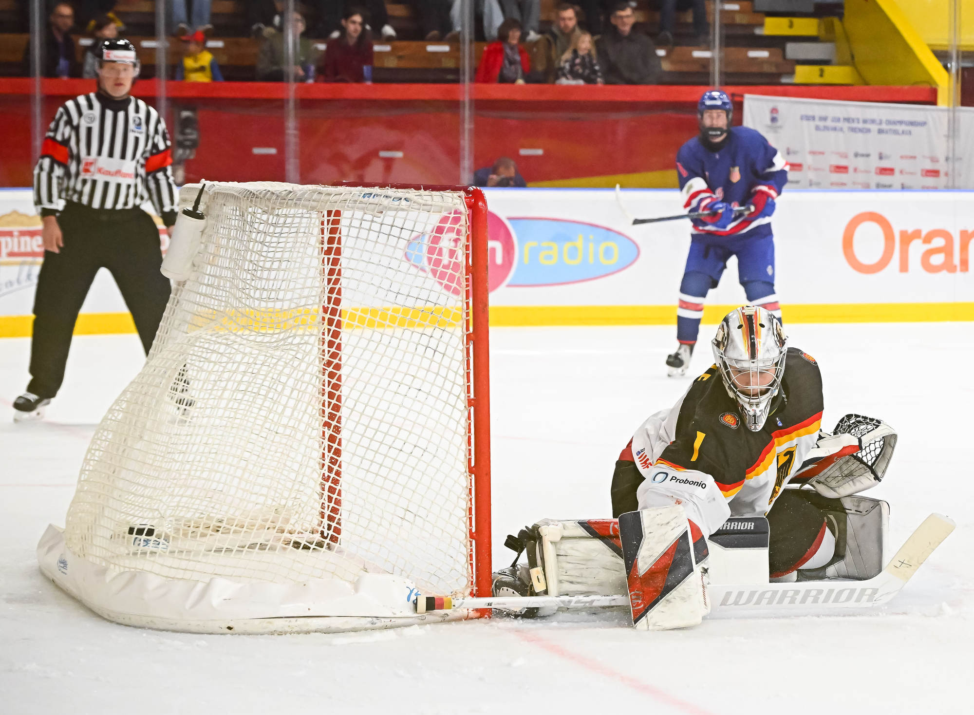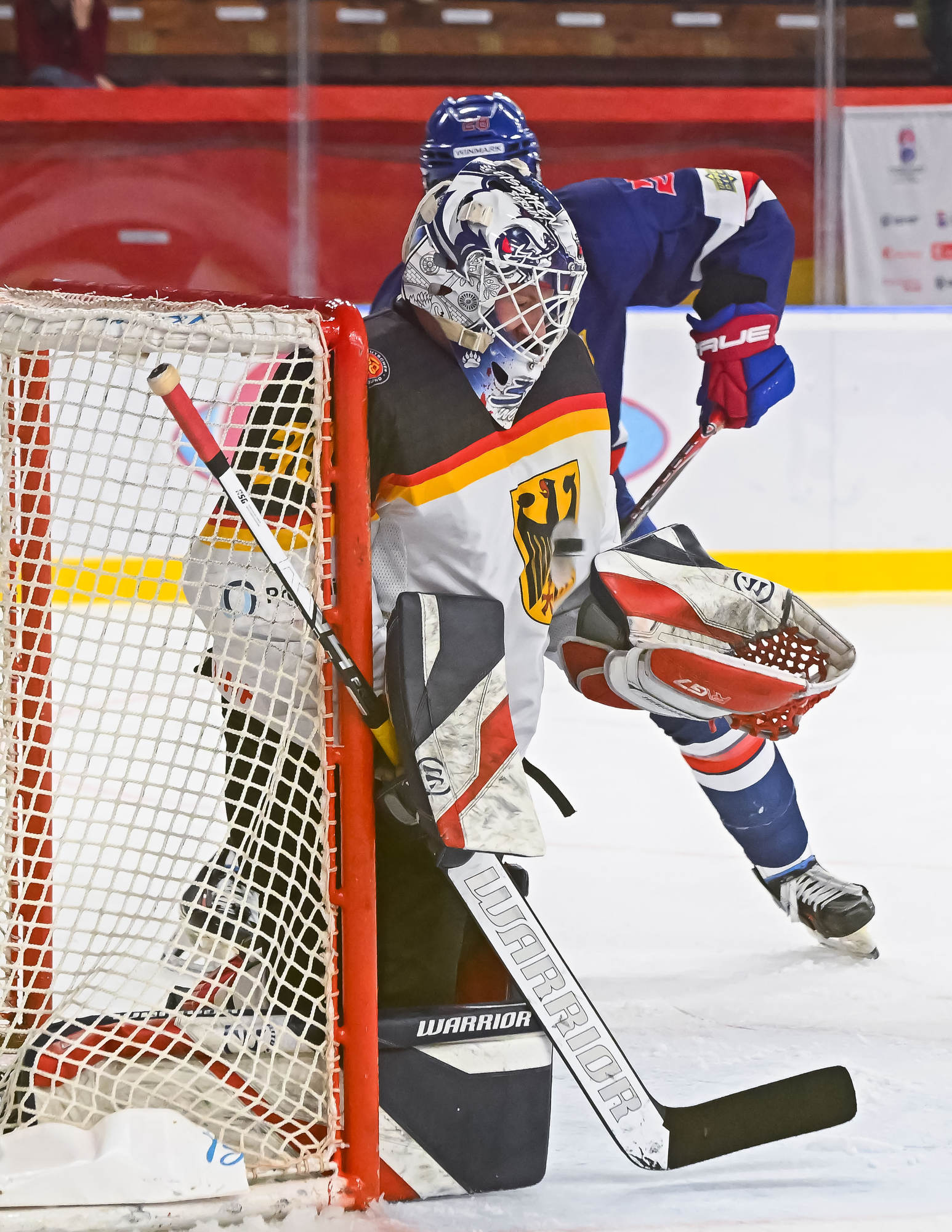 With the score 10-1 with 13:14 remaining in the third period, the German power play struck for the second time. Carrithers stopped Darian Rolsing’s shot from the point, but Luis Becker was in position to put in the rebound.