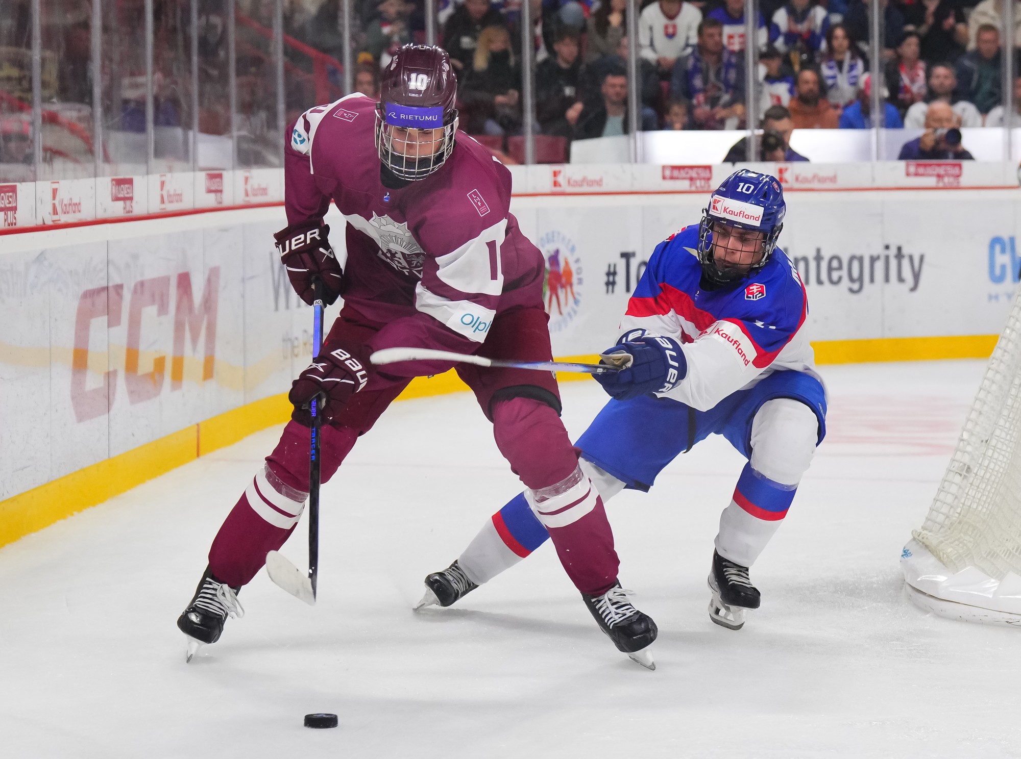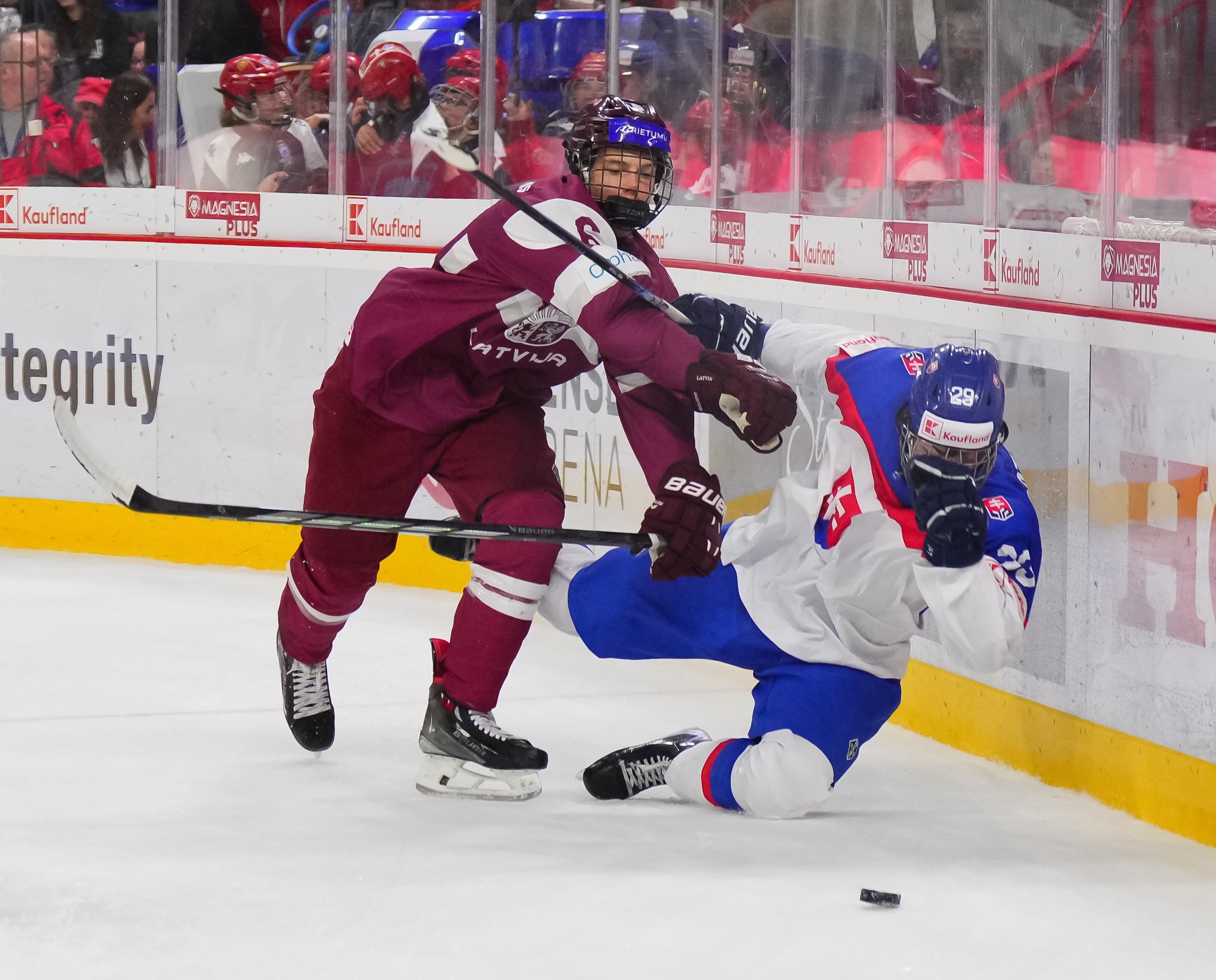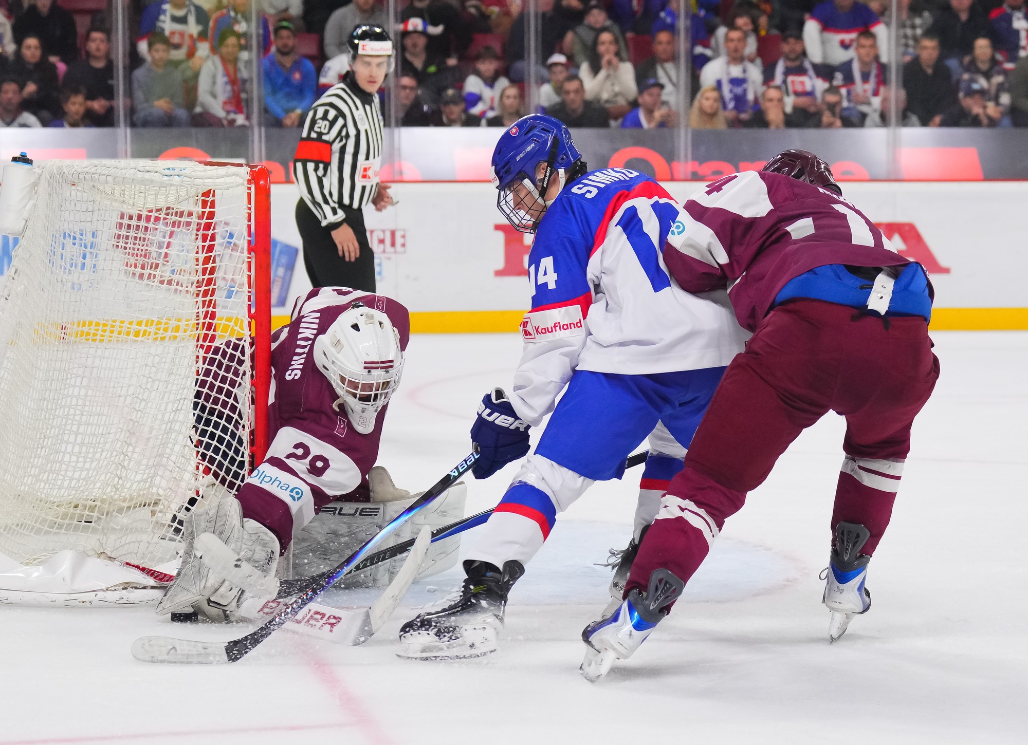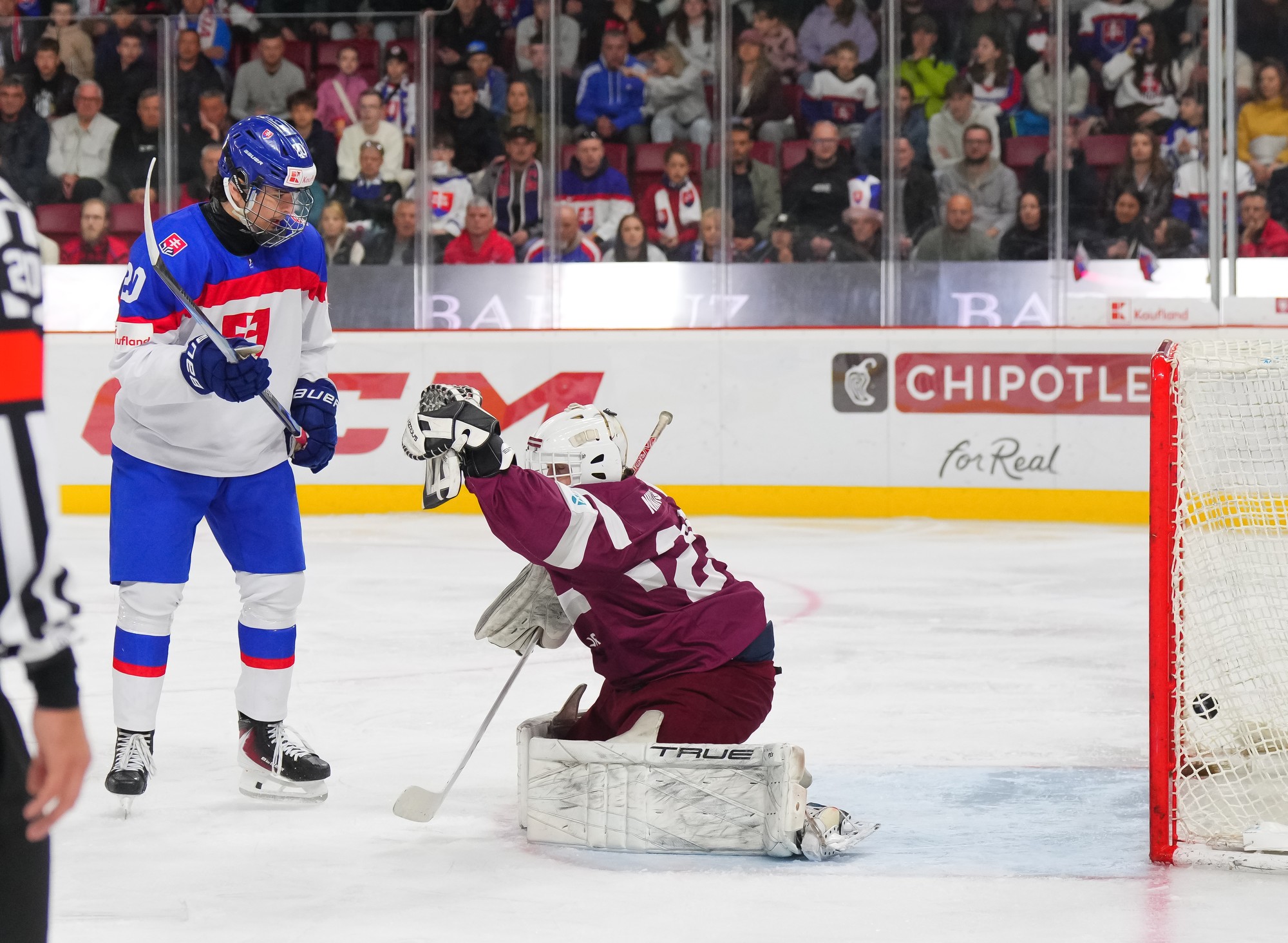 Kristers Obuks scored late in the first period for Latvia, making a game of it until Slovakia took it away early in the third.