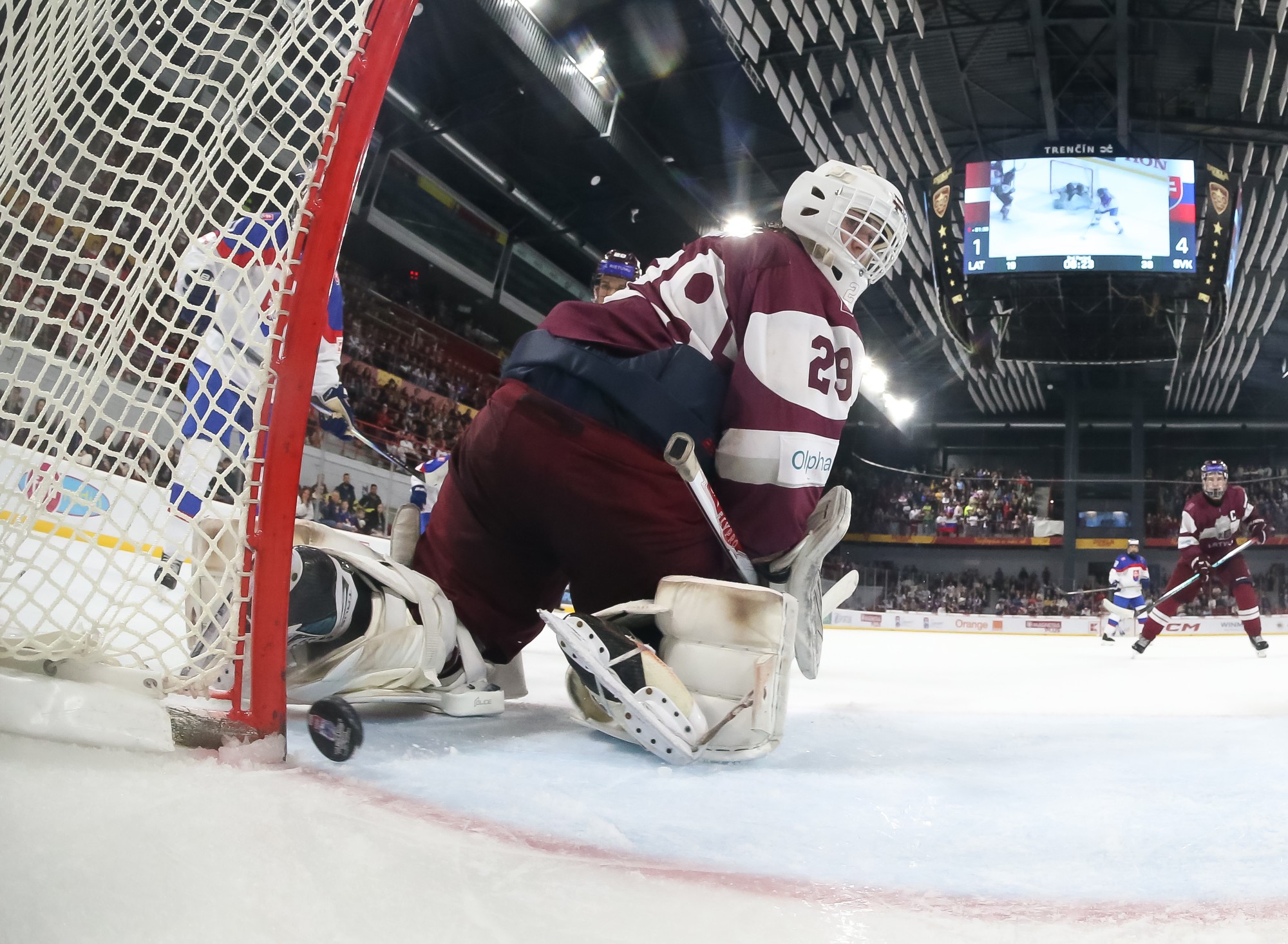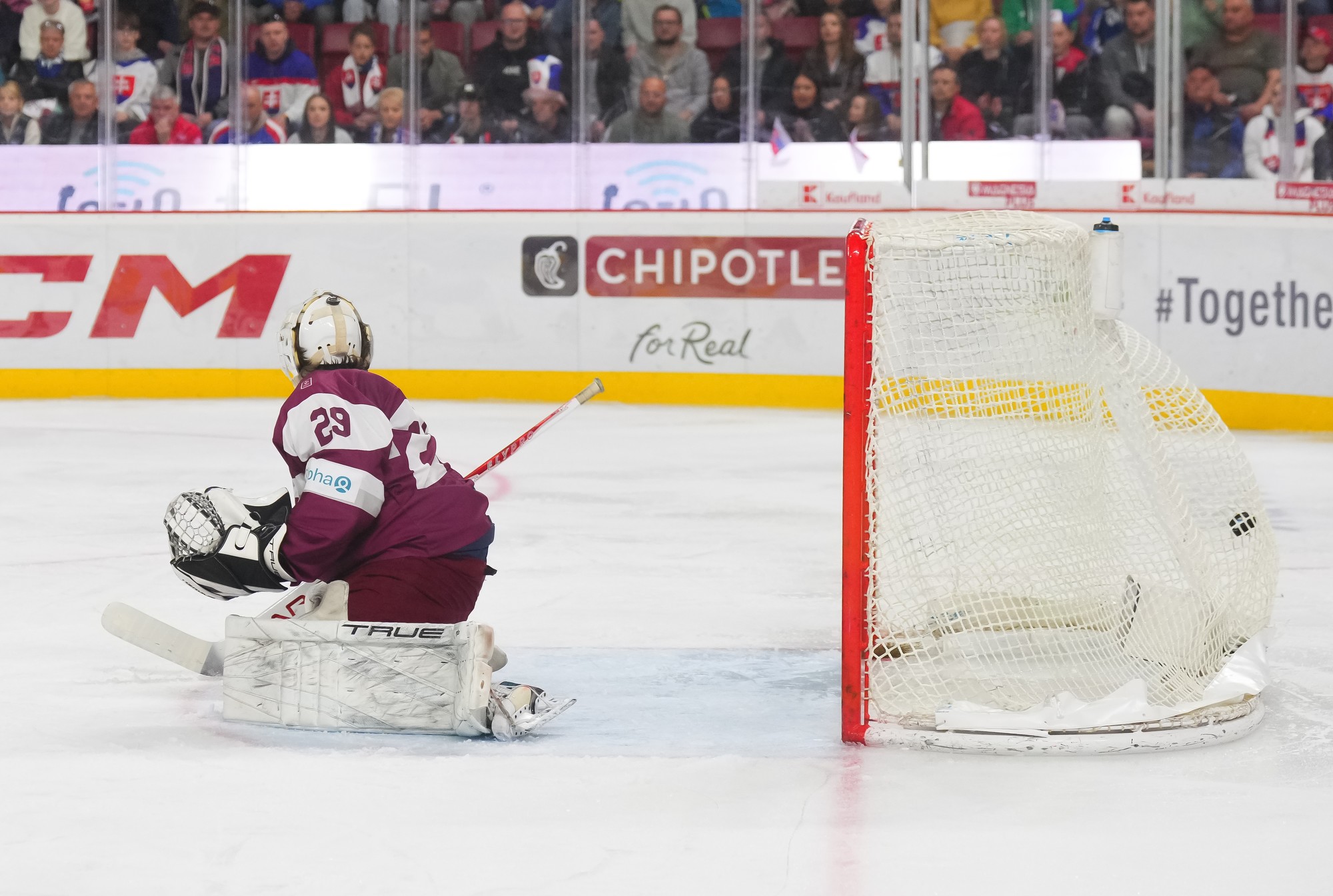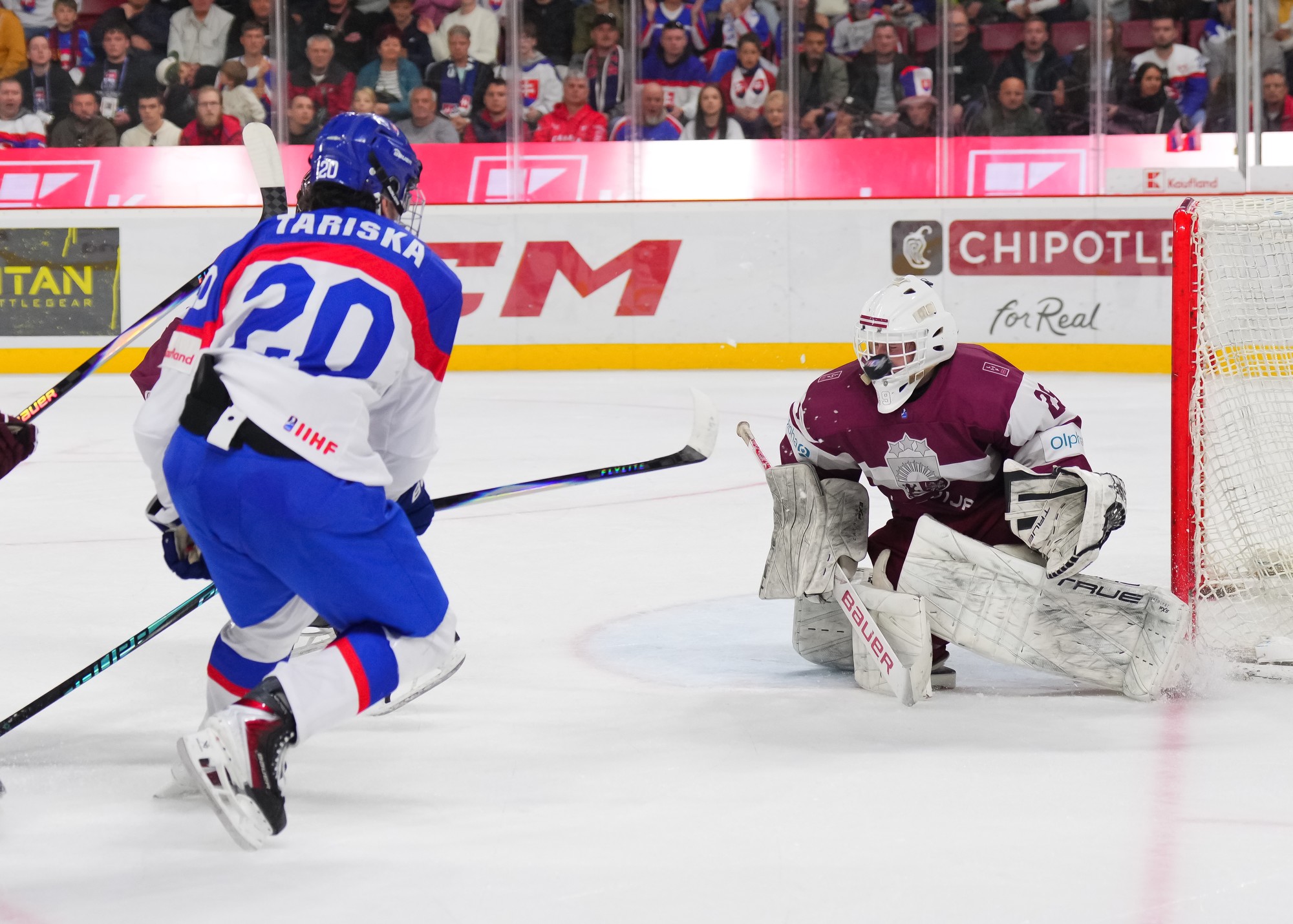 First Slovakia’s Bernat raced clear on a breakaway. His advance was halted by Ricards Lisovskis, whose stretch pass sent Obuks clear of the defence. With Filip Kovalcik desperately trying to catch the forward, Hrenak pulled off a save that had his hometown crowd singing his name.