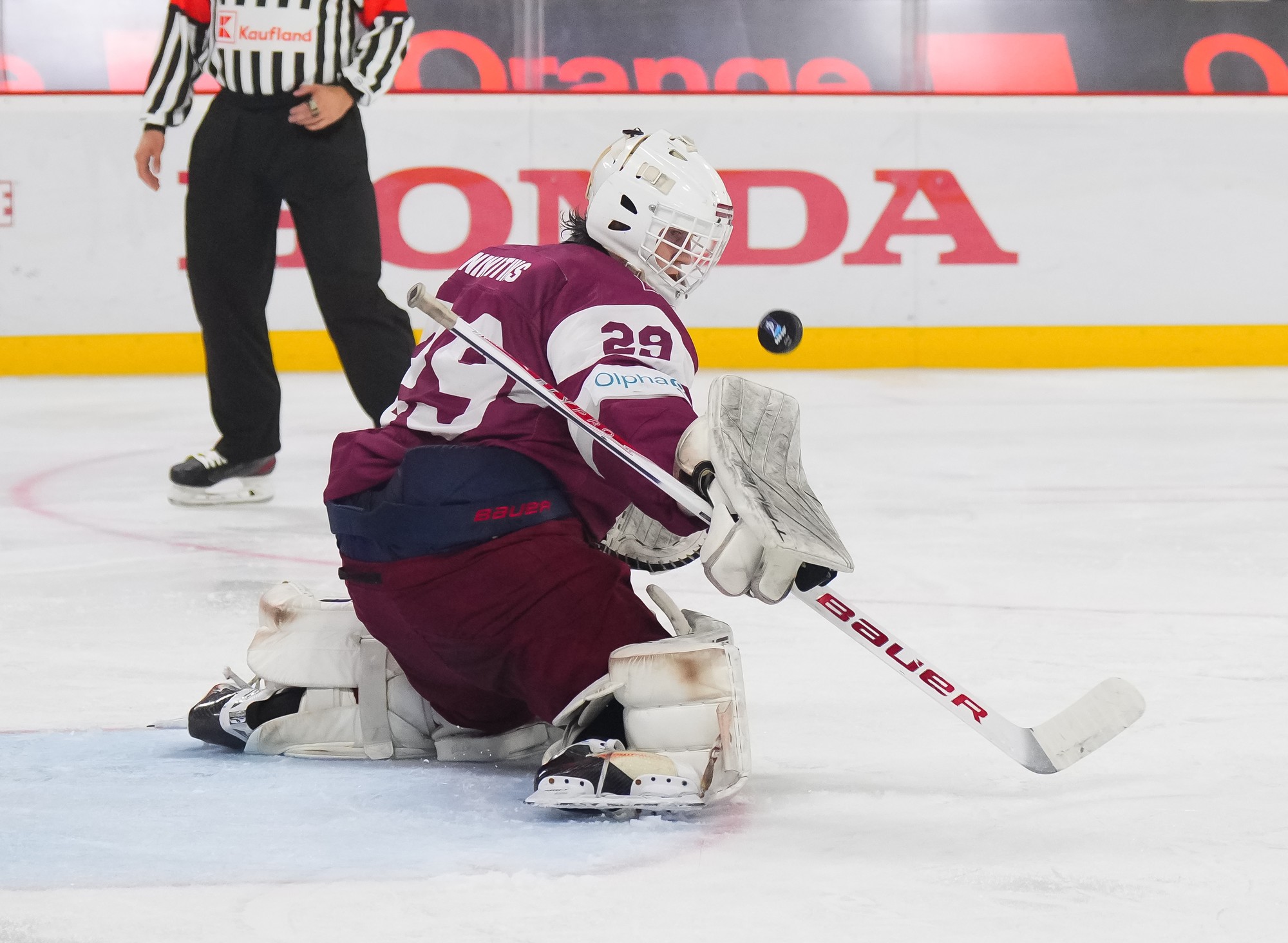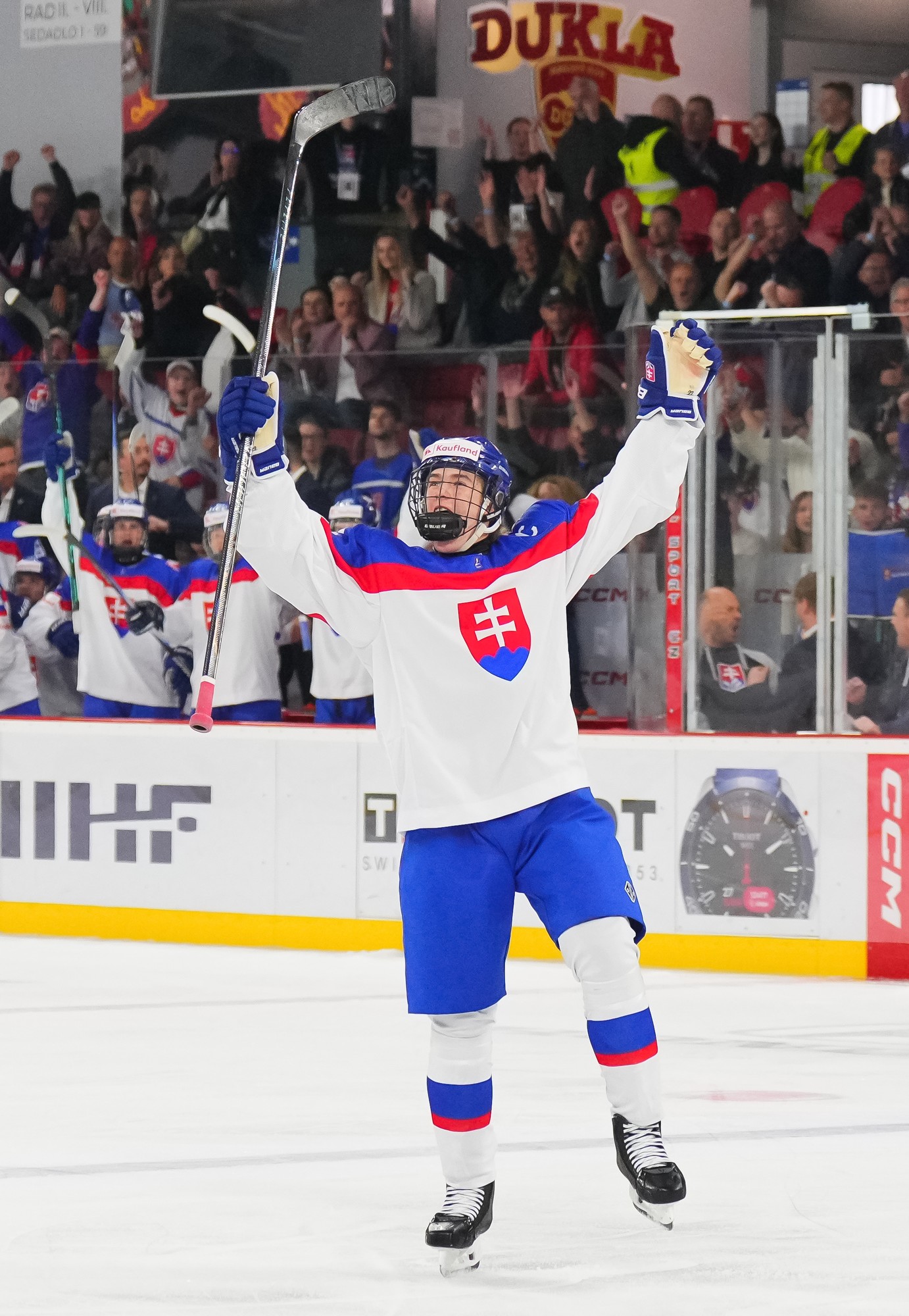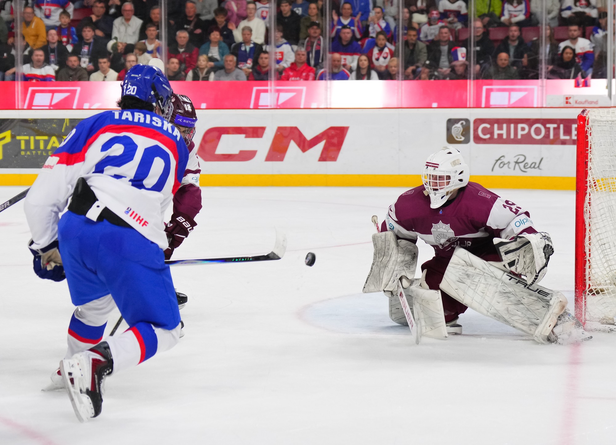 First Slovakia’s Bernat raced clear on a breakaway. His advance was halted by Ricards Lisovskis, whose stretch pass sent Obuks clear of the defence. With Filip Kovalcik desperately trying to catch the forward, Hrenak pulled off a save that had his hometown crowd singing his name.
