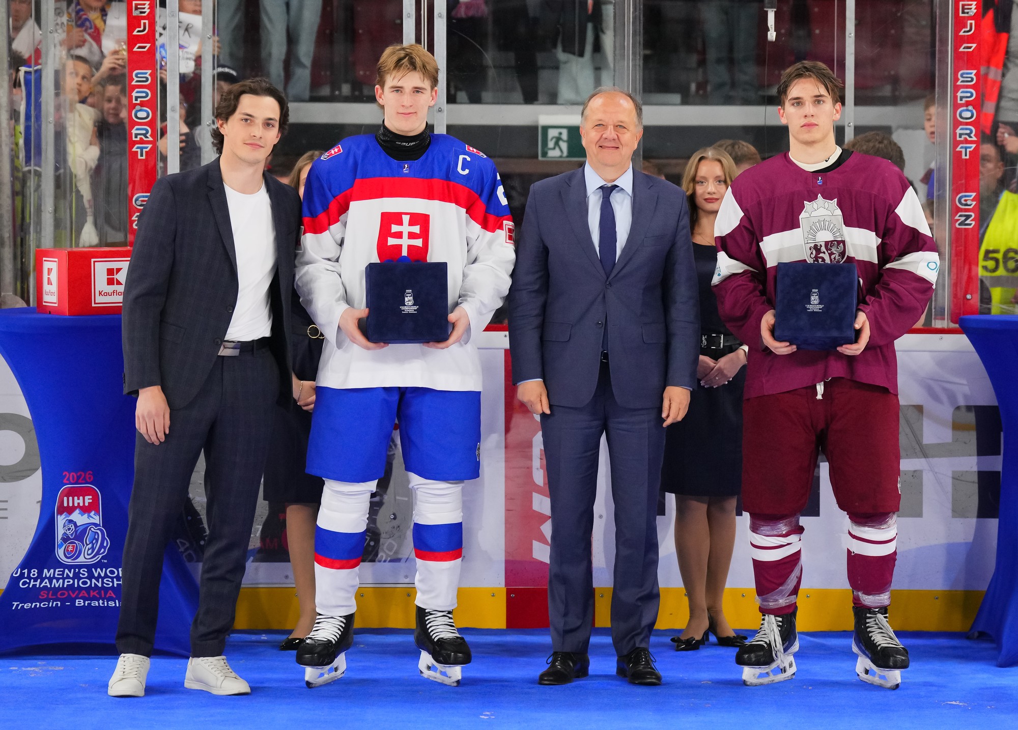 Slovakia's Samuel Hybsky keeps the puck away from Latvian captain Davids Tarvids as Lucian Bernat looks on during the teams' 2026 IIHF U18 Men's World Championship game in Trencin.