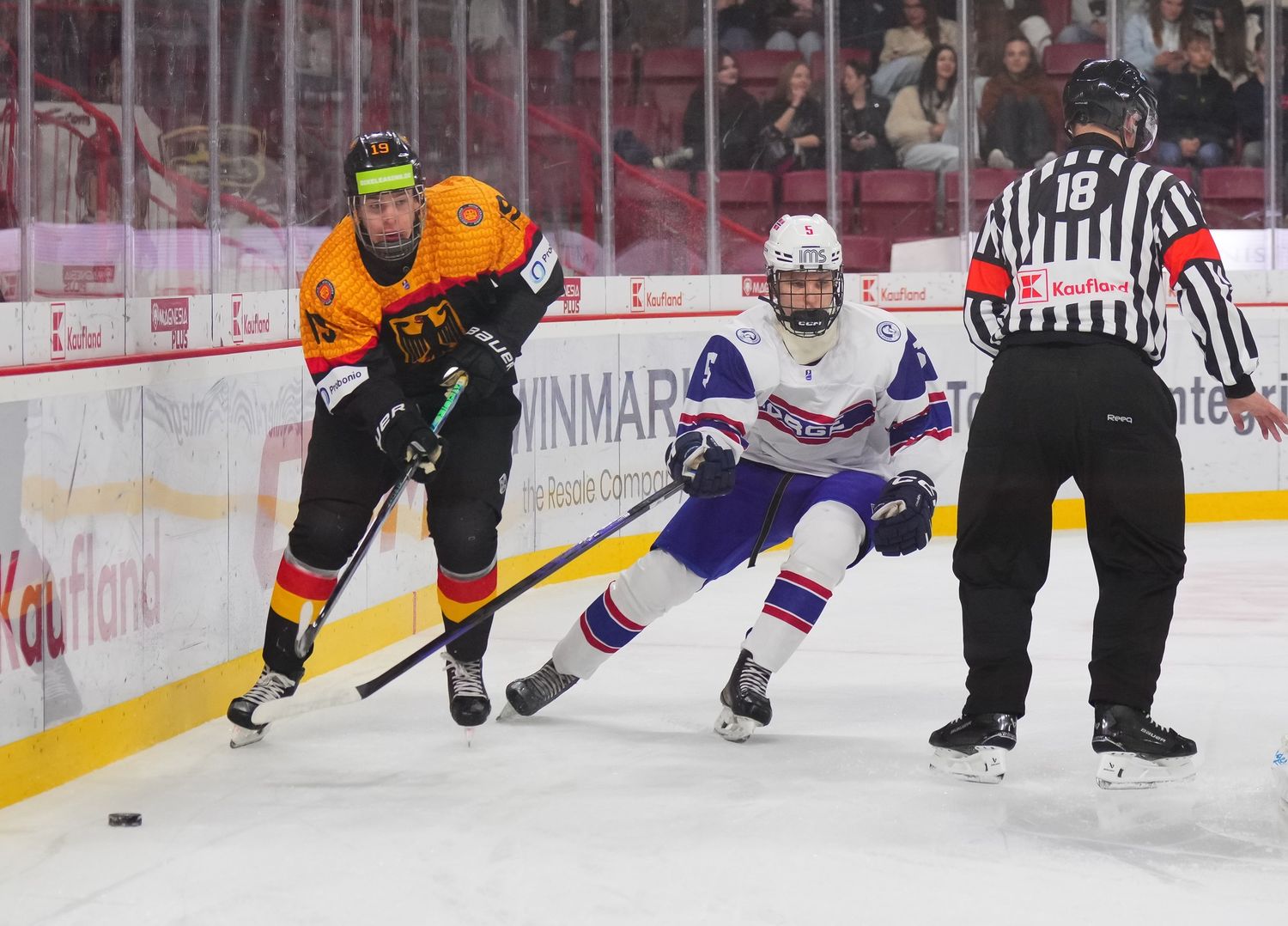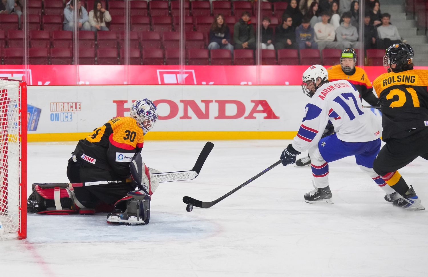 With high stakes in play, the early exchanges were predictably nervous. In the first 10 minutes of play, goalies Niclas Wolter and Felix Timraz-Westin were barely tested. Germany got the first power play of the game midway through the opening frame, but made little impact and almost allowed a two-on-one rush as Mathias Andresen Sivertsen jumped out of the box and onto a play.