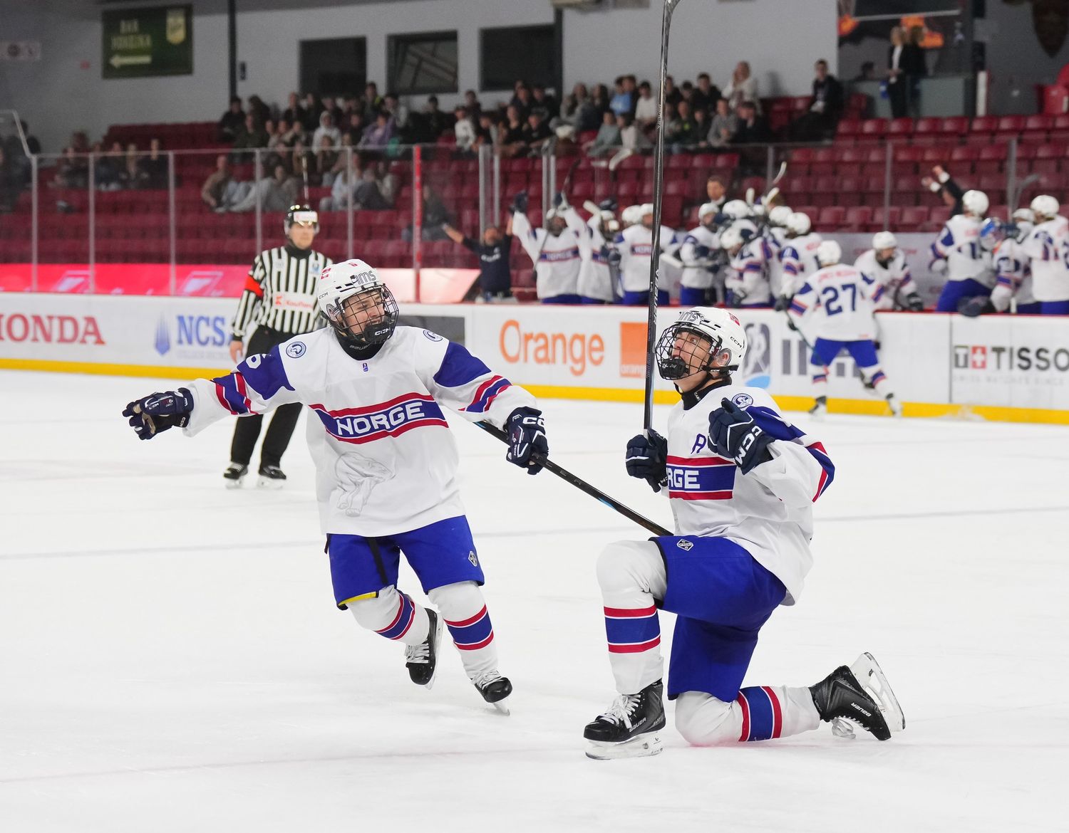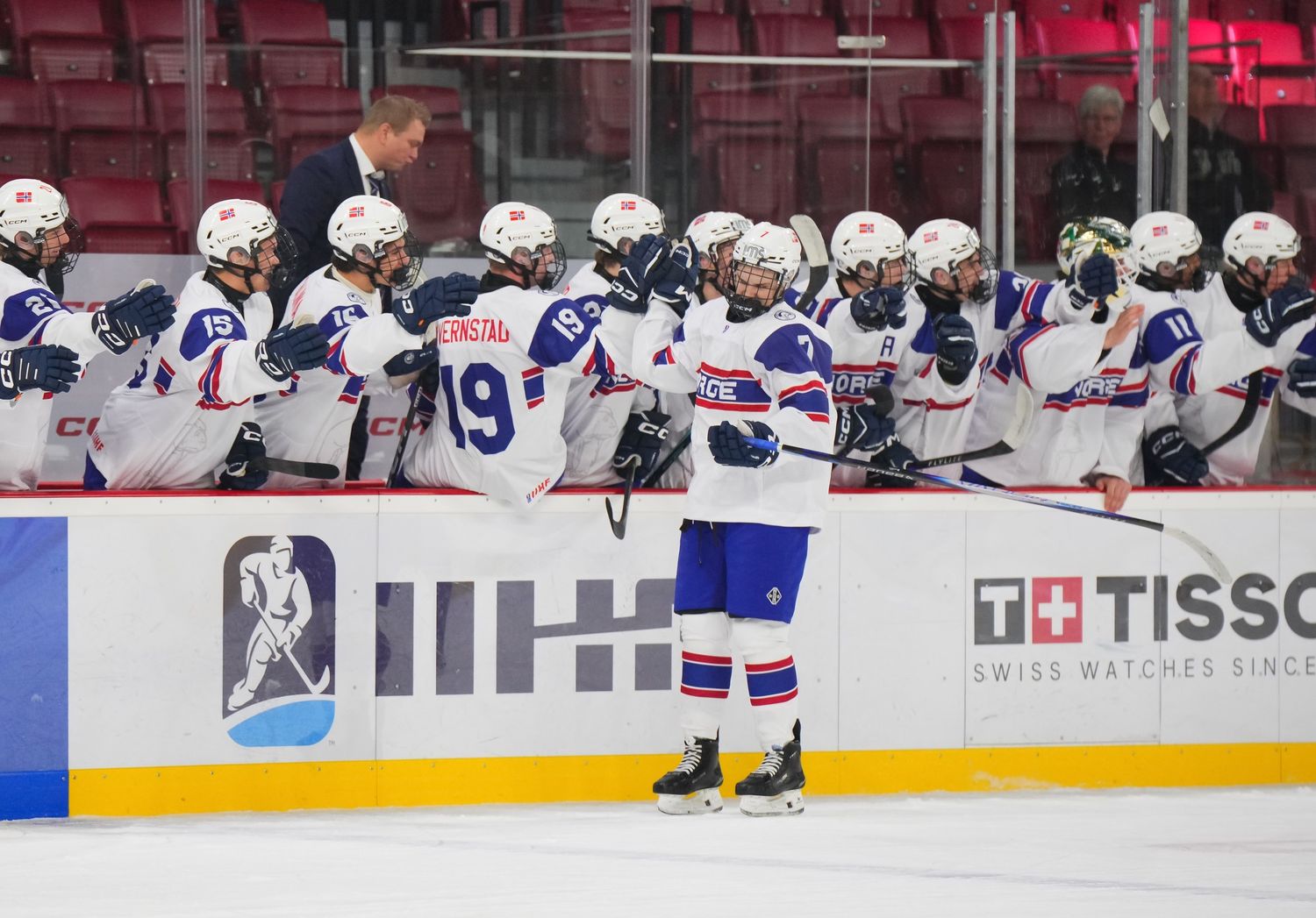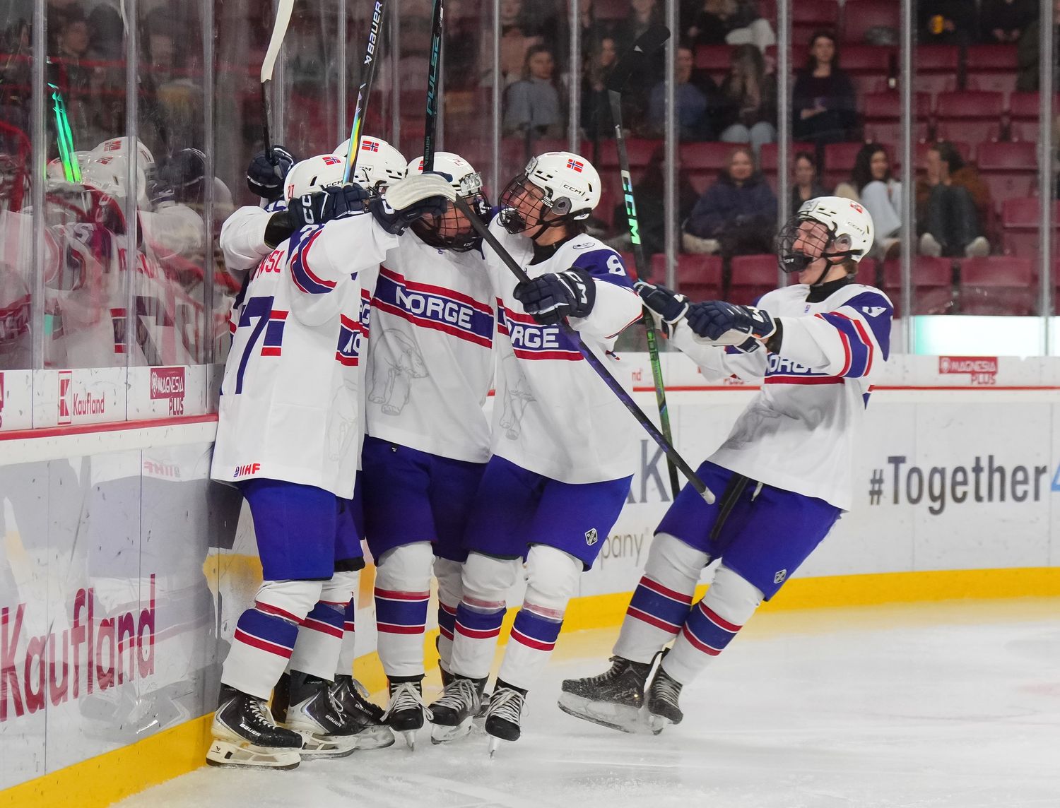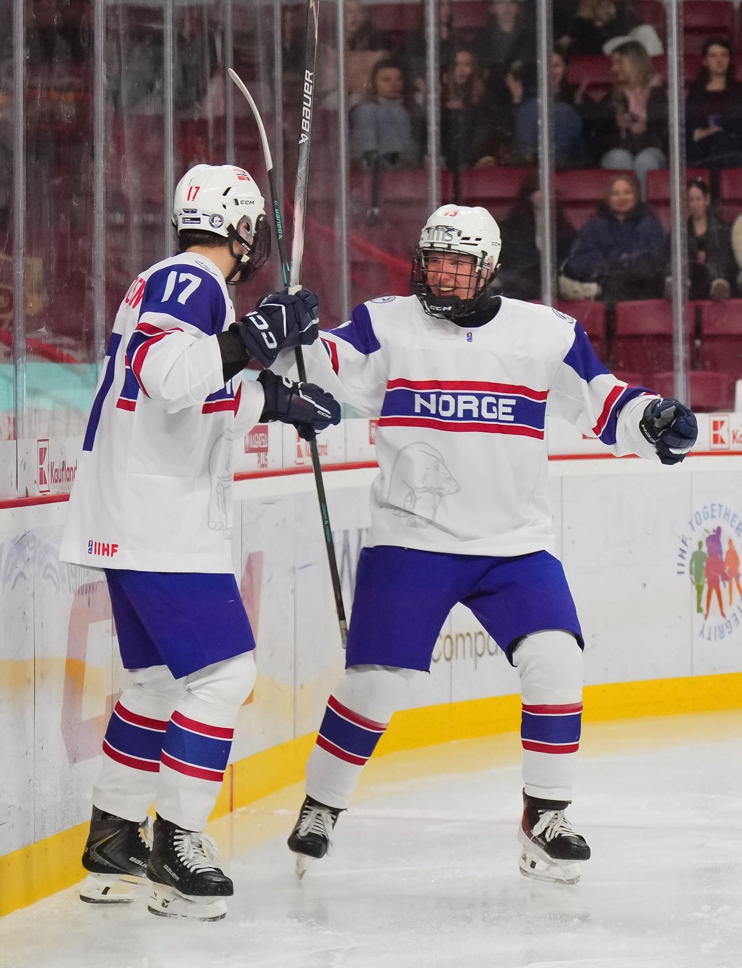 But those same Norwegians were celebrating 28 seconds after the restart as Aaram Olsen doubled the lead. The forward, playing his final game at this level after three U18 World Championships, found open ice on the edge of the circle and shot home Benjamin Haglund’s pass from behind the net.