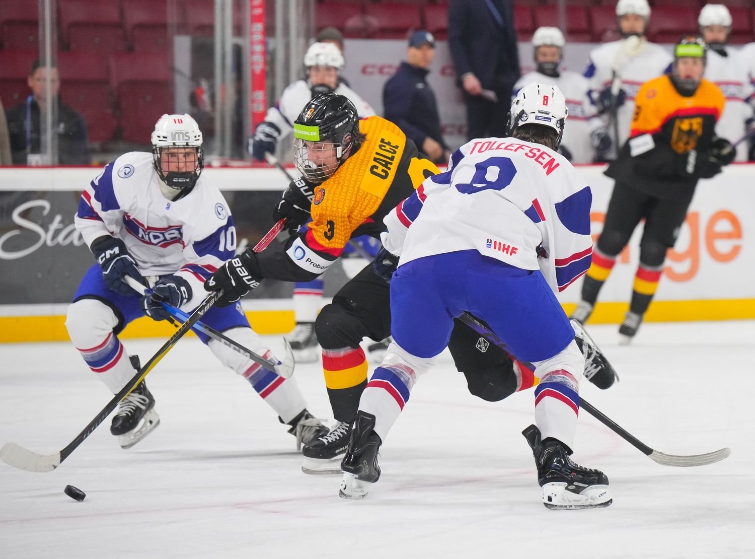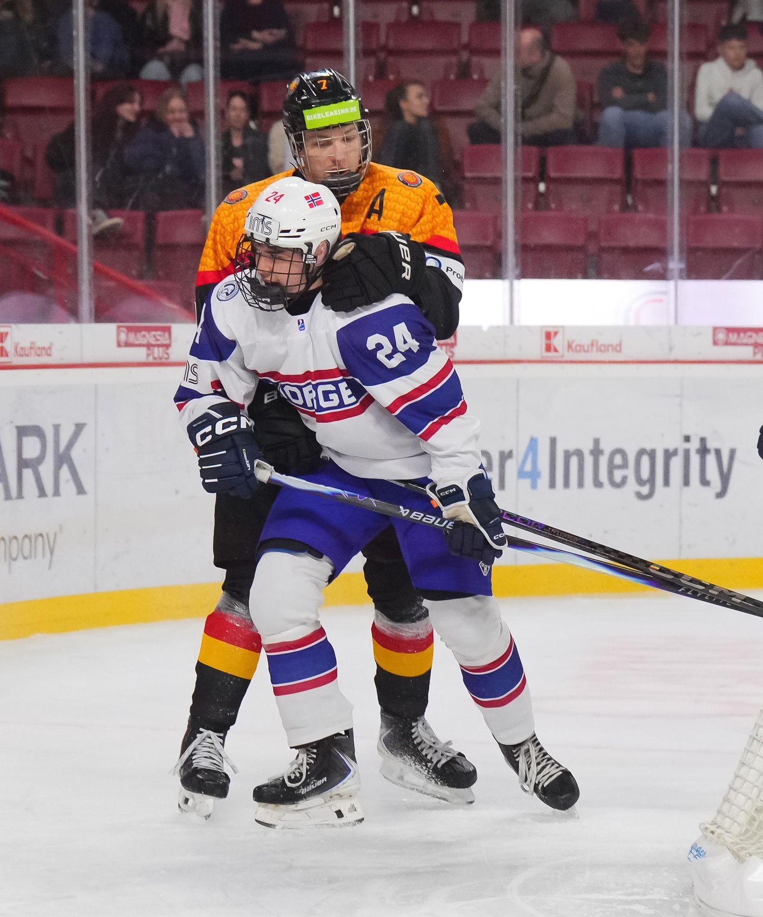 Just as the pressure seemed to be building on Germany, Andreas Becherer’s team found a way back into the game. It came from Calce, who played in last year’s tournament as Max Penkin while aged just 15. New name, same predatory instincts, Calce potted his first goal of the 2026 event after Krestan won possession from Sondre Berg behind the Norwegian net.