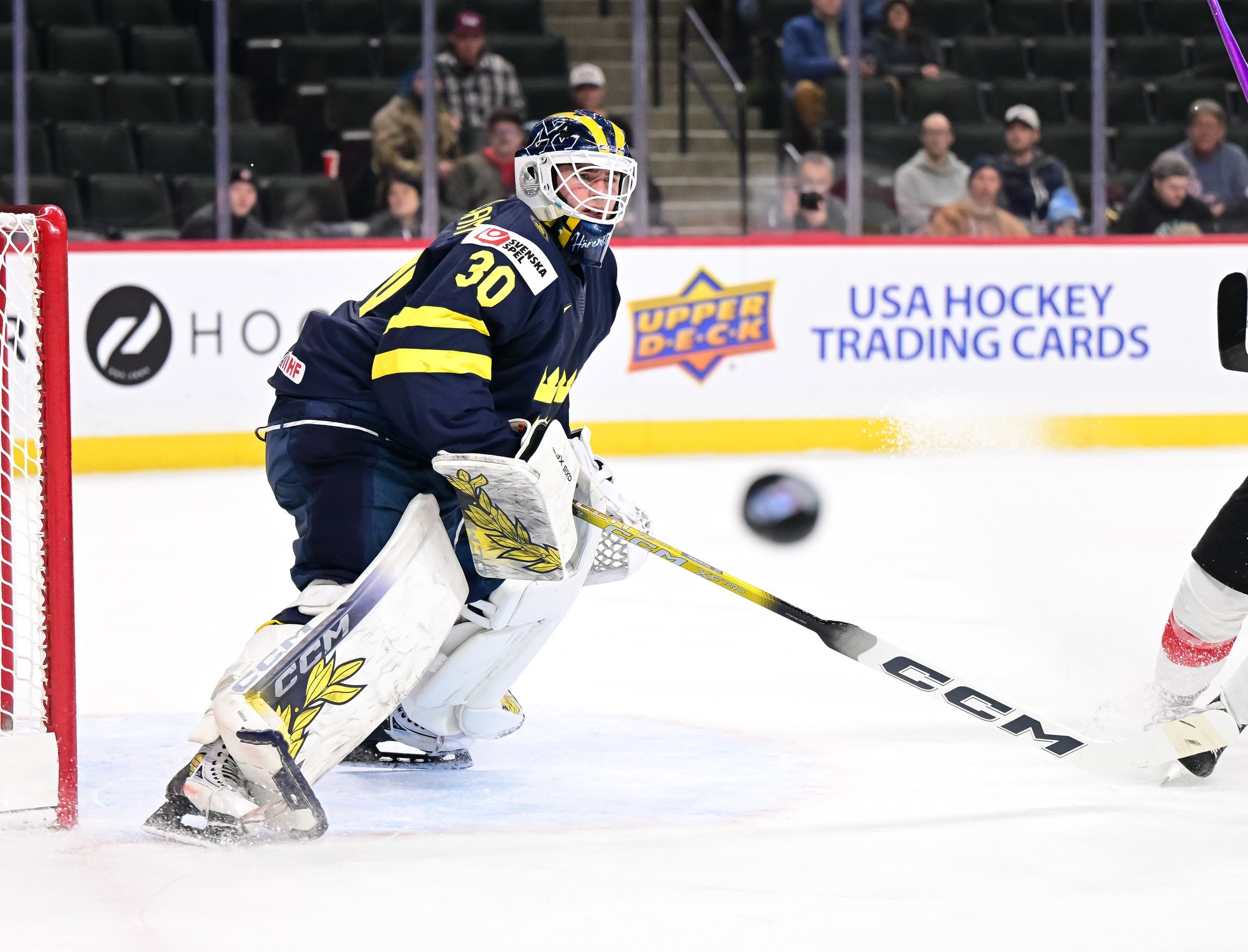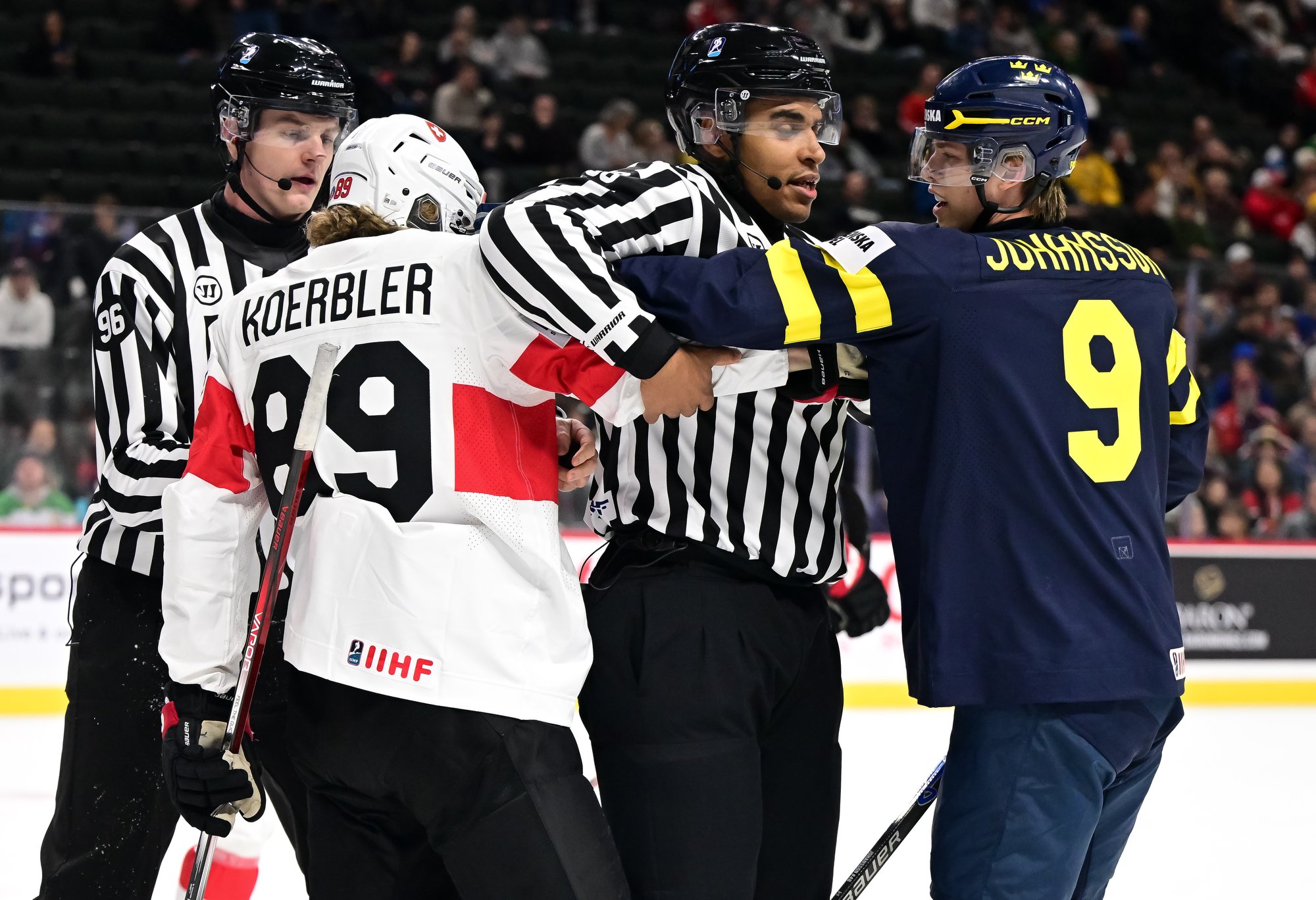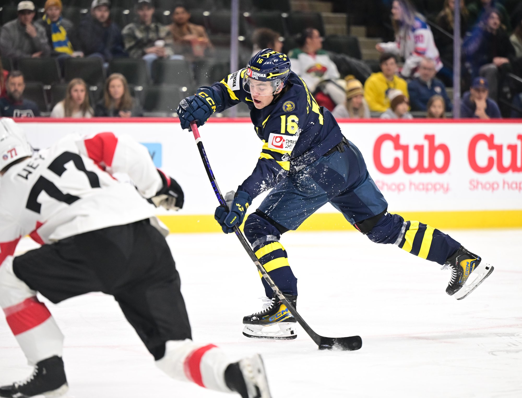 Sweden started the third on a power play and didn't waste any time tying the score. Viggo Bjorck's snap shot from the high slot at 57 seconds wasn't a power-play goal exactly, but Jonah Neuenschwander's penalty expired only one second previous, and he wasn't back in the play by the time Bjorck took his shot.