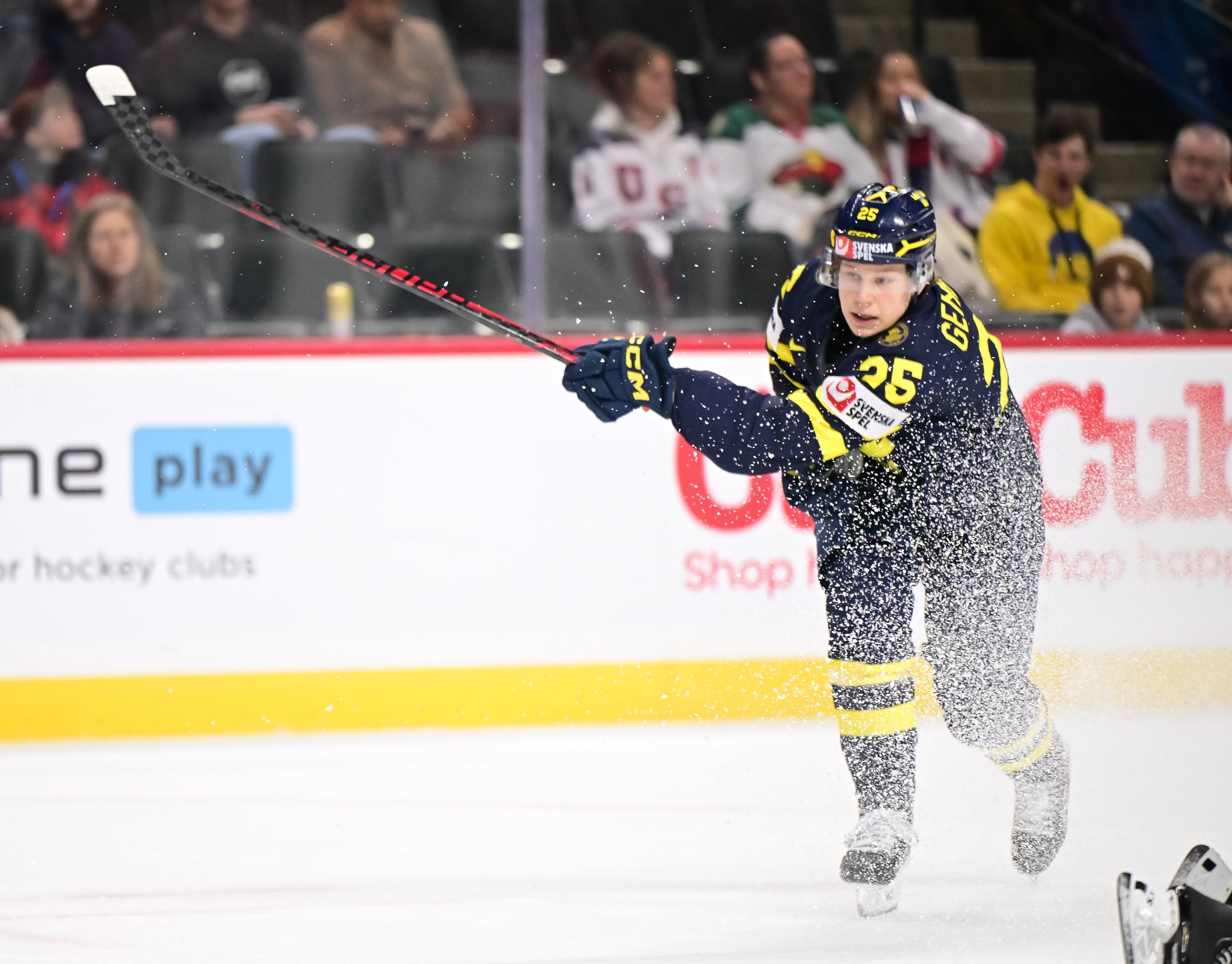 Carrying the puck over the Swiss blue line, defender Leo Sahlin Wallenius criss-crossed with Eric Nilson and then wafted a pass to him in front. Nilson made a quick move and slid the puck in at 53 seconds for the 1-0 Sweden lead.