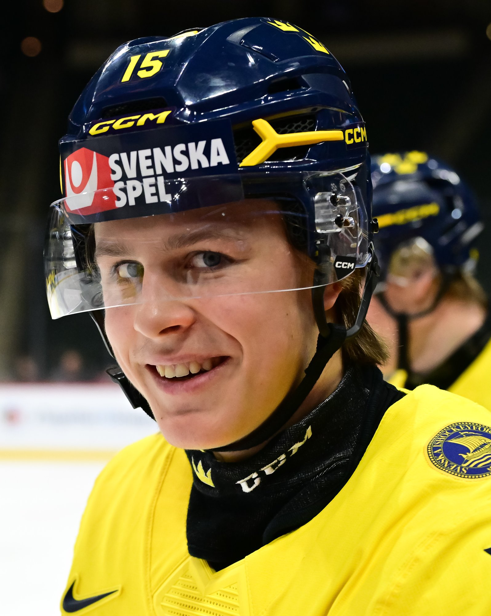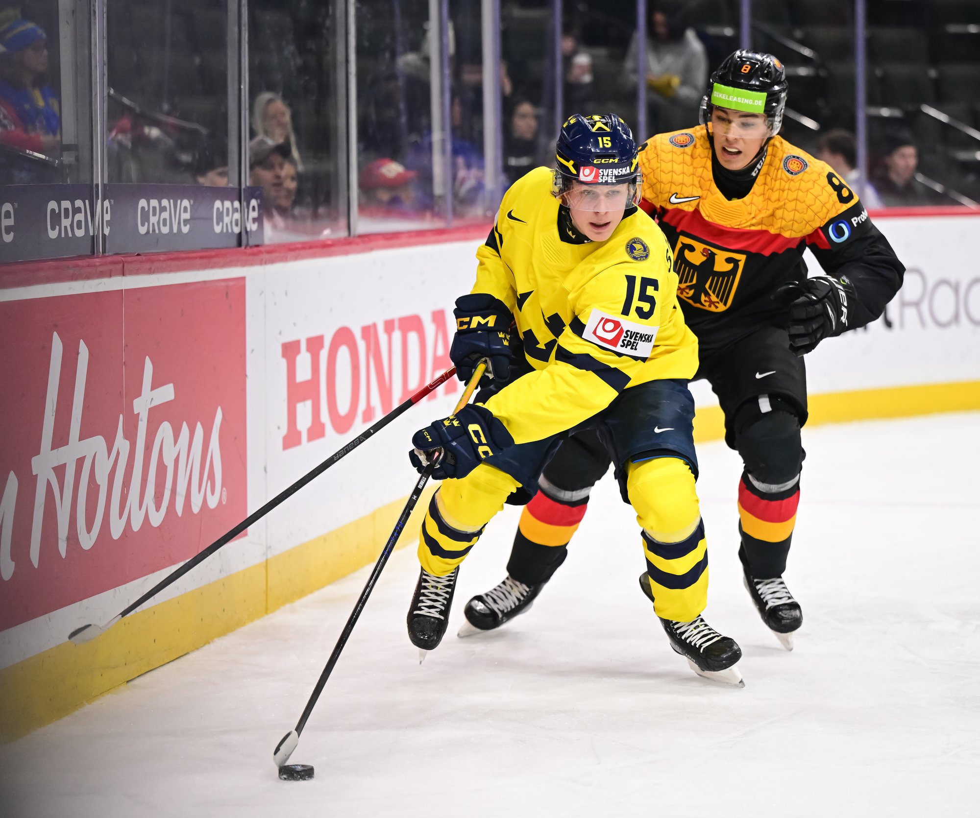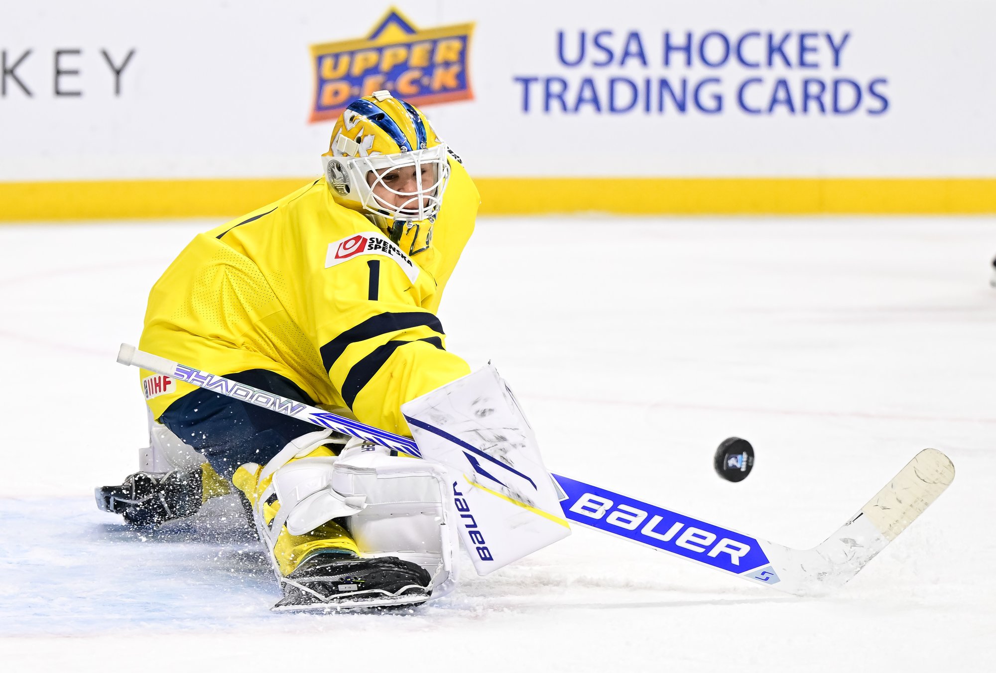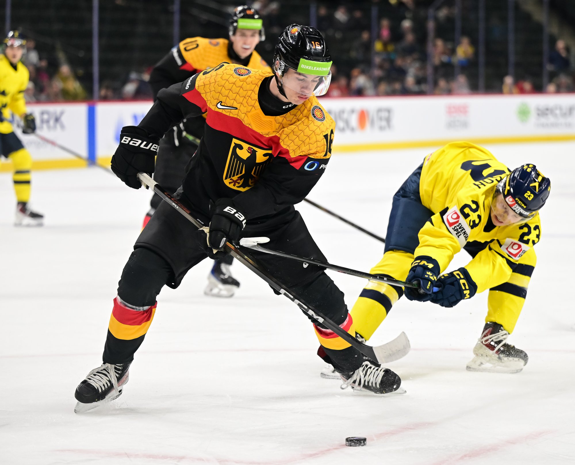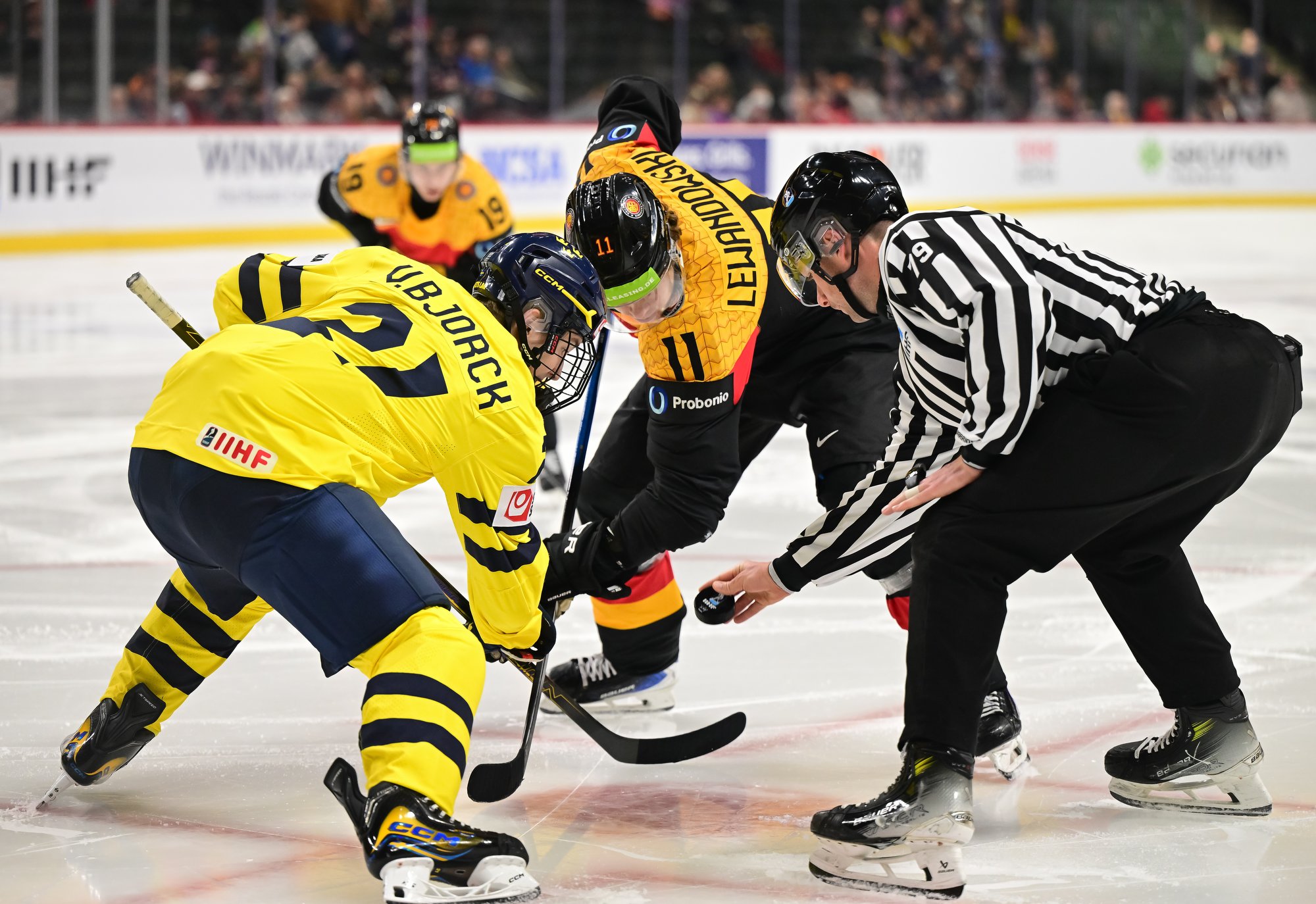 Just after another German minor expired early in the second period, Viggo Bjorck restored the Swedish lead at 1:03. Boumedienne alertly found Wilson Bjorck's younger brother in the right faceoff circle and the Djurgarden forward cued up a shot that eluded Vieillard on the short side.