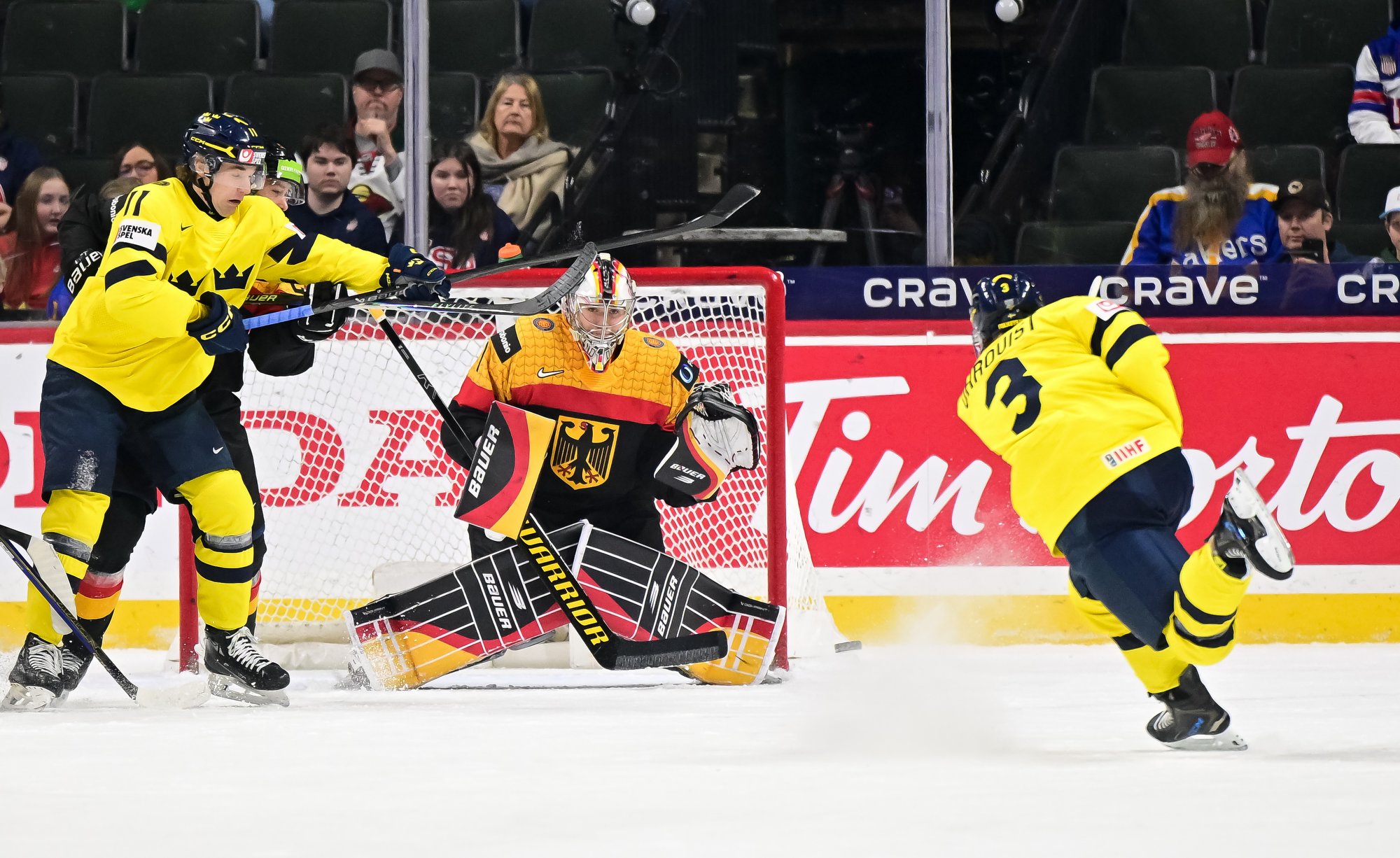 At 15:34, the Swedish power play clicked again as Bjorck slid one past the German netminder's left skate. And Ohrqvist put the game out of reach at 19:29 as he walked to the top of the faceoff circle before slinging a wrister past Vieillard.