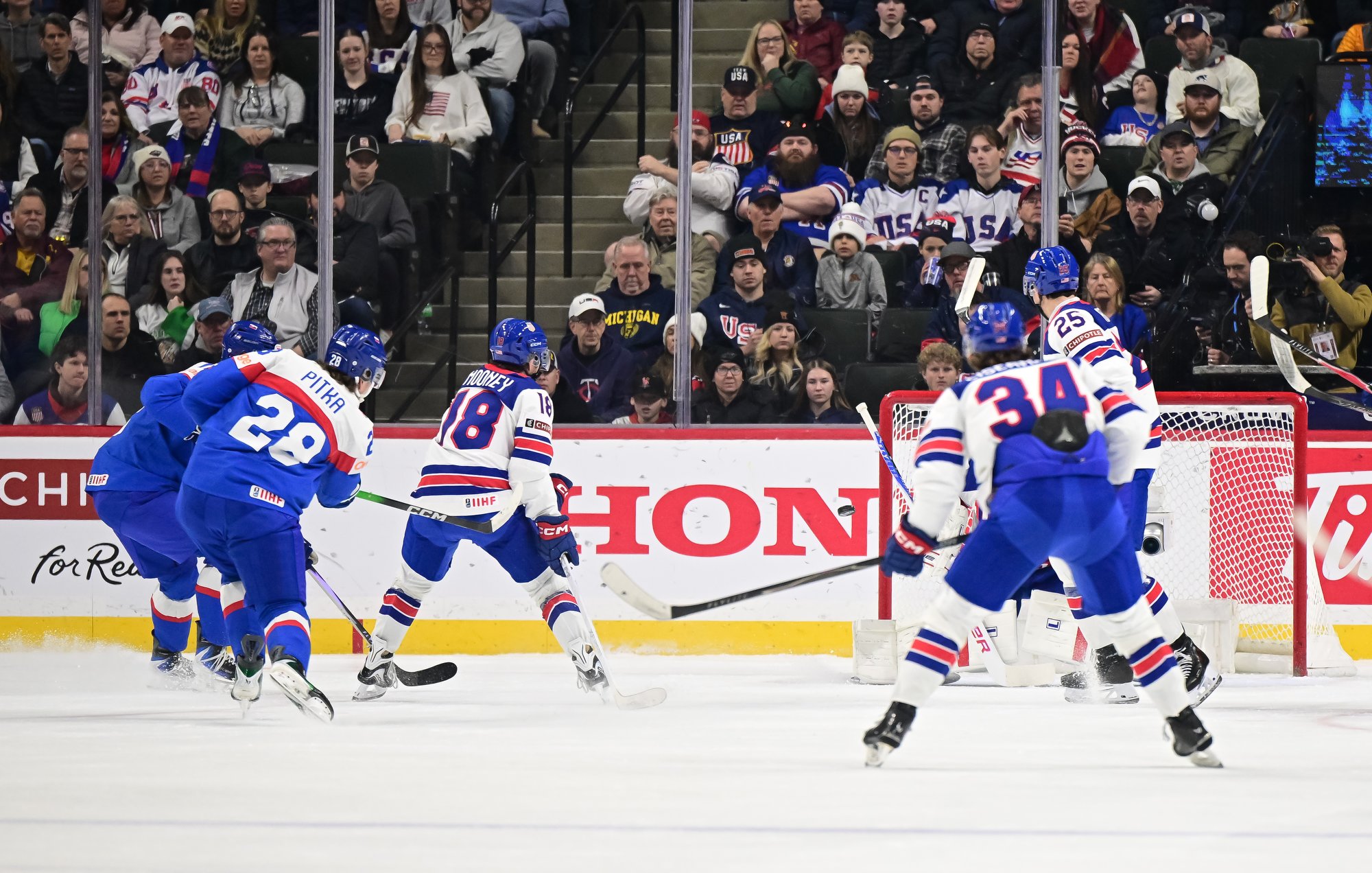 Slovakia came out hard, stunning the partisan crowd at St. Paul’s Grand Casino Arena. Pitka made it 1-0 at 8:53, taking a drop pass from Tobias Tomik on the rush and beating Heil clearnly over the blocker.