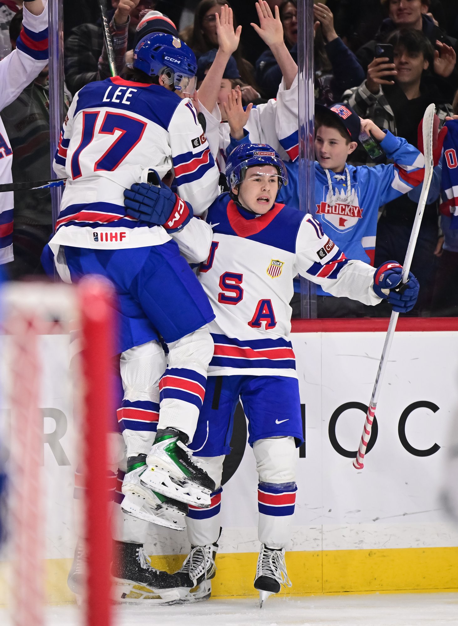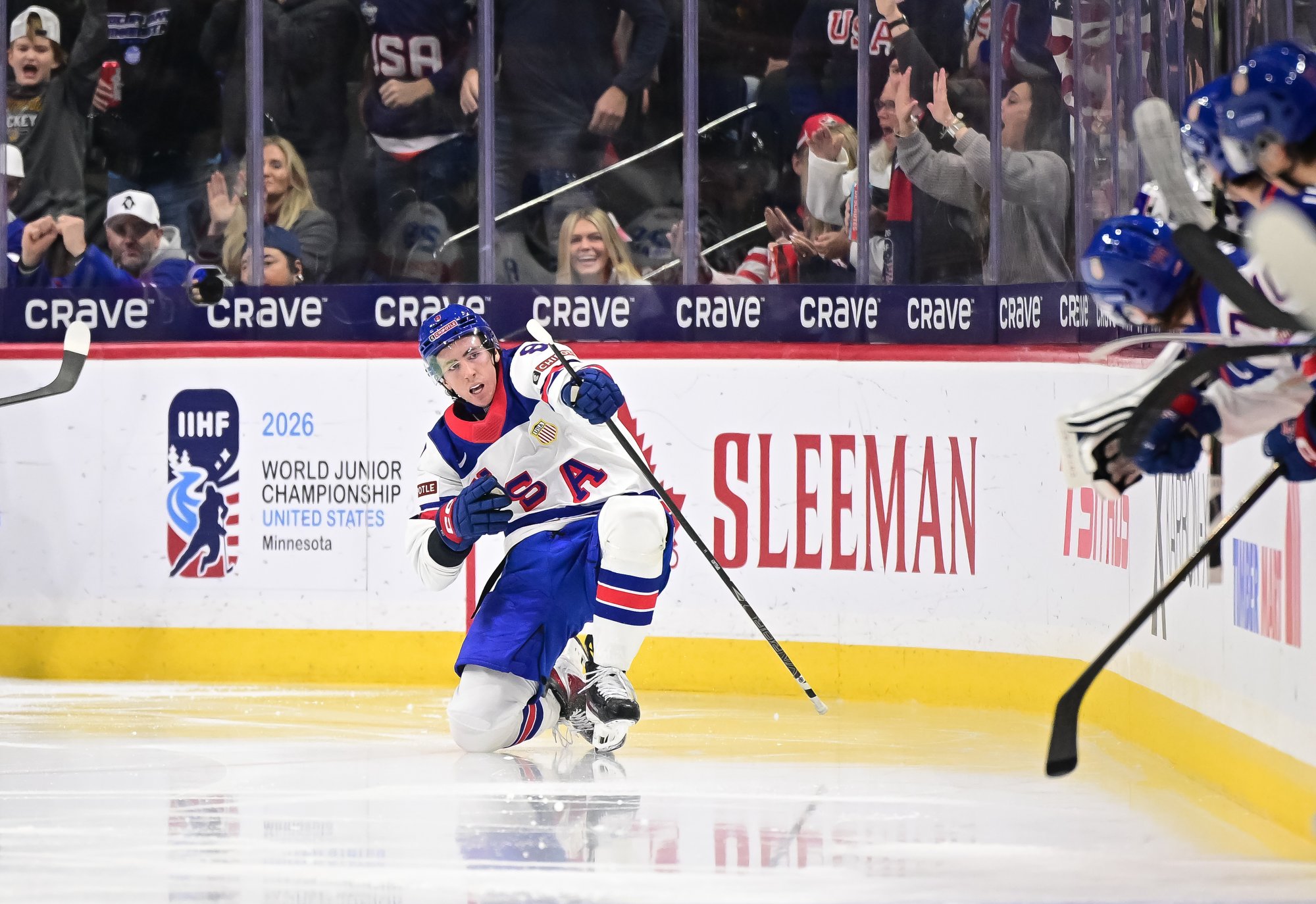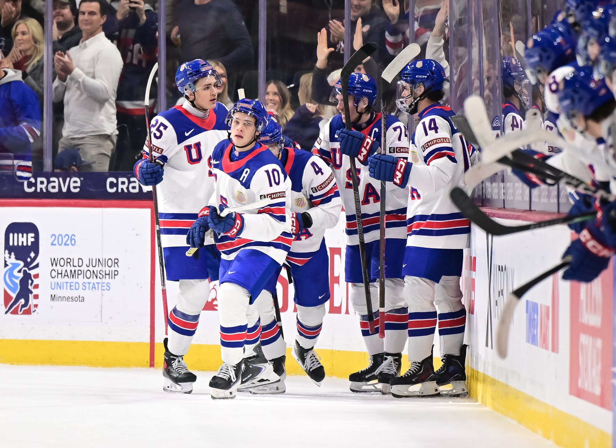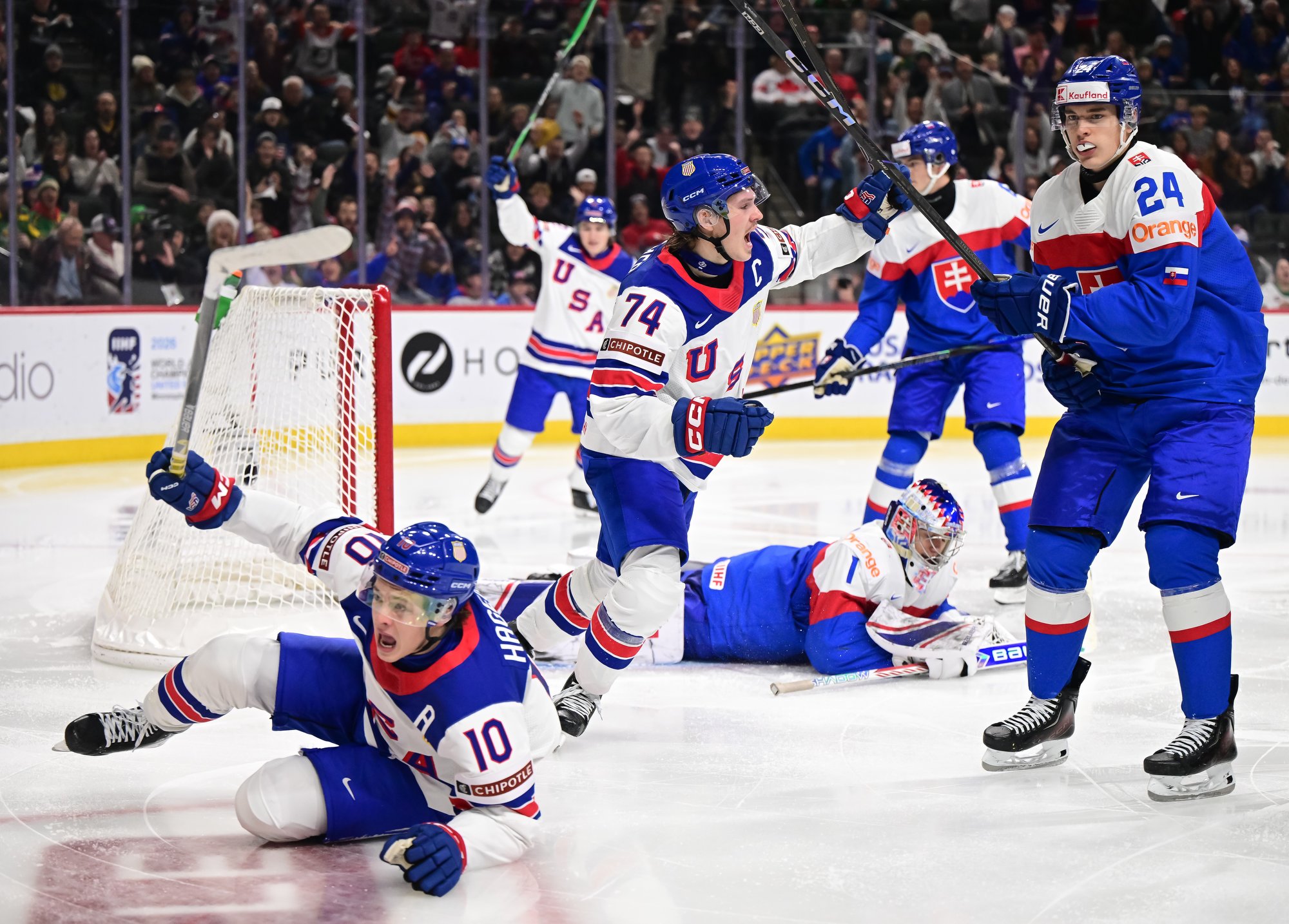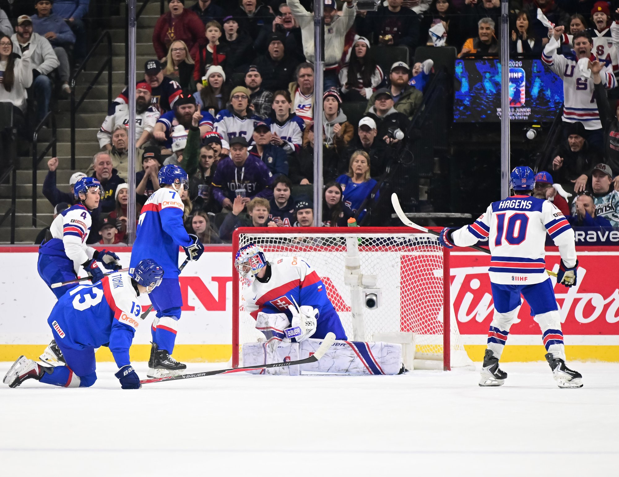 U.S. ace James Hagens (#10) celebrates after scoring a second-period goal in a 6-5 come-from-behind win over Slovakia at the 2026 IIHF World Junior Championship.