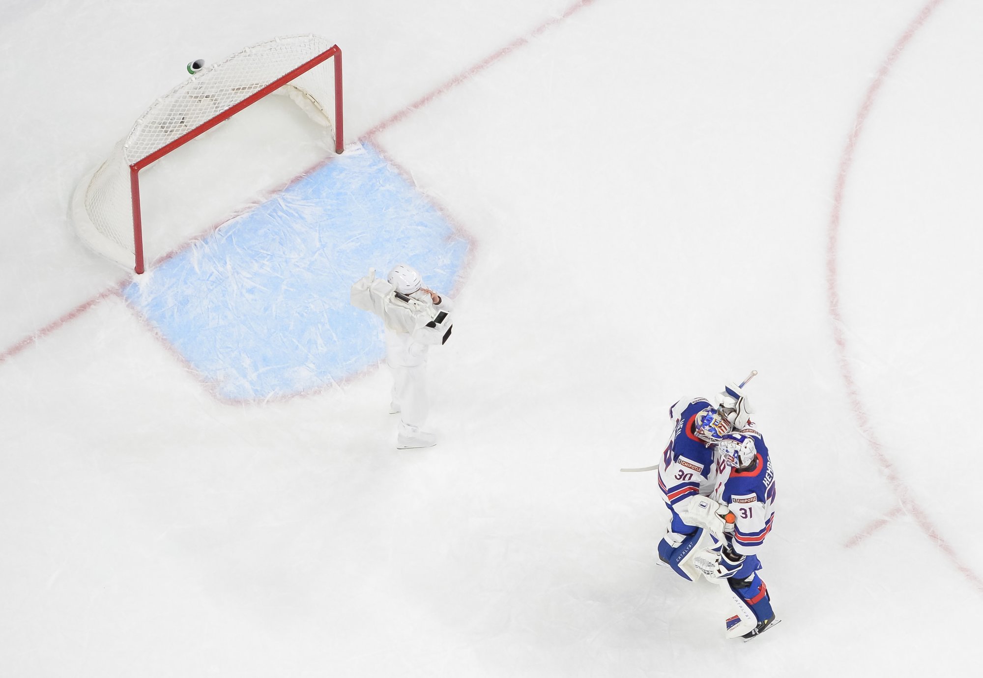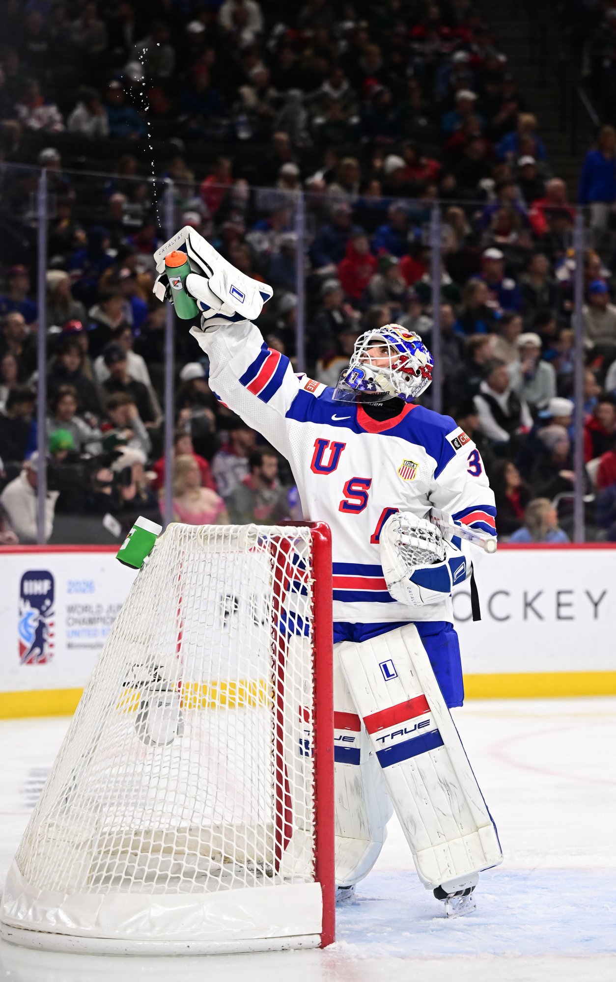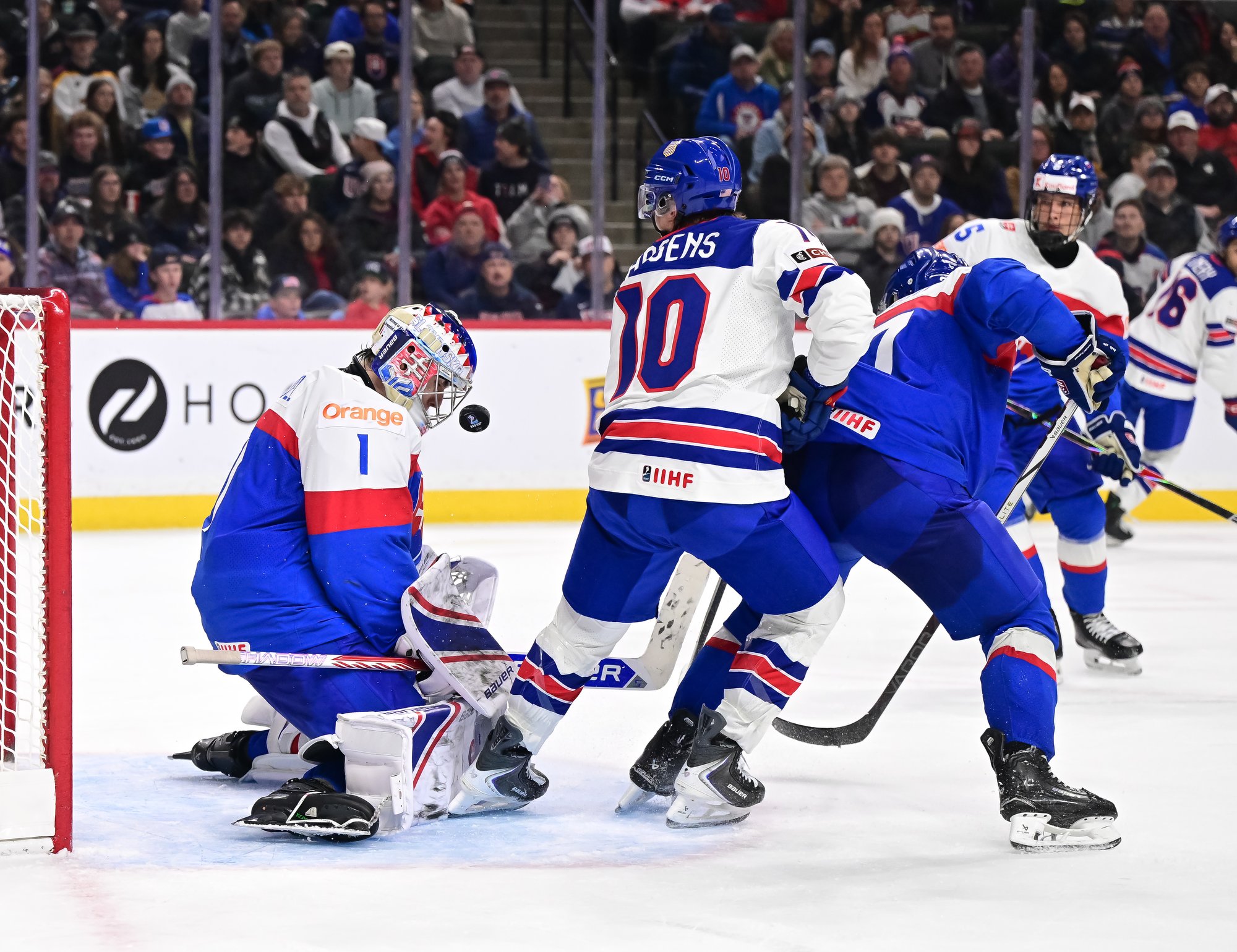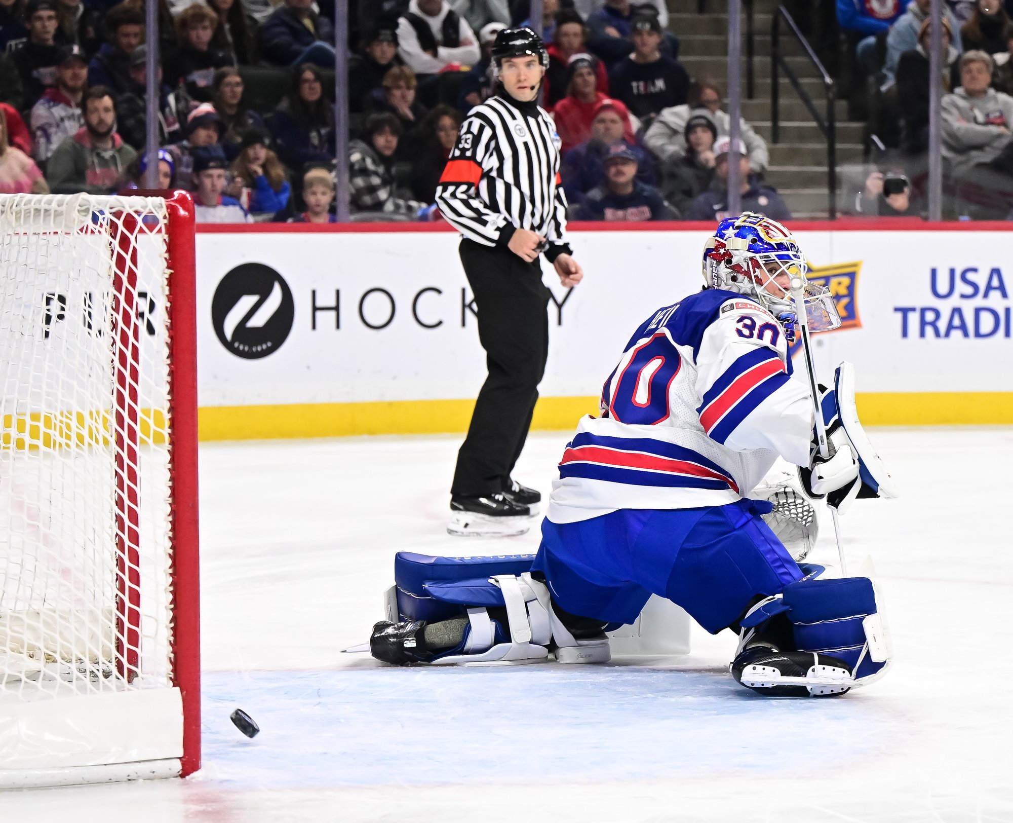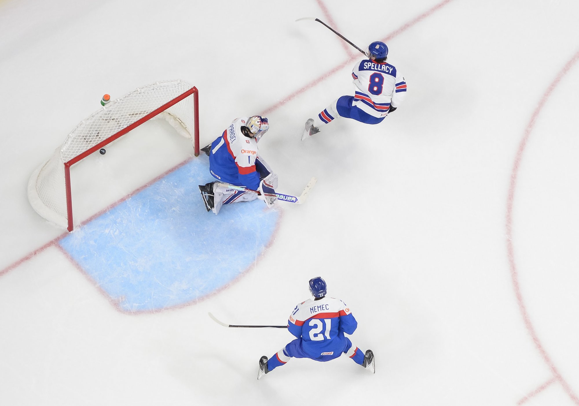 Just past the midway mark, the Americans thought they had scored a power play goal. However, Pradel managed to grab the rolling puck on the goal line with help from his defence.