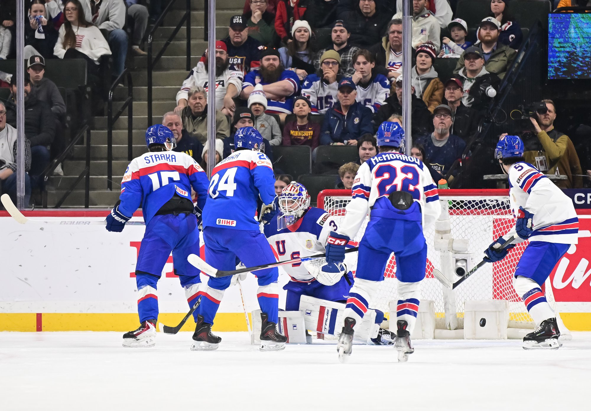 The U.S. finally countered with a shorthanded goal at 1:50 of the second period, sending the arena into a towel-waving frenzy. McMorrow blocked Pitka's point shot, busted out of the U.S. zone, and found a streaking Spellacy in front for a one-handed deflection.