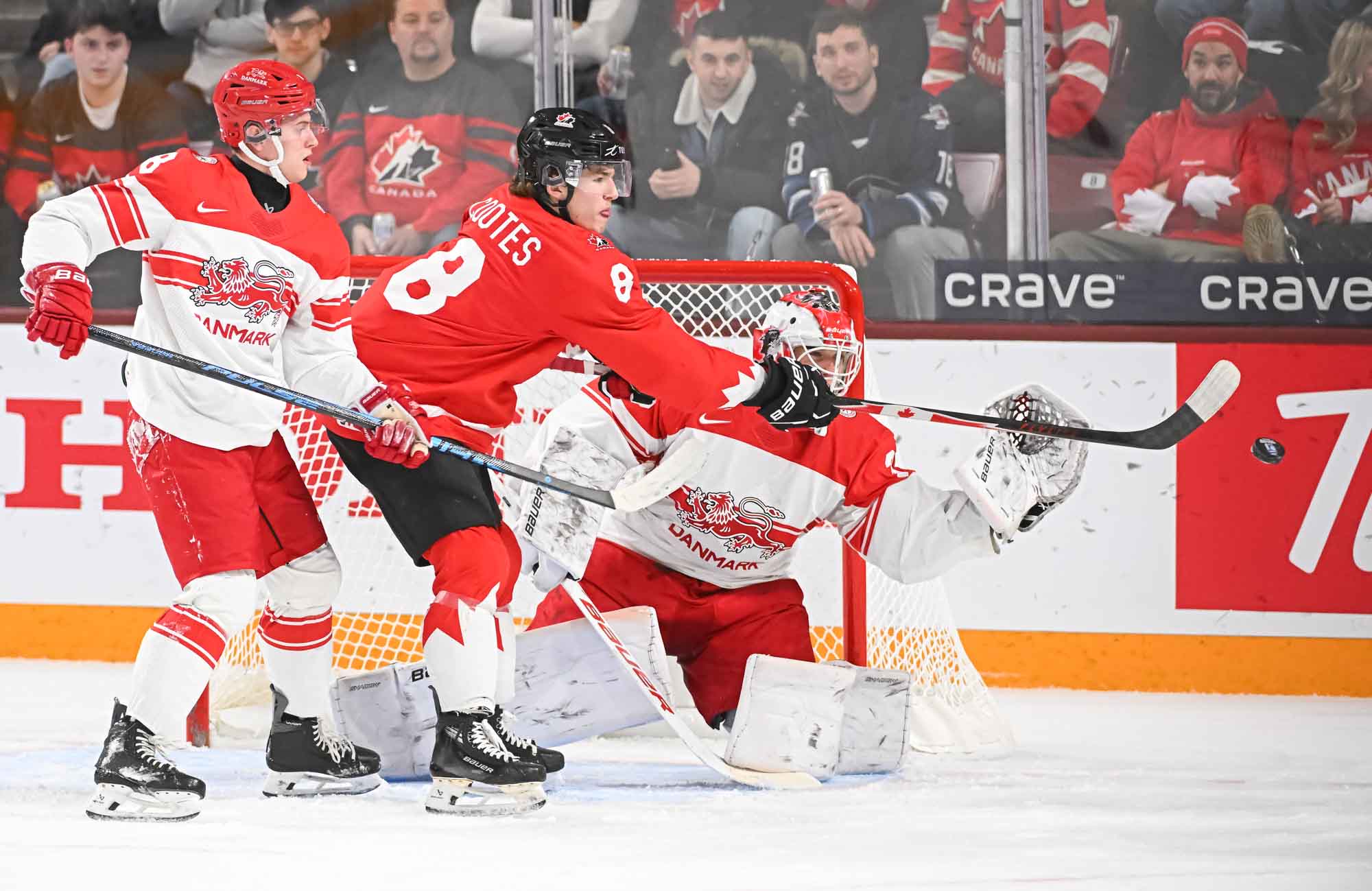 How bad was it for the Danes? Tristan Petersen broke a skate blade deep in the Canada end and struggled mightily to crawl to the bench. He wasn’t halfway there when Canada took advantage of the extra skater. Zayne Parekh finished the play with a high shot that eluded Patrick Tiedjen, who was making his debut with the national team.