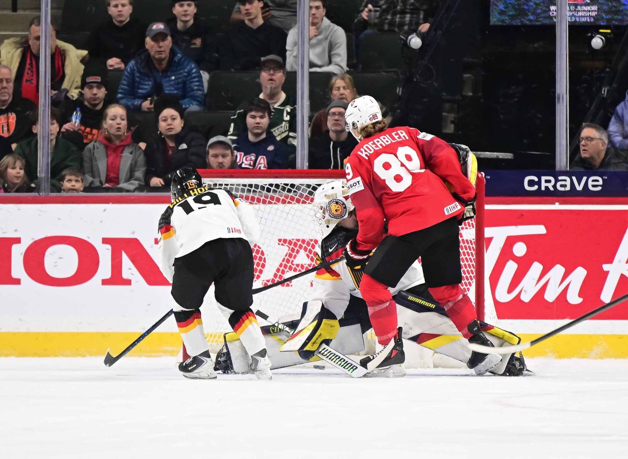 Just 1:08 into the second period, Koerbler scored his second goal of these World Juniors on an audacious solo effort. He stole the puck from Schwarz at the German blue line and raced in on net, converting his own rebound over Neisse's outstretched pad.