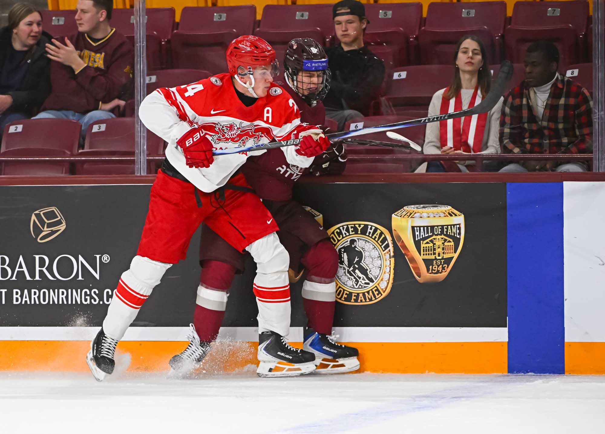 The Danes ran into penalty trouble in the third and paid the price. Osmanis made it a 5-2 game when he came off the boards into the middle and drilled a low shot that beat Wilde cleanly at 9:52.