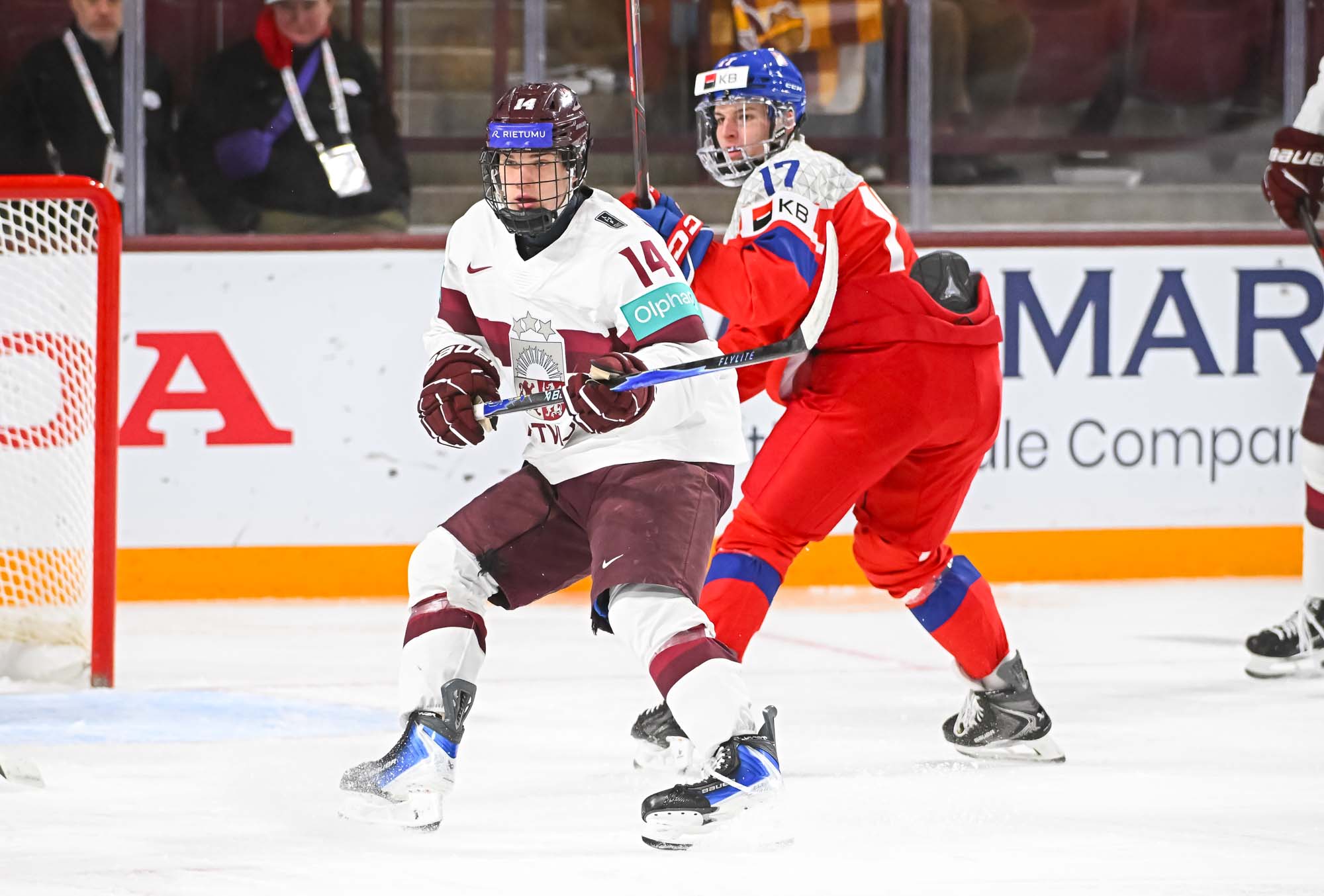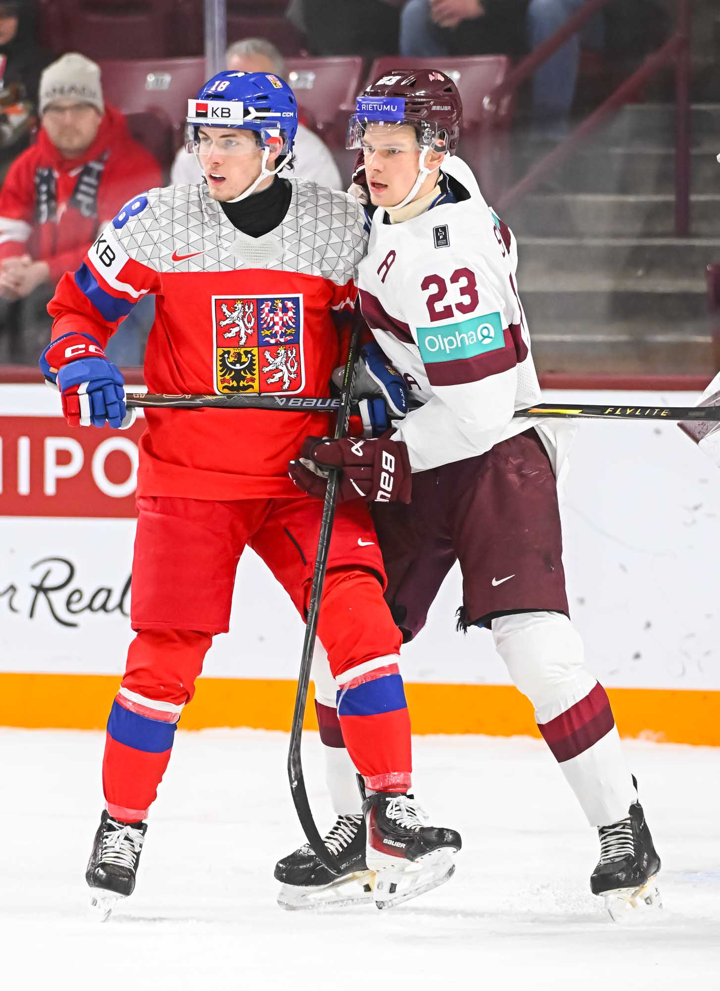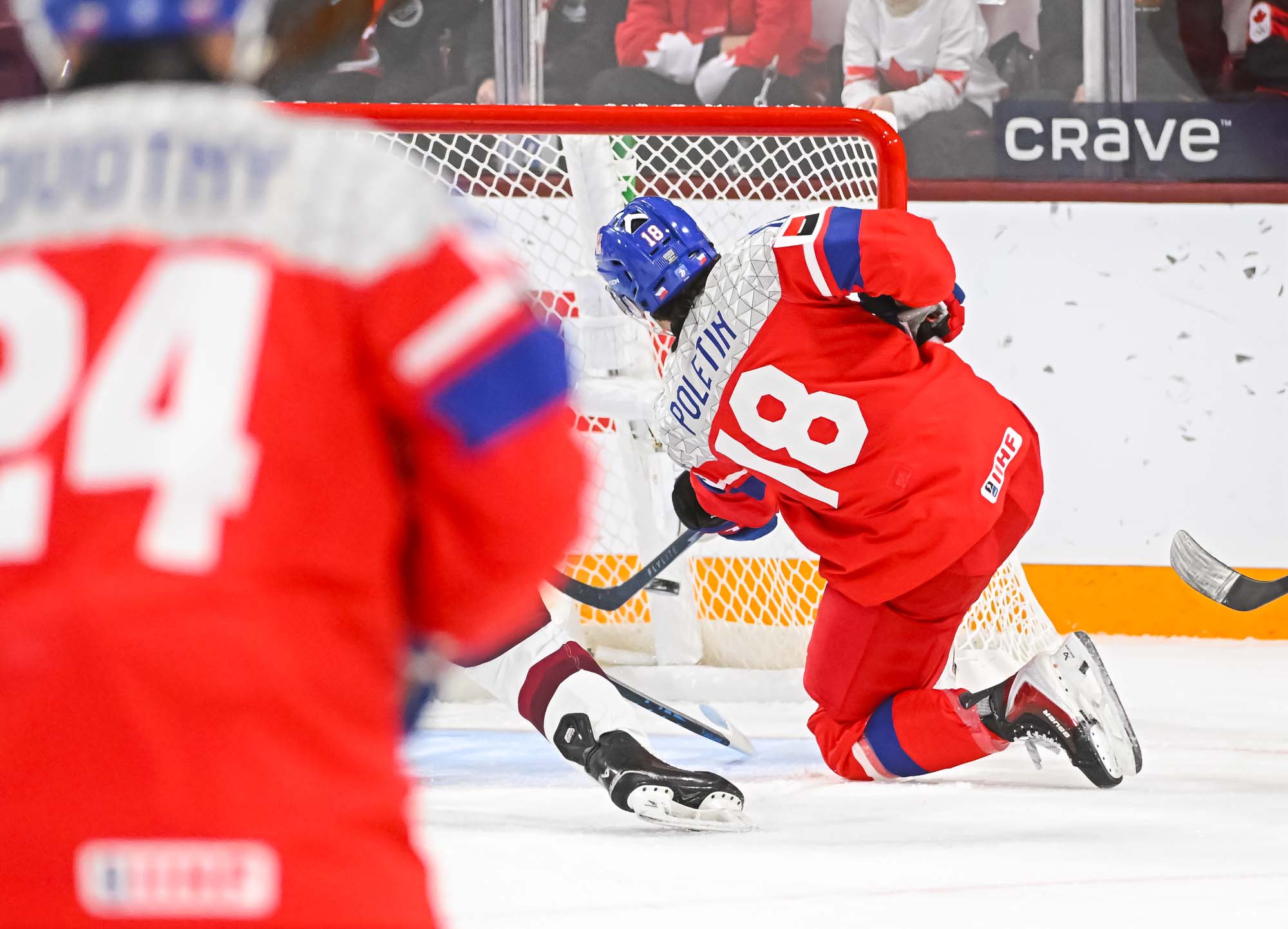 Czechia kept plugging away. At 5:31 of the second period, Psenicka made it 3-1 with a bad-angle shot that deflected in off the leg of Latvian blueliner Harijs Cjunskis, fighting for body position in the crease. Maurins pushed Cjunskis away in annoyance.