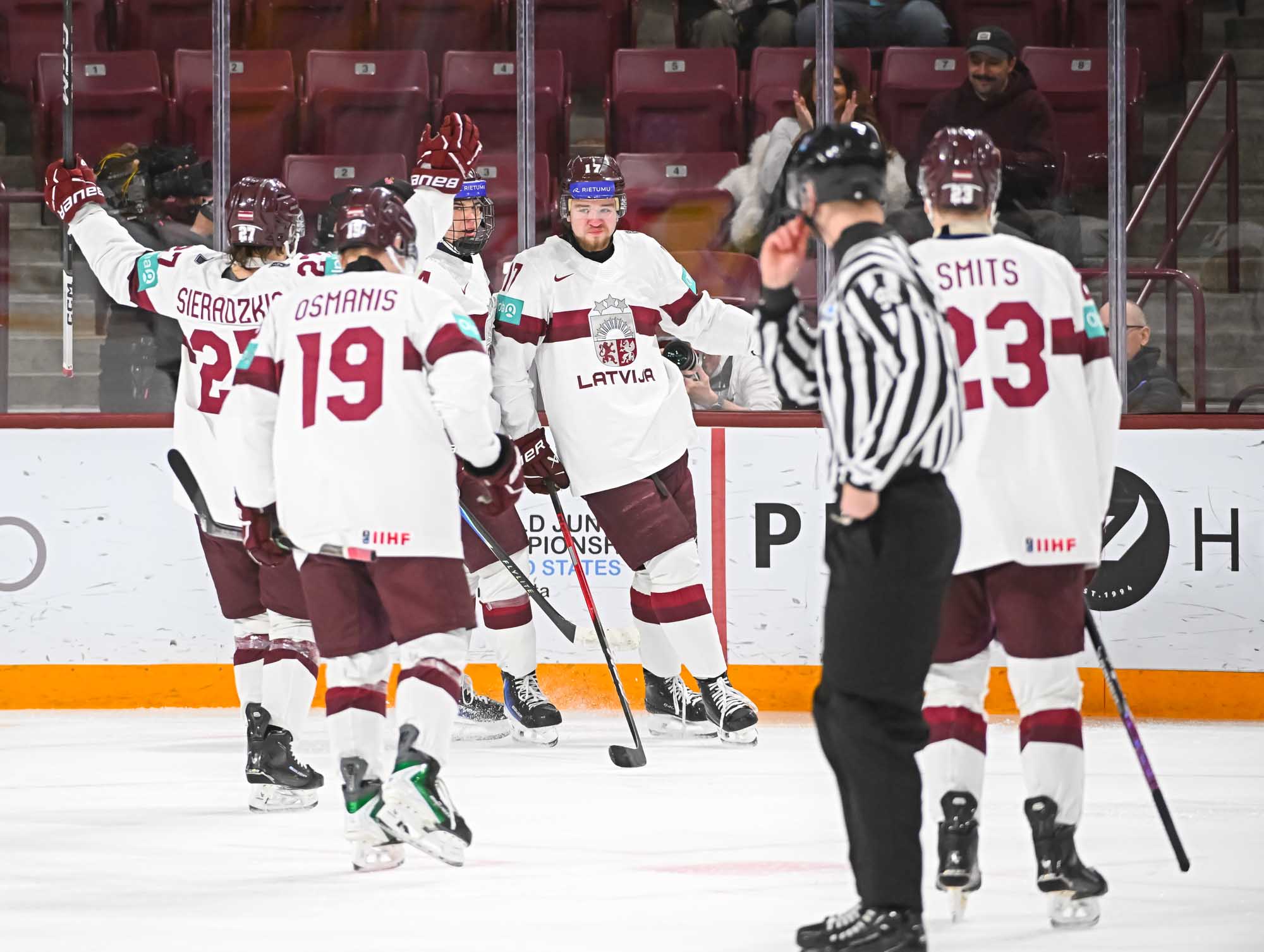 The Latvians never quit in the third period. Markuss Sieradzkis cut the deficit to one goal with a tremendous power-play one-timer at 7:39.