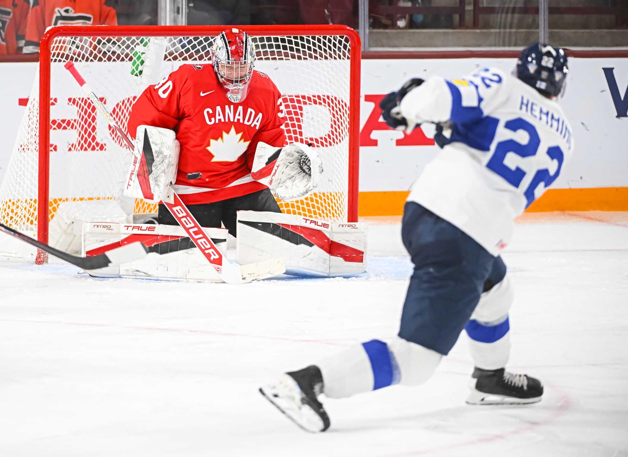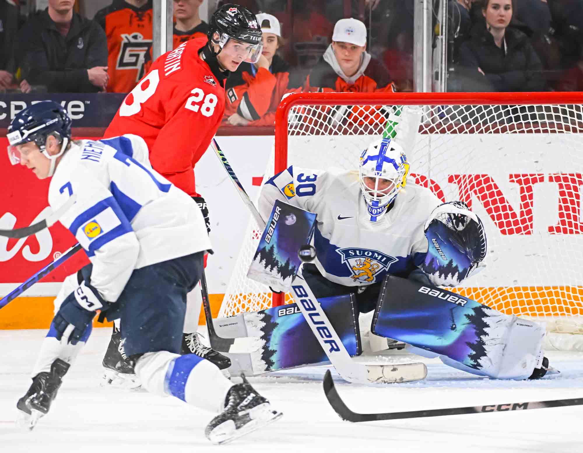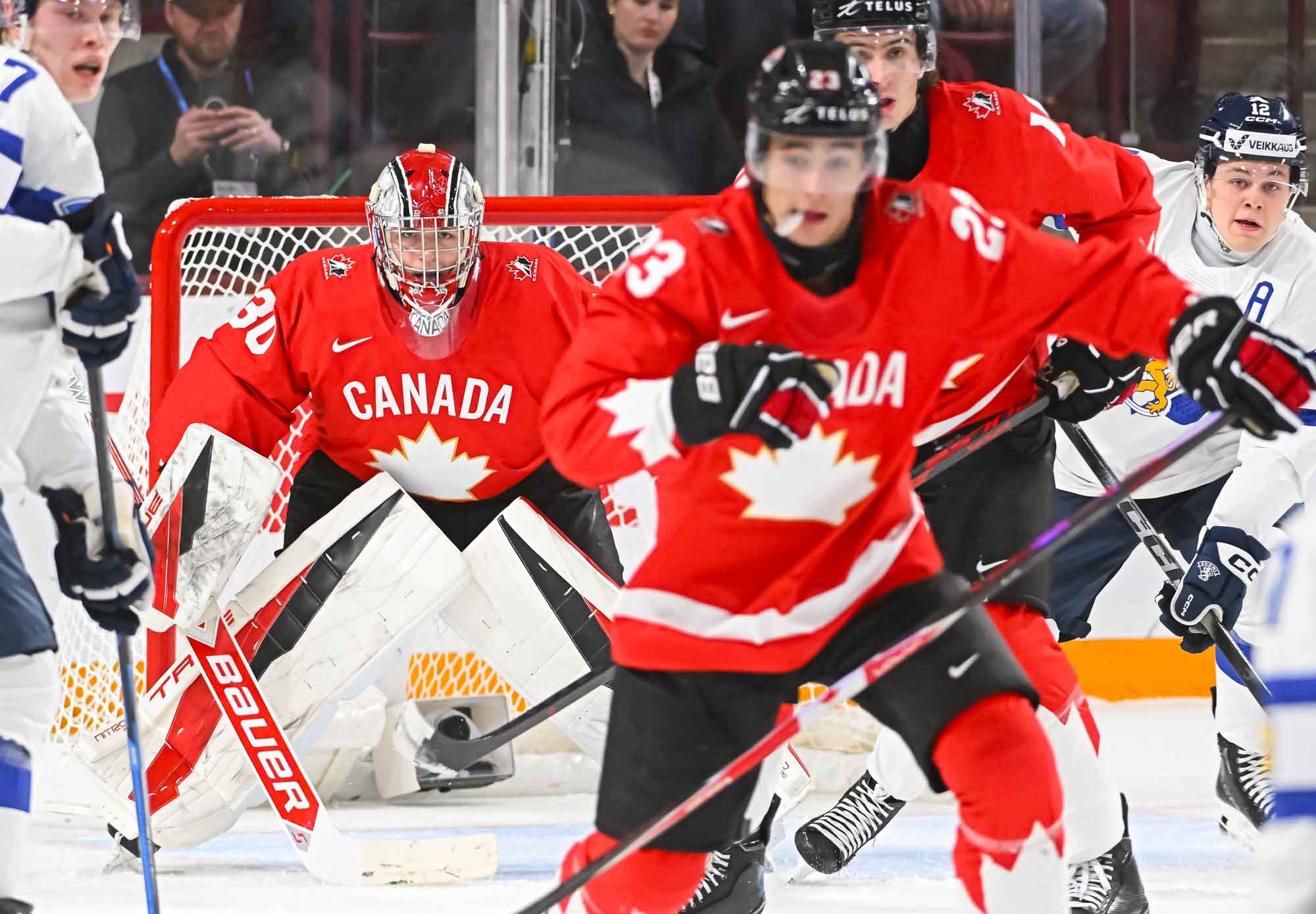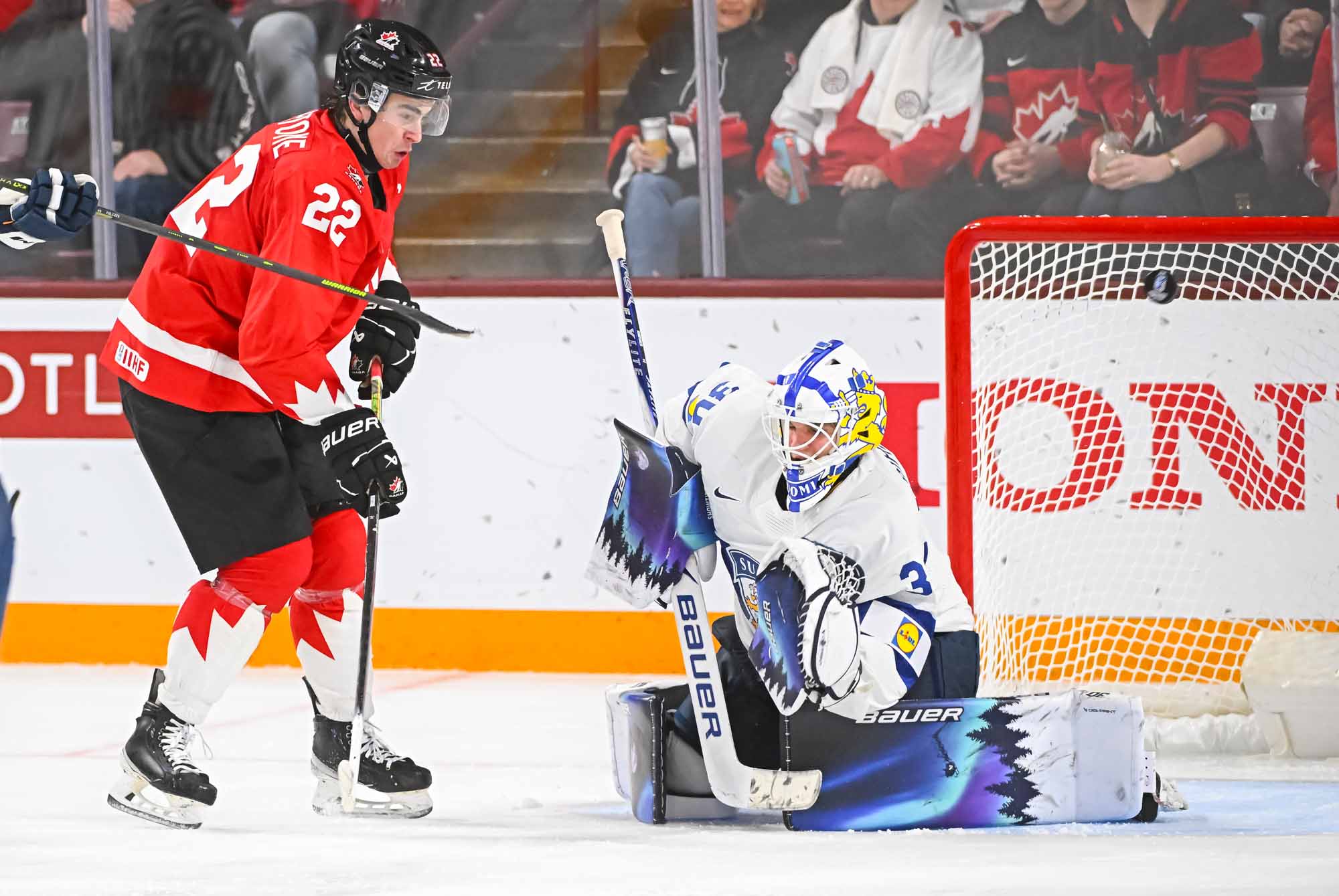 It felt hard to believe that this was a showdown between Finland’s Petteri Rimpinen – last year’s Best Goalie en route to the silver medal – and Canada’s Carter George, who led the 2025 tournament with two shutouts. Why? The game started off with virtually every shot going in. It was relentless goal-trading.