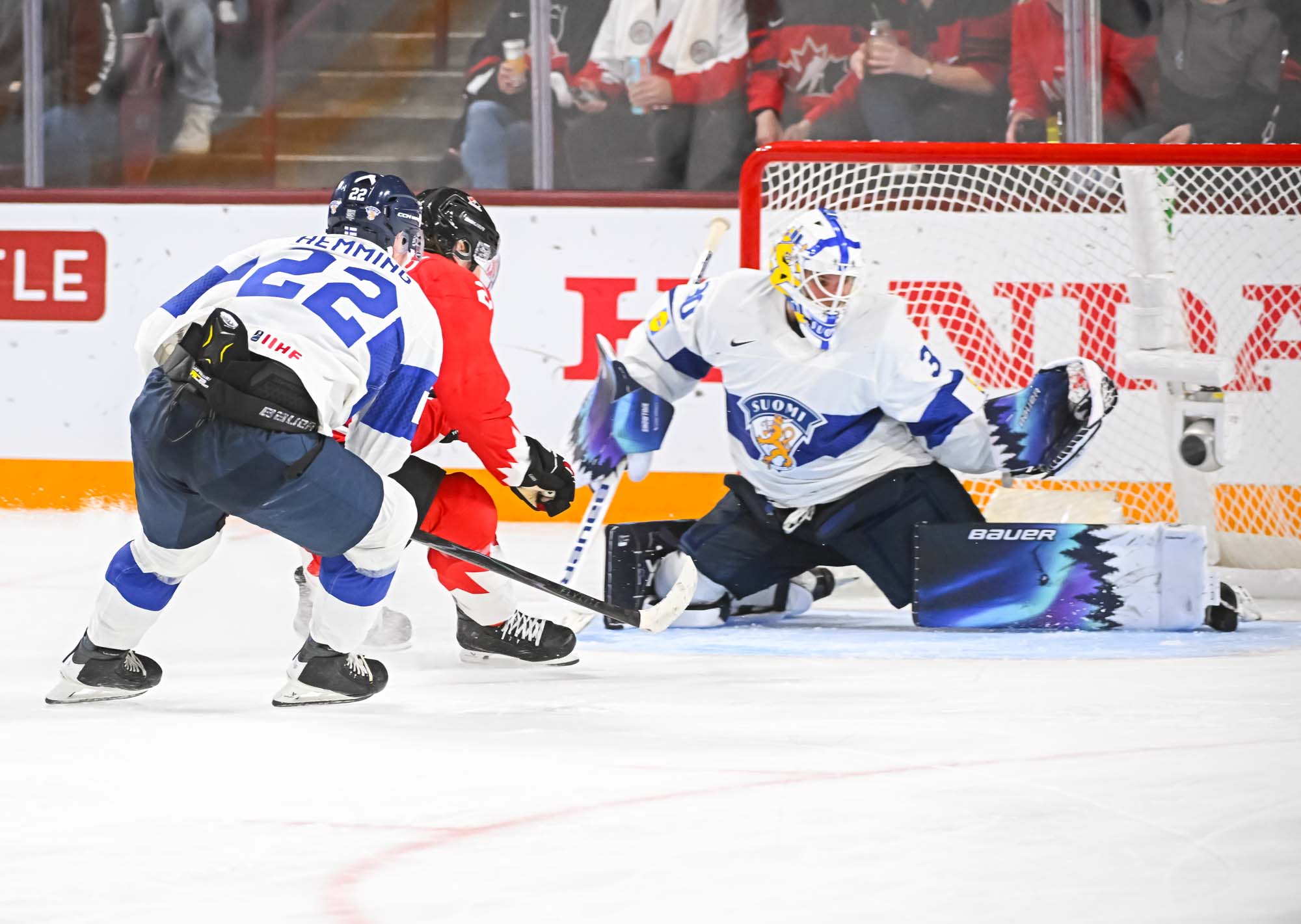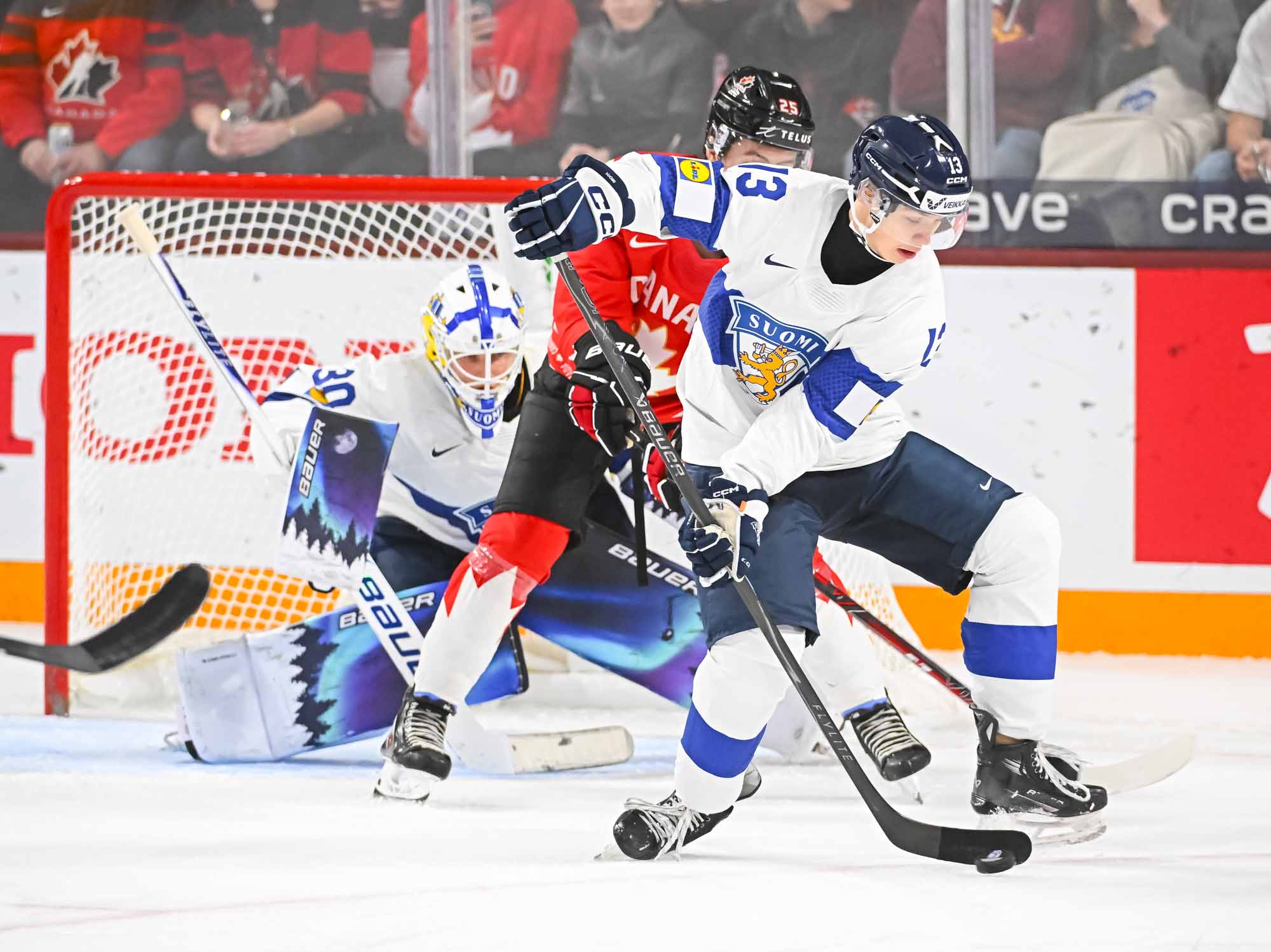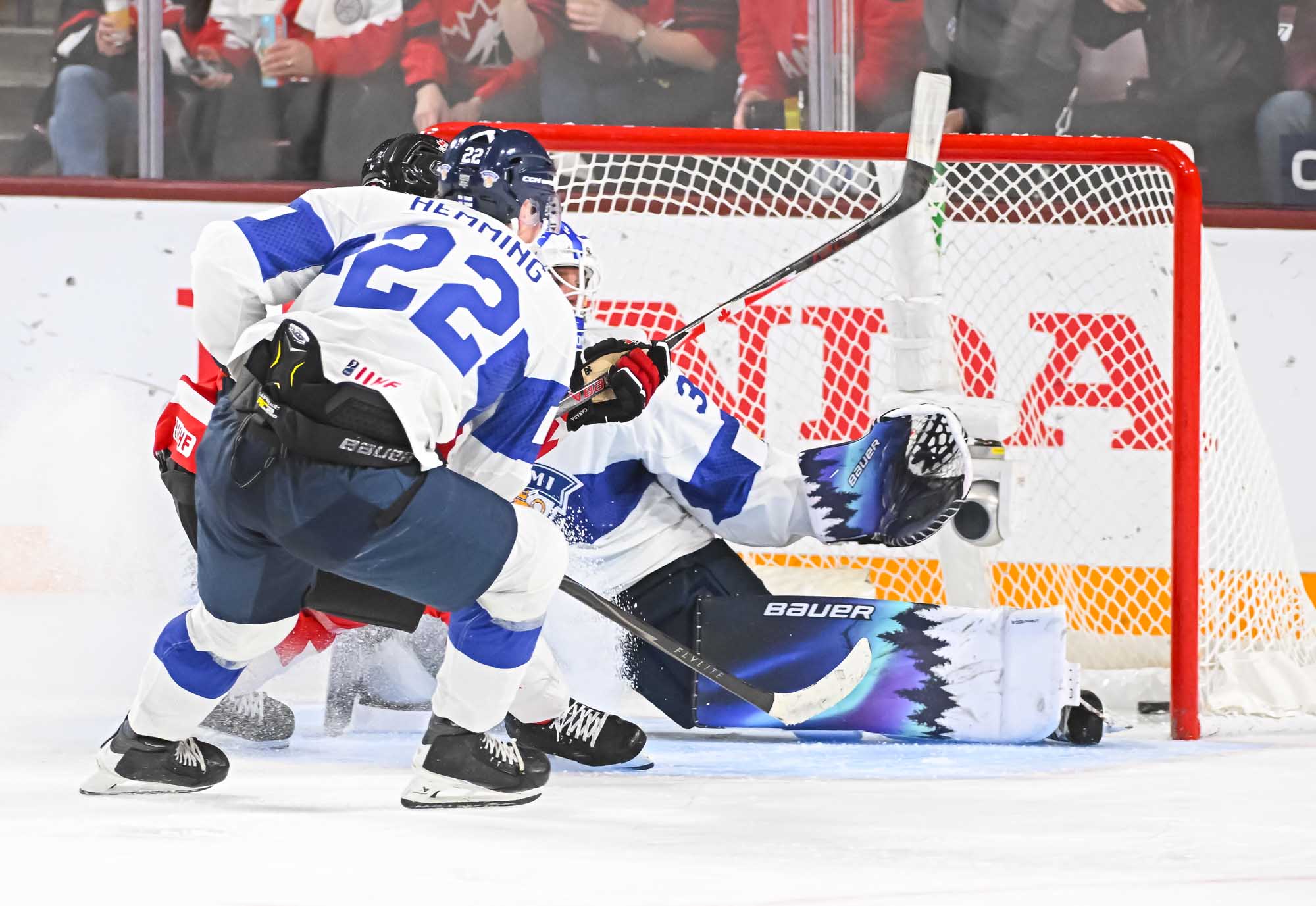 It felt hard to believe that this was a showdown between Finland’s Petteri Rimpinen – last year’s Best Goalie en route to the silver medal – and Canada’s Carter George, who led the 2025 tournament with two shutouts. Why? The game started off with virtually every shot going in. It was relentless goal-trading.