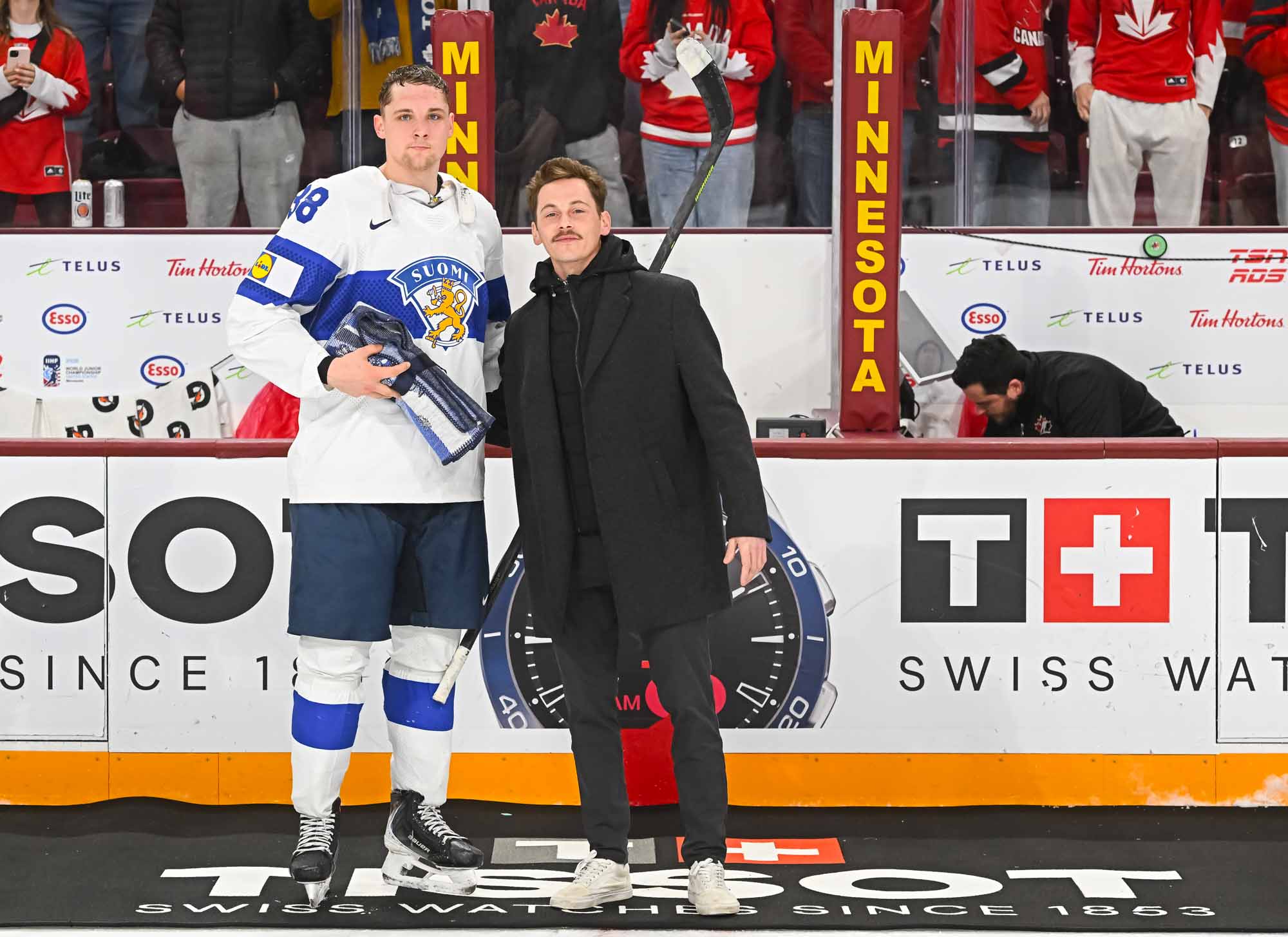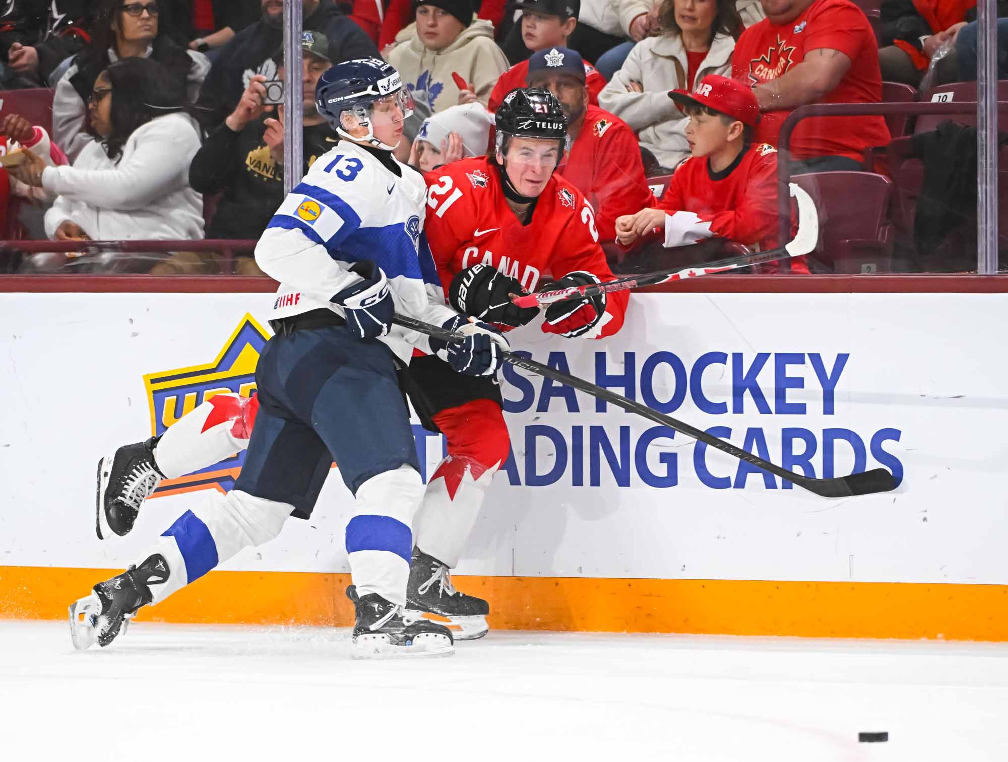 Finnish forward Onni Kalto was sent off for a big hit on the end boards that left defenceman Ben Danford shaken up. The Canadian power play took just 12 seconds to cash in. Hage slid it on net and Martin was there on the doorstep to convert at 10:40.