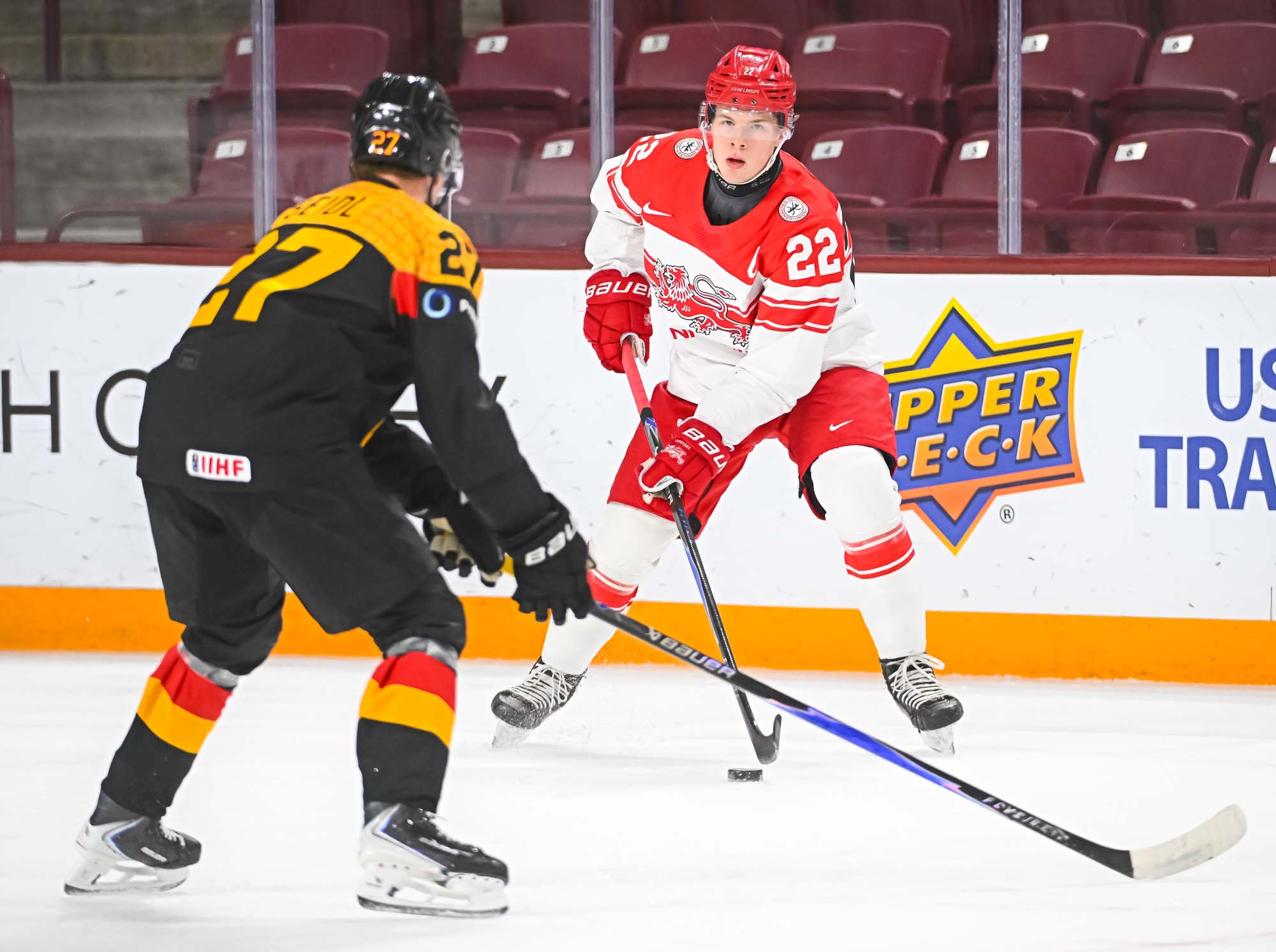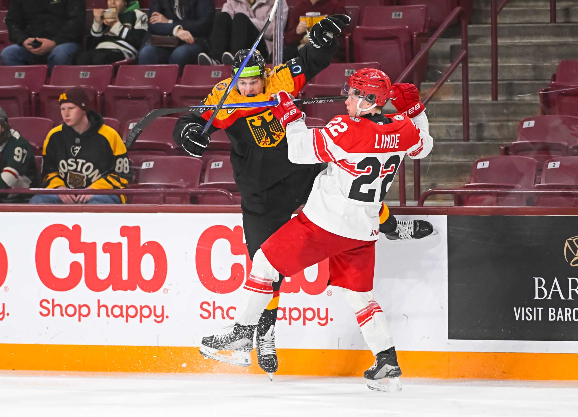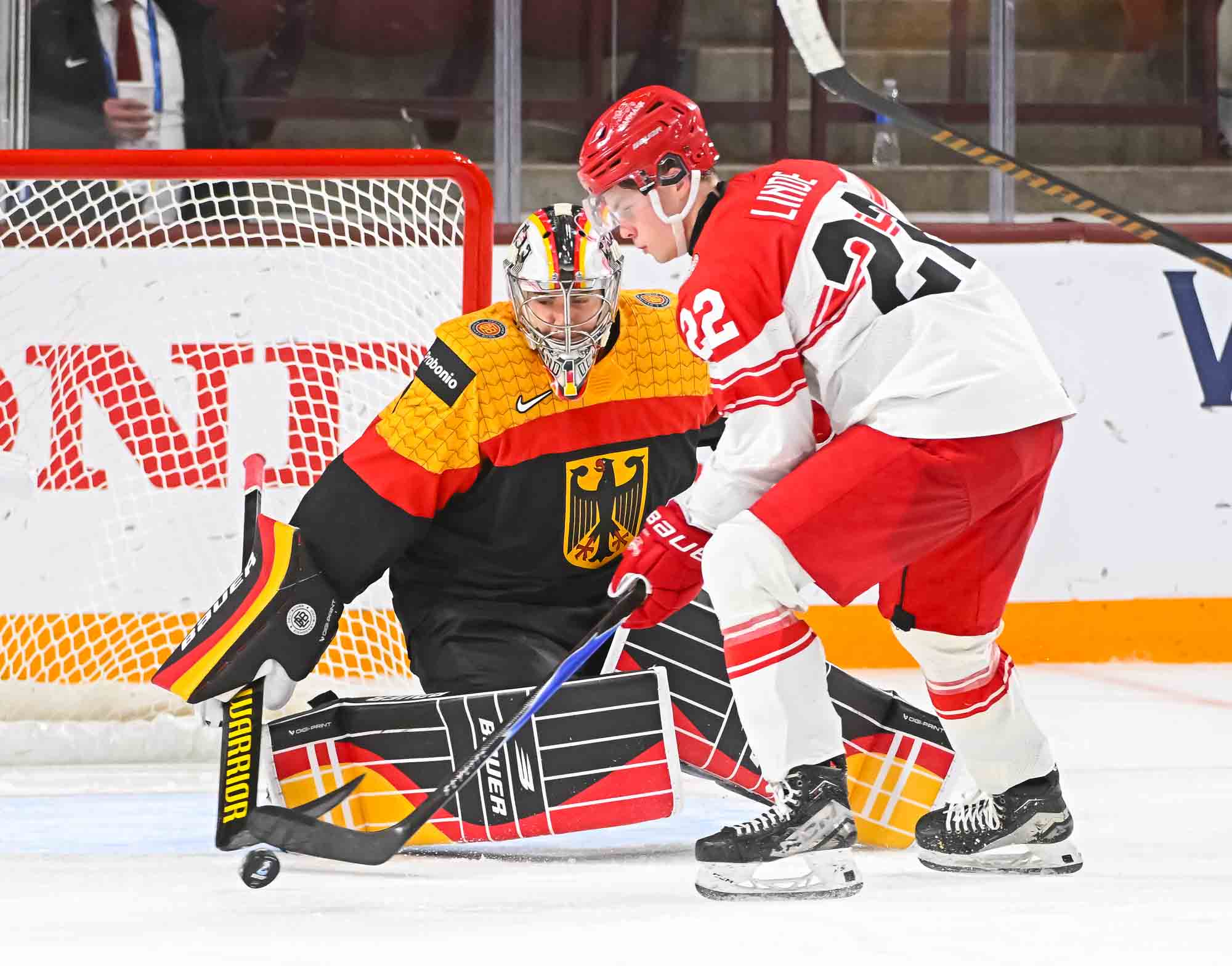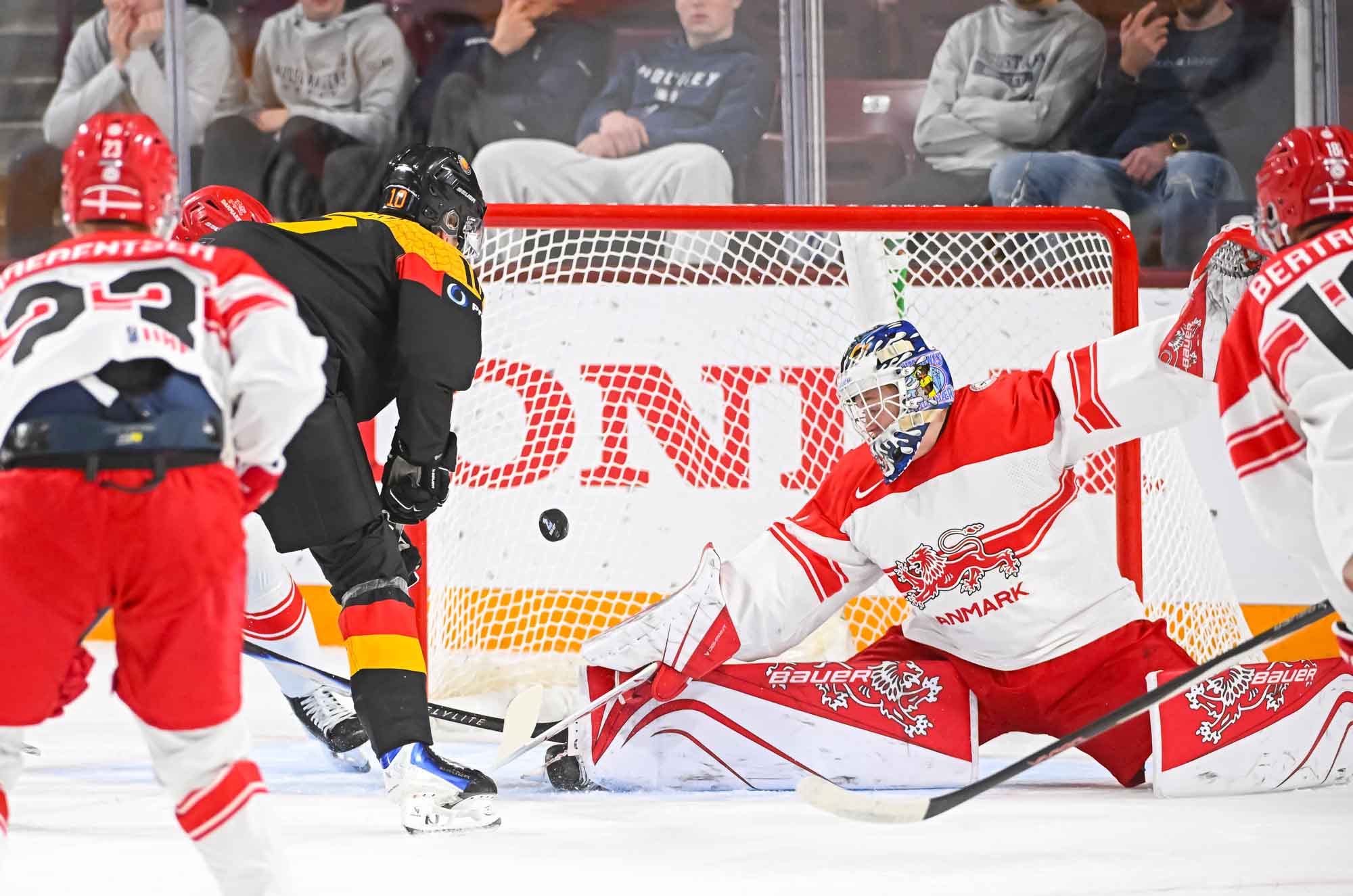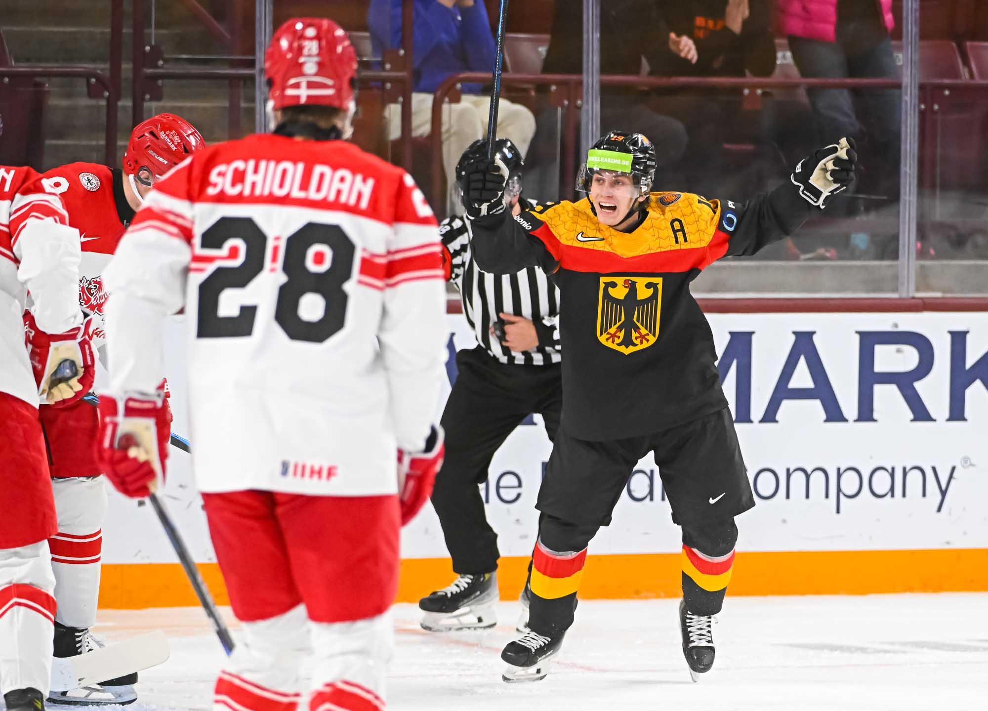 Schams got his second of the night off a long shot that fooled Wilde, but Anton Linde got one back for the Danes a minute later. He took a pass from Martinus Schioldan and made no mistake from in close. However, another penalty and another power-play goal for the Germans put the game out of reach once and for all when Lenny Boos made it 7-4 with a short-side shot.
