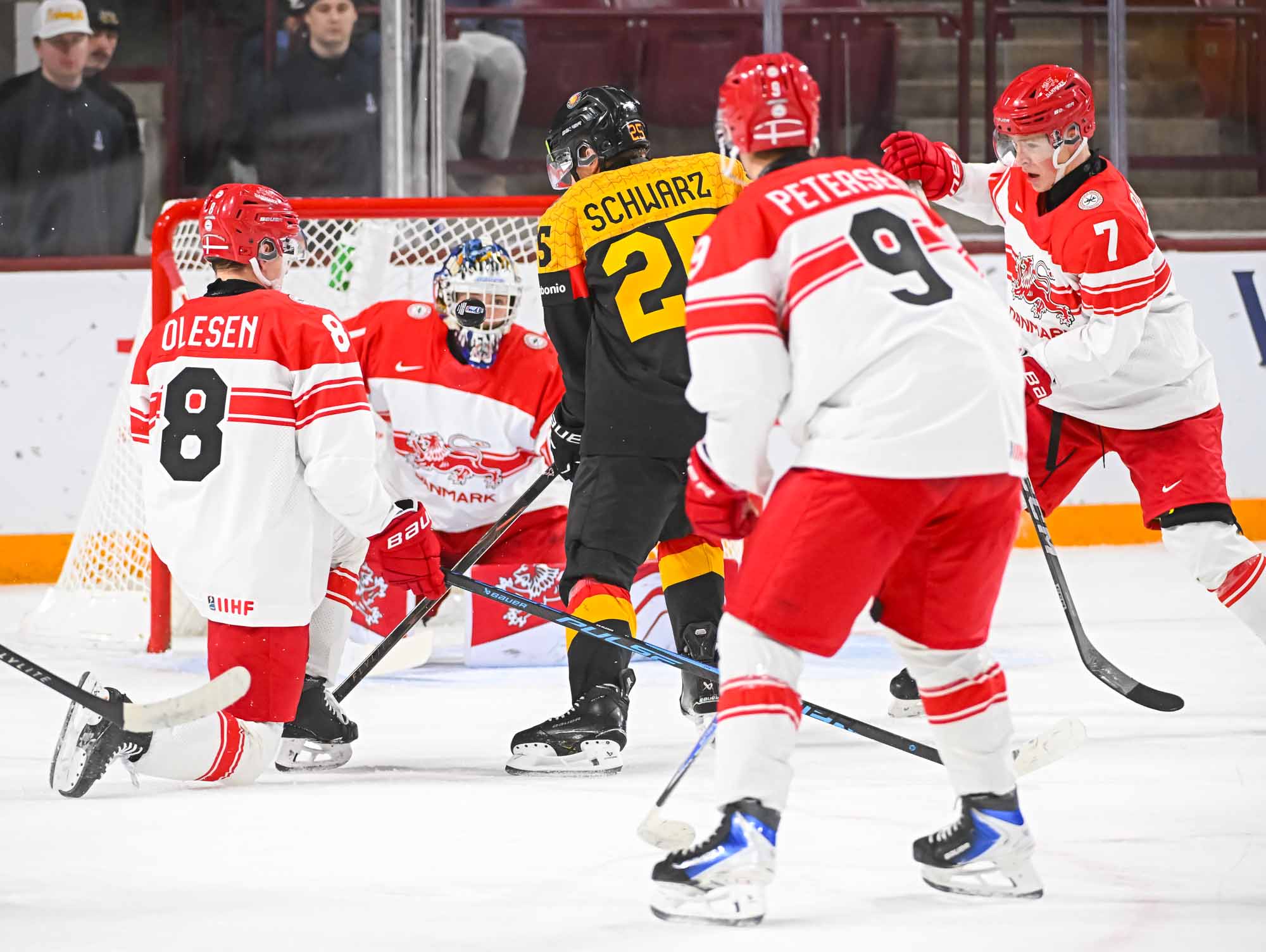 The Germans took control early in the second and looked to put the game out of reach with two quick goals. Schams tried to find a man in front with a pass, but the puck went off the skate of Danish defender Jesper Olsen and beyond the reach of a frustrated Anton Wilde in goal.