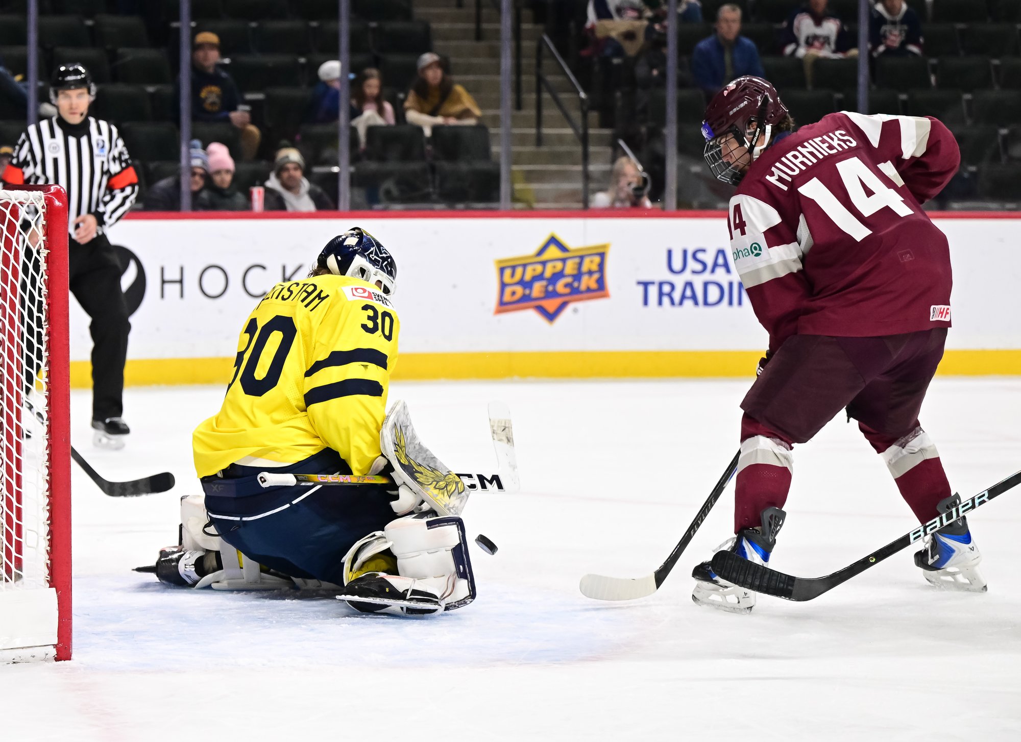 Sweden outshot Latvia 38-16. Swedish coach Magnus Havelid gave the nod to starter Love Harenstam in net, while Abols went with Nils Maurins.