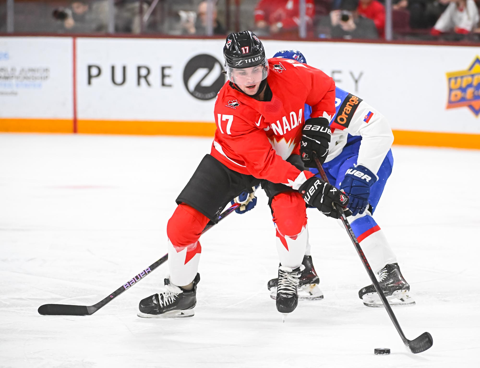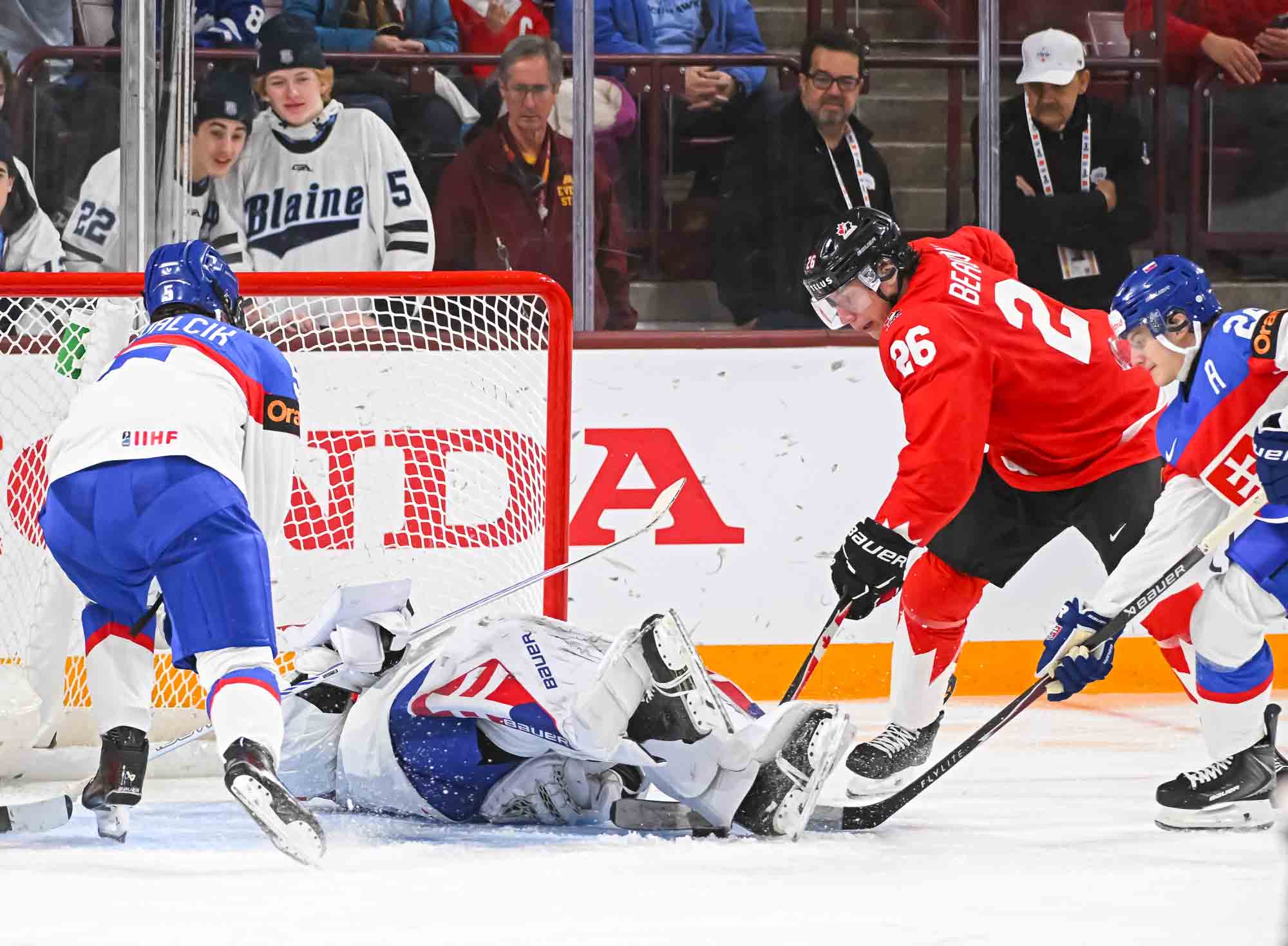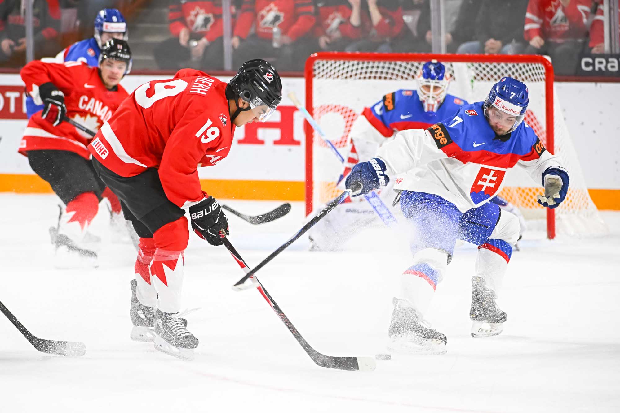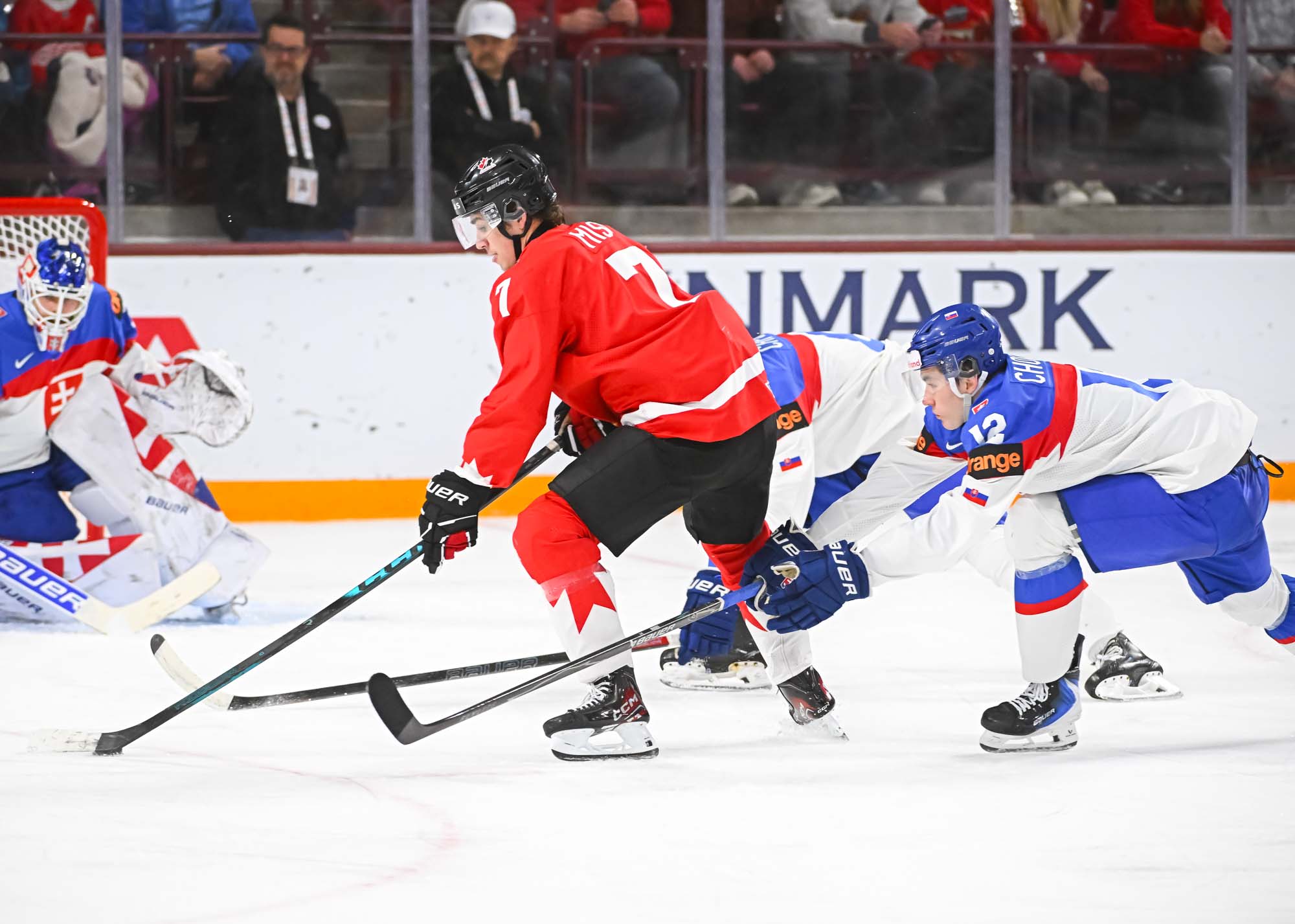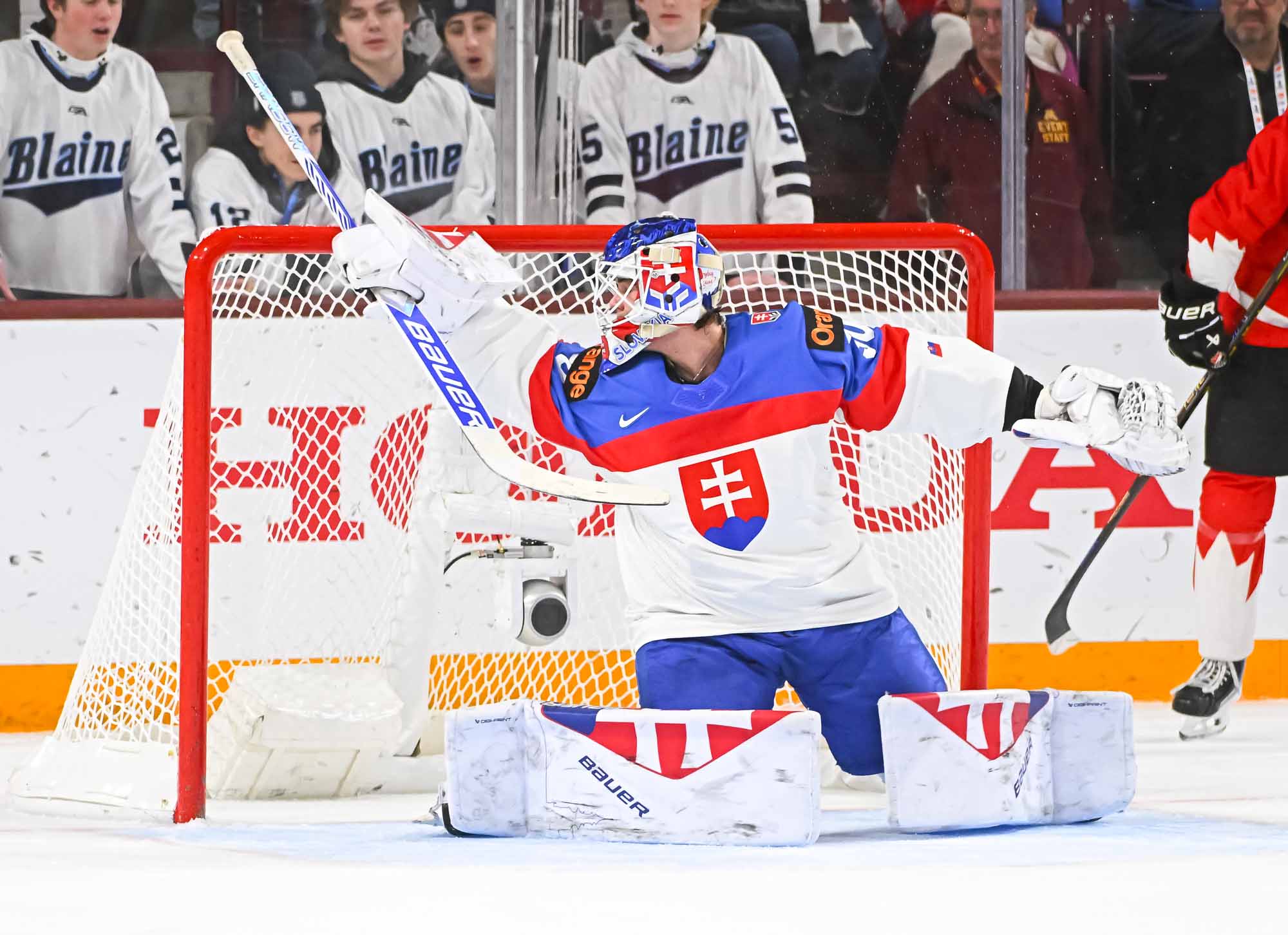 Slovakia didn’t register a shot until halfway through the first period, but it wasn’t until after this that Canada opened the floodgates. It all started at 13:58 when goalie Michal Pradel couldn’t handle a Keaton Verhoeff shot. Reschny was right there to knock in the loose puck.
