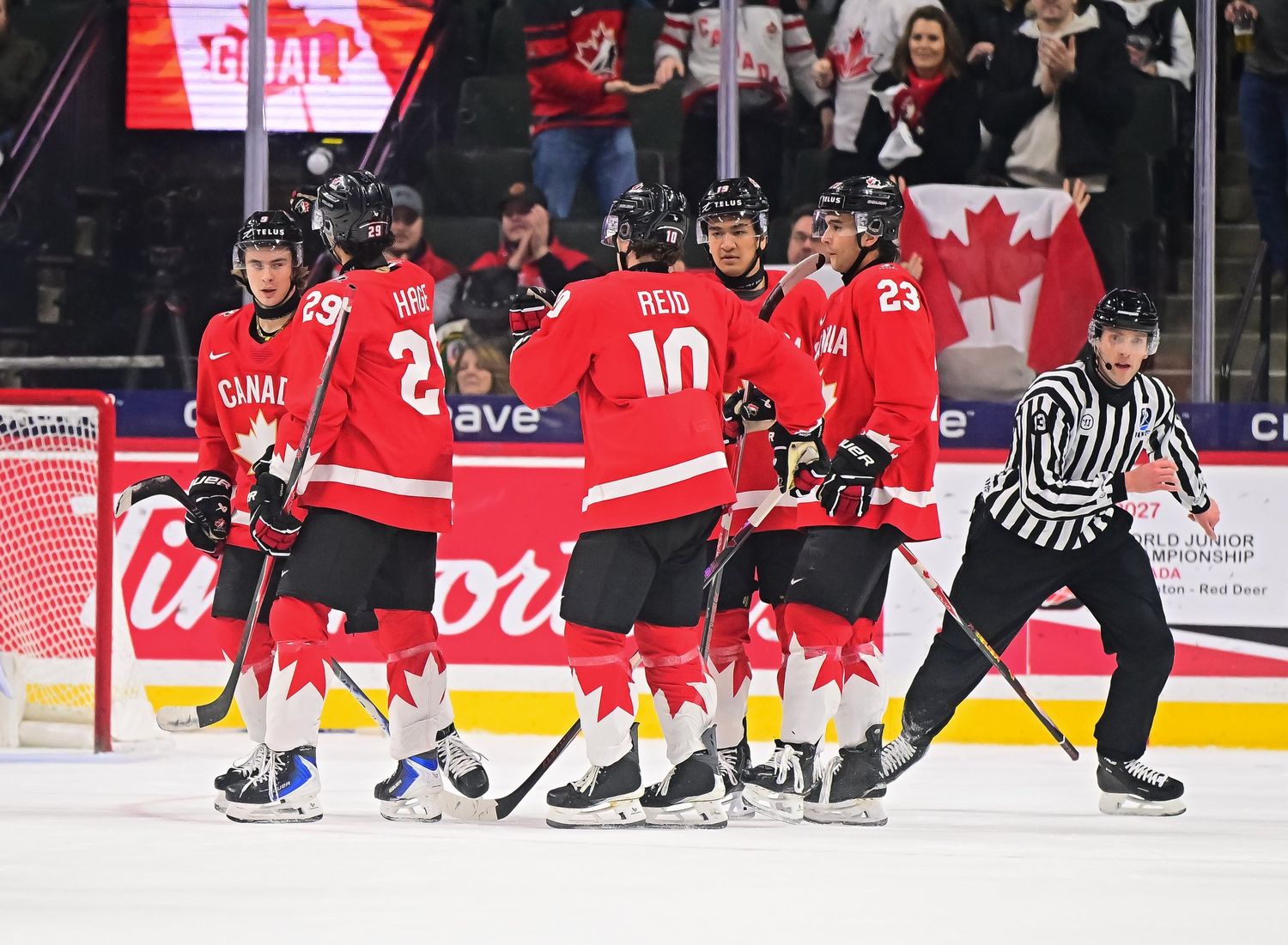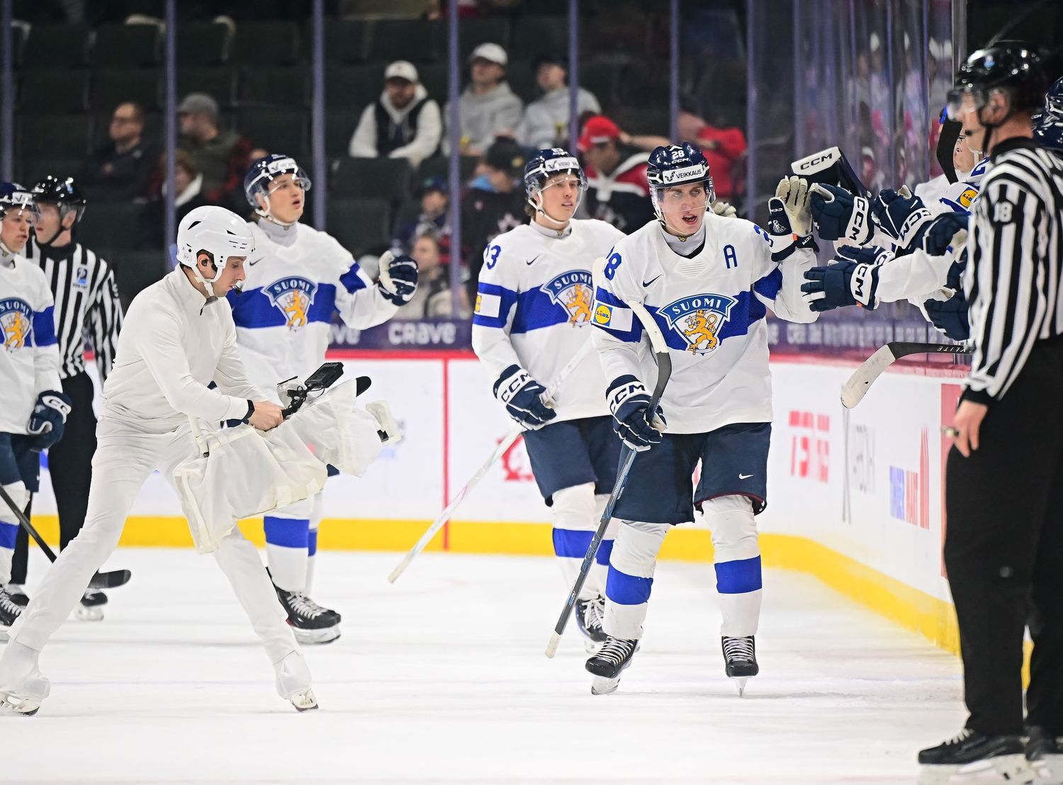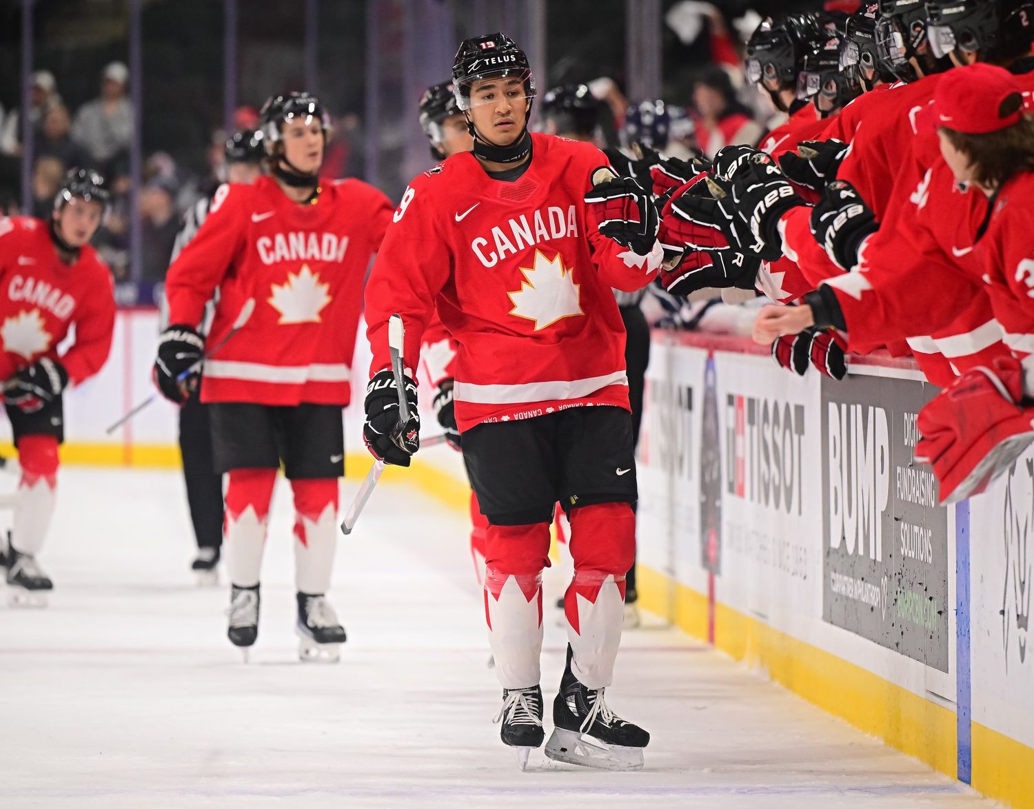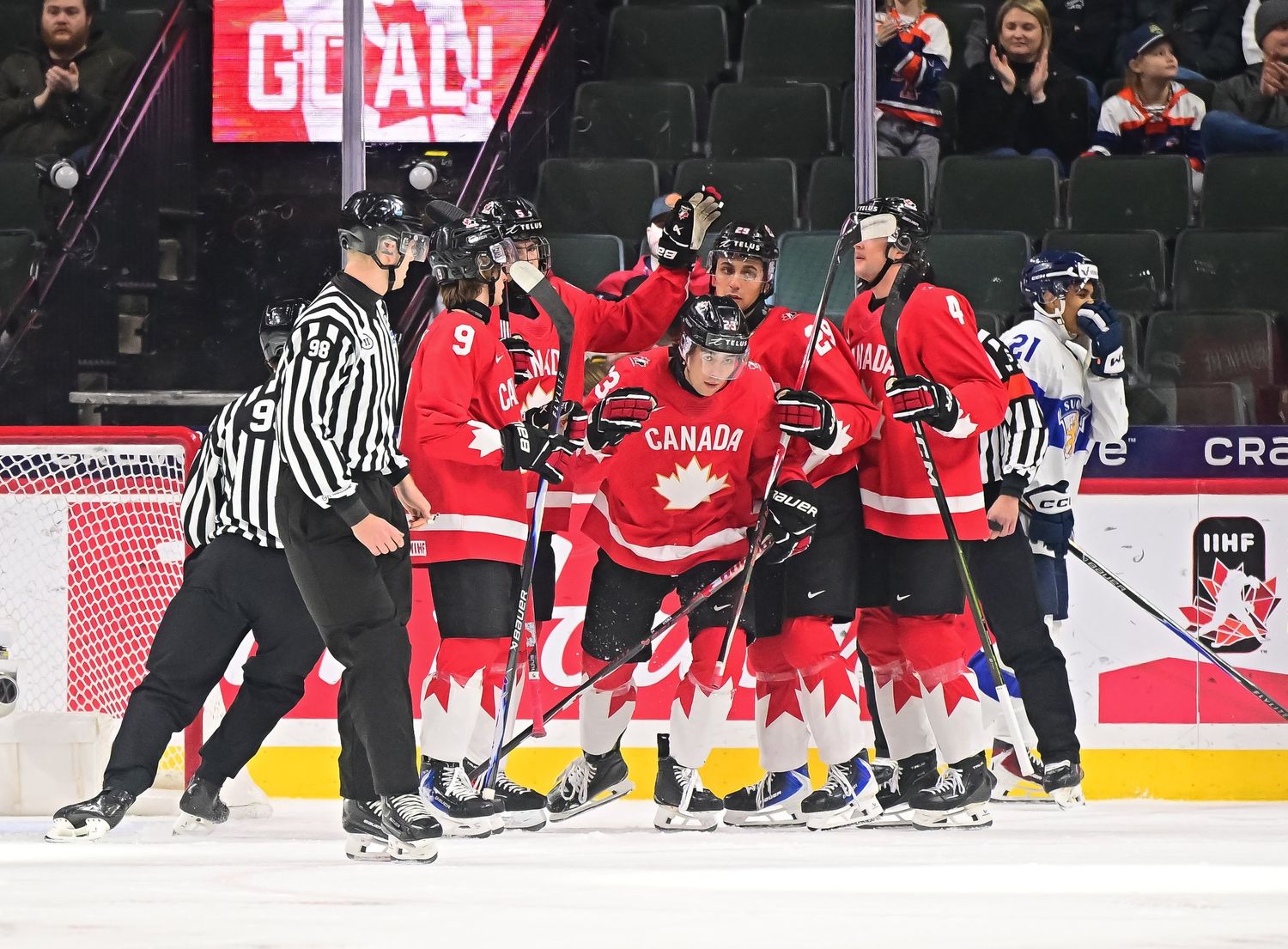 Canada's Sam O'Reilly (#23, centre) accepts congratulations from his teammates after scoring the first goal in a 6-3 bronze medal victory over Finland at the 2026 World Juniors.