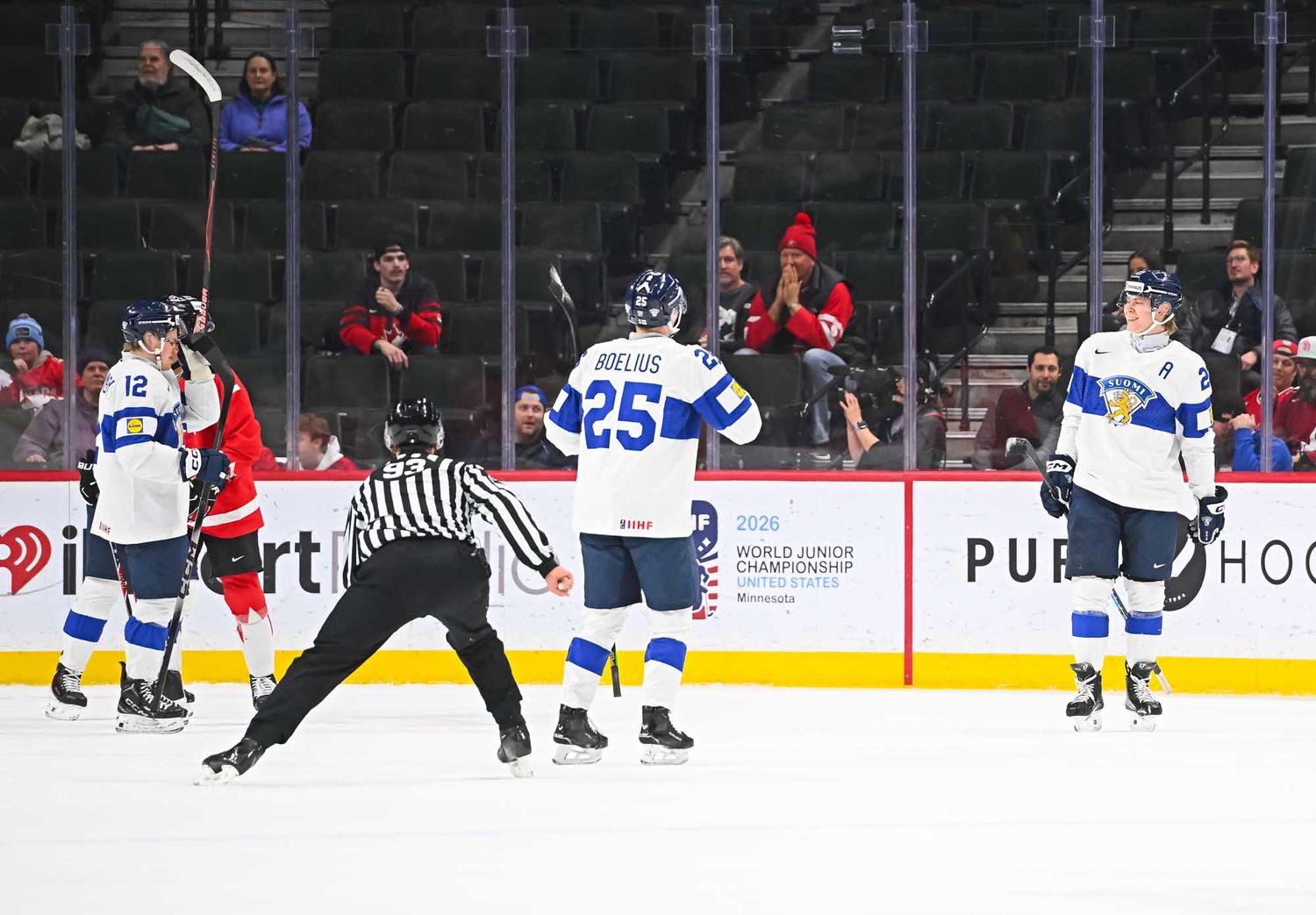At 11:58, Miettinen’s one-timer from the right faceoff circle, set up by Lasse Boelius, knotted the score again on Finland’s first power play.