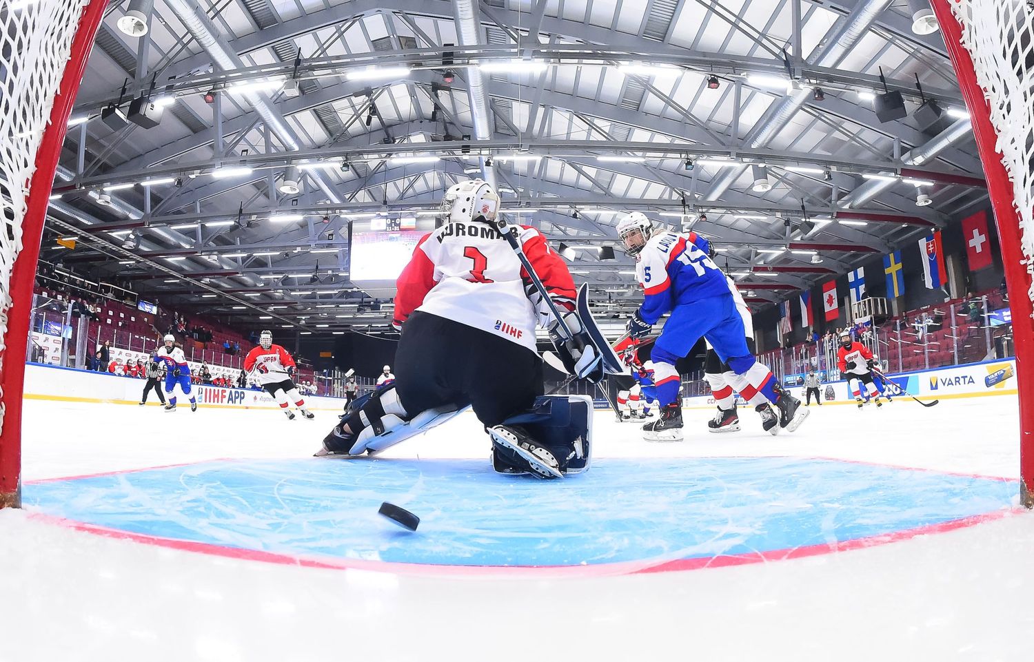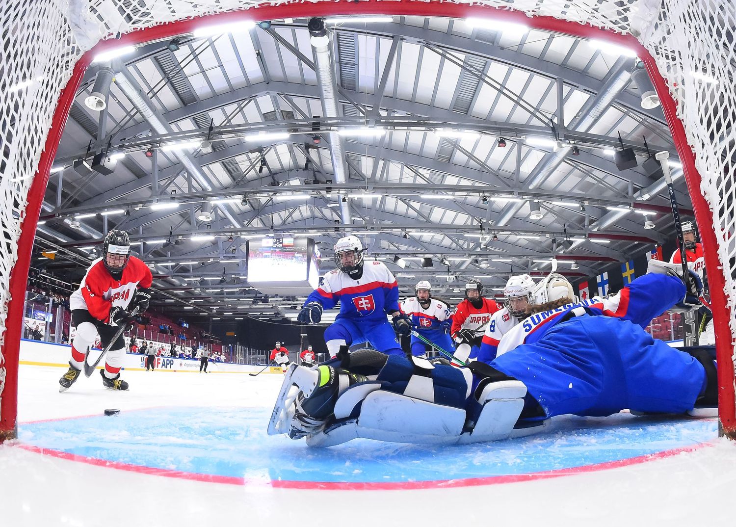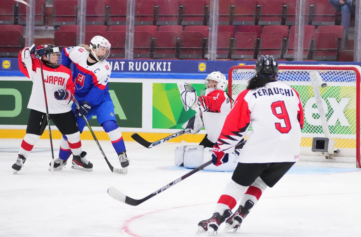 Ensimmäinen erä oli kahden jakson tarina. Japani aloitti vahvasti ja loi ylivoimansa turvin muutaman maalipaikan, mutta Sumeghová kesti maalillaan. Ajassa 8:30 Michaela Letási löysi siniviivalta Liana Tomastíkovan, jonka laukaus yllätti Kuromarun ja vei Slovakian tärkeään 1–0-johtoon.