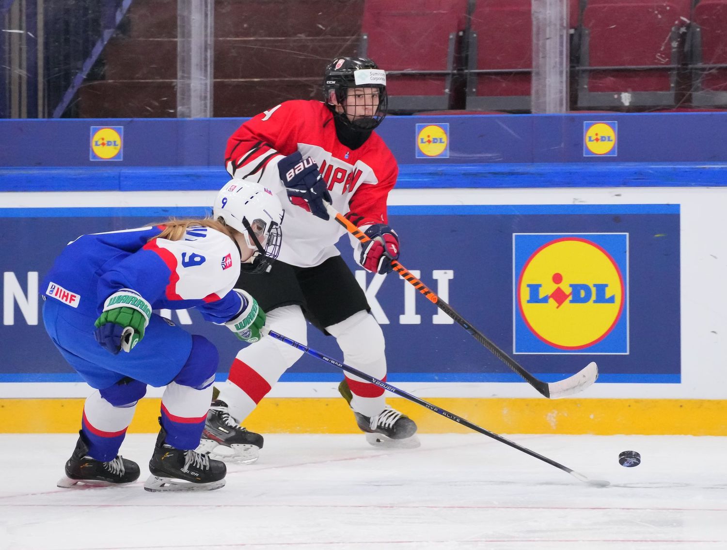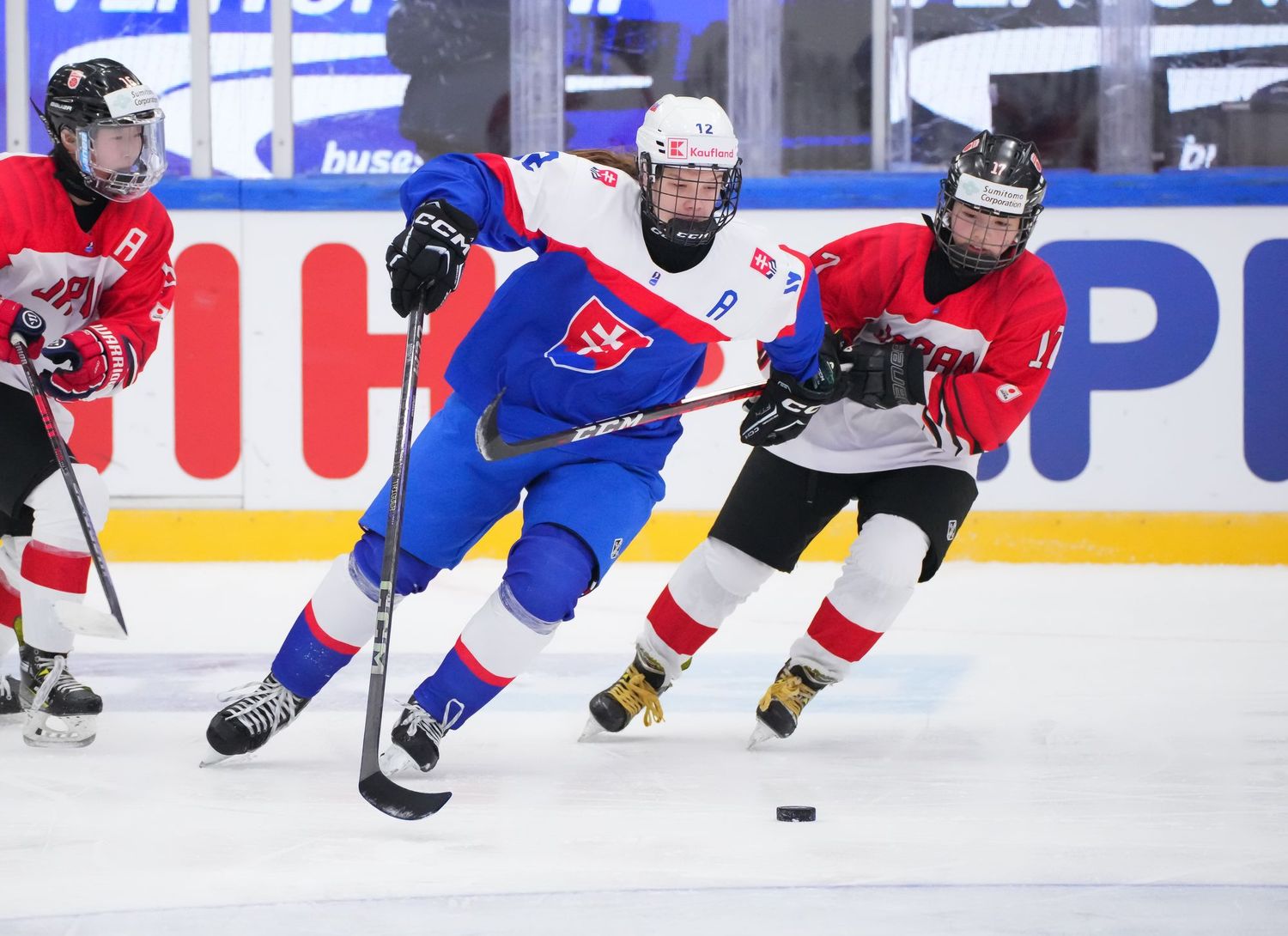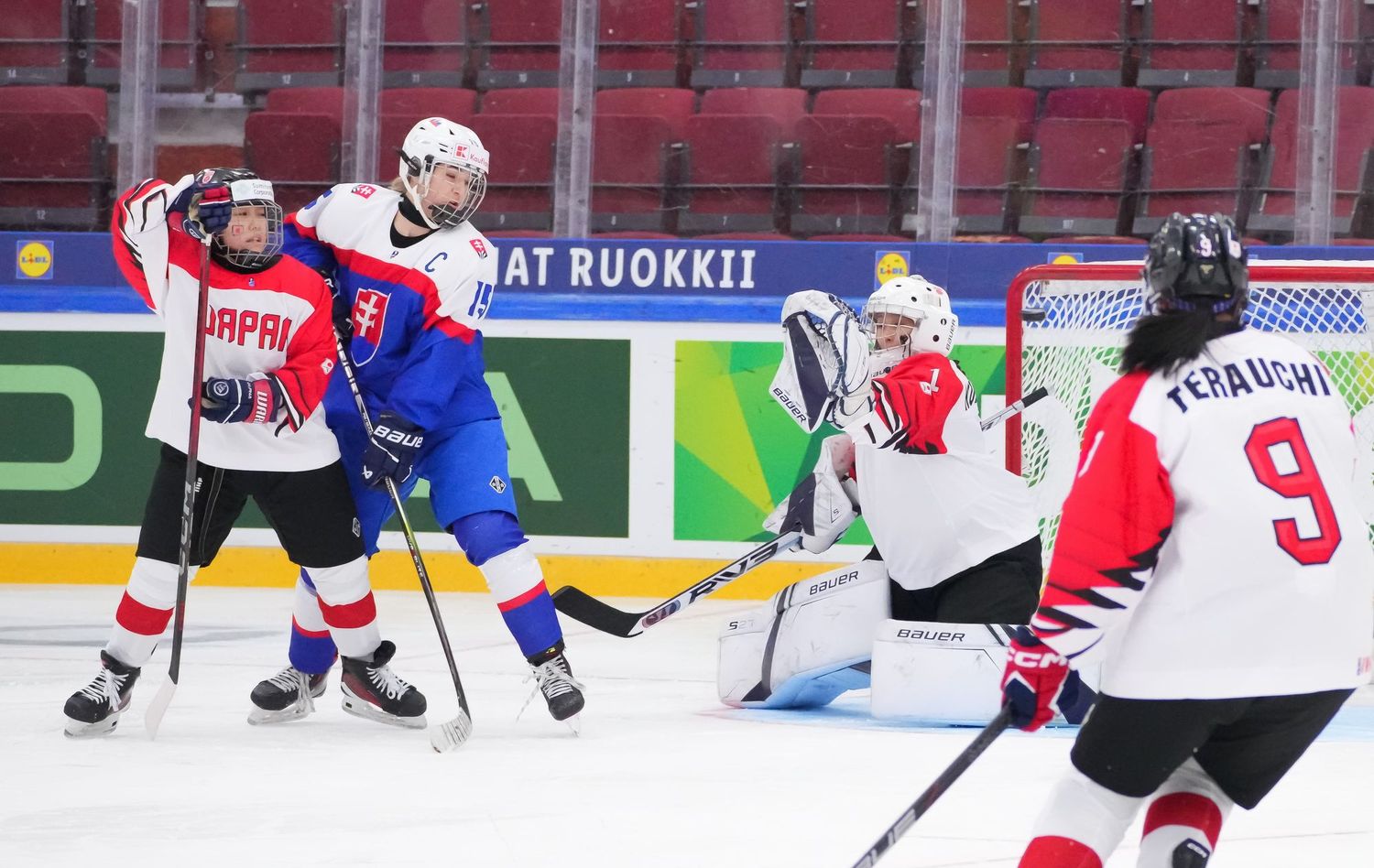Ensimmäinen erä oli kahden jakson tarina. Japani aloitti vahvasti ja loi ylivoimansa turvin muutaman maalipaikan, mutta Sumeghová kesti maalillaan. Ajassa 8:30 Michaela Letási löysi siniviivalta Liana Tomastíkovan, jonka laukaus yllätti Kuromarun ja vei Slovakian tärkeään 1–0-johtoon.